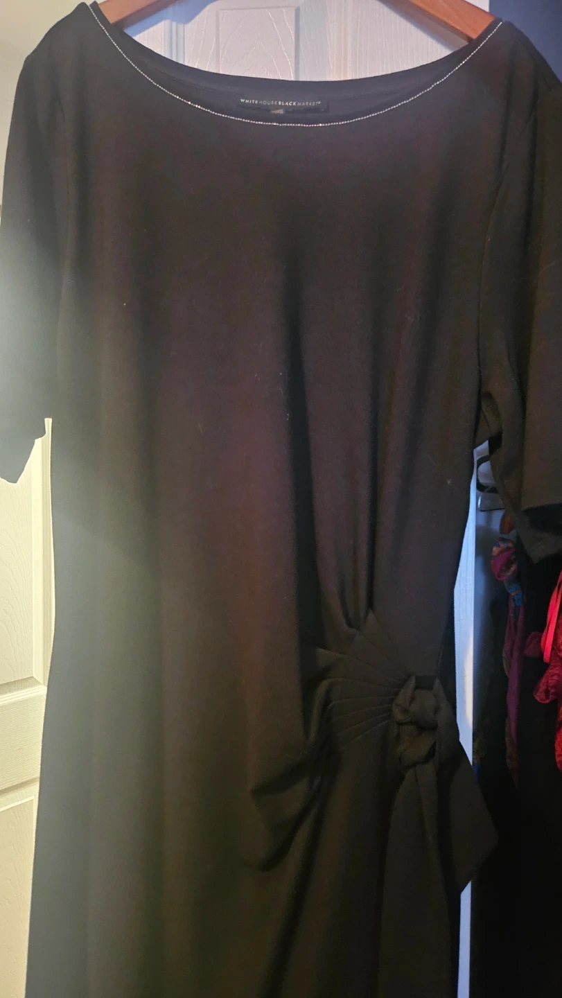 Selling a never used black dress from White House Black Market. It features a stylish design with a ruched detail on the side. Perfect for various occasions!