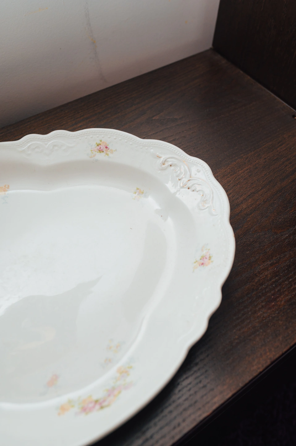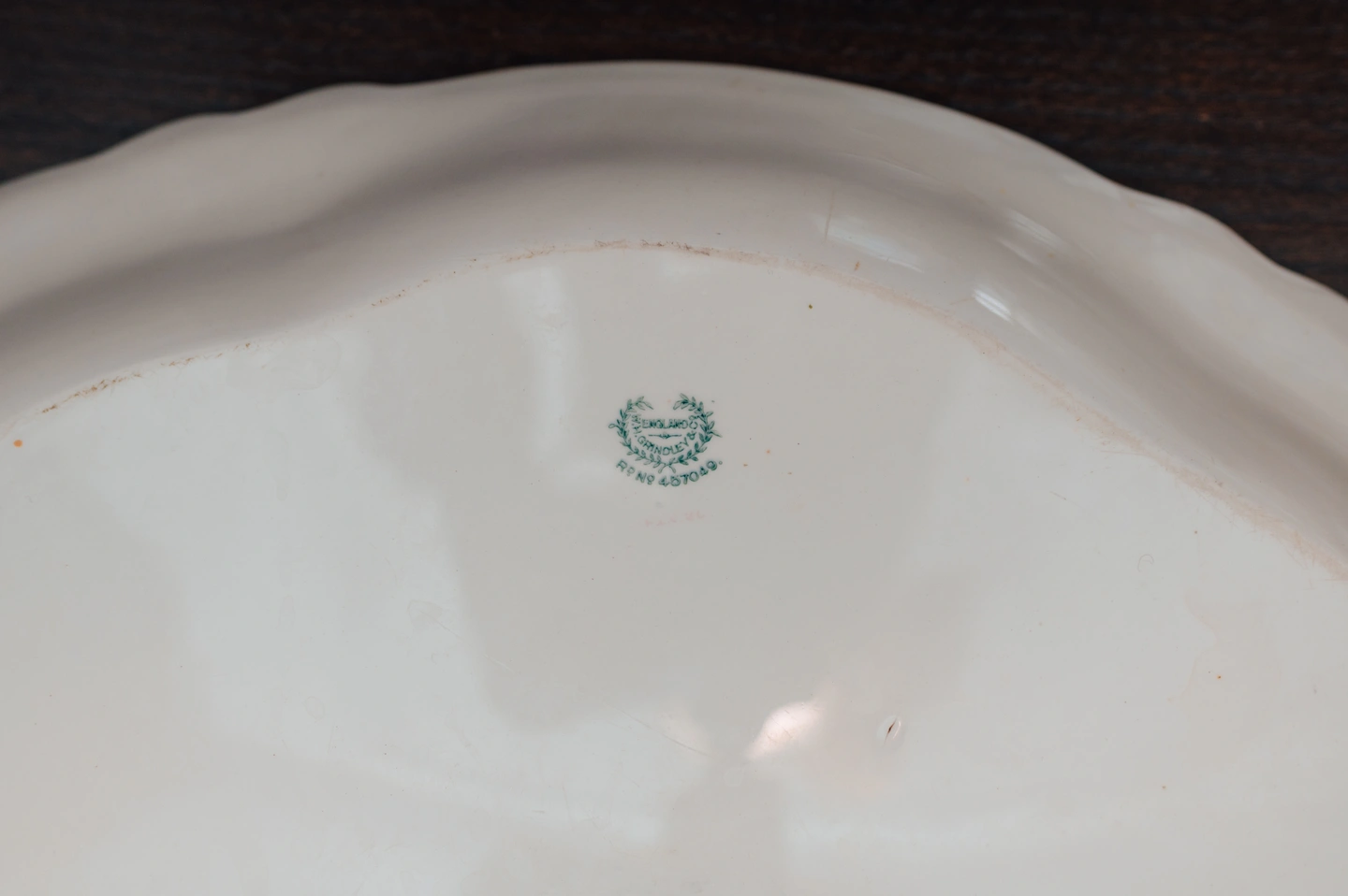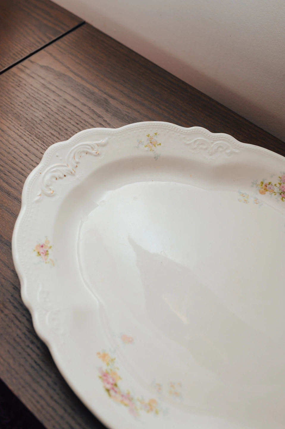Beautiful vintage oval serving platter with delicate floral detailing and an elegant scalloped edge. Made in England, likely by Grindley, with classic cottage-style charm.