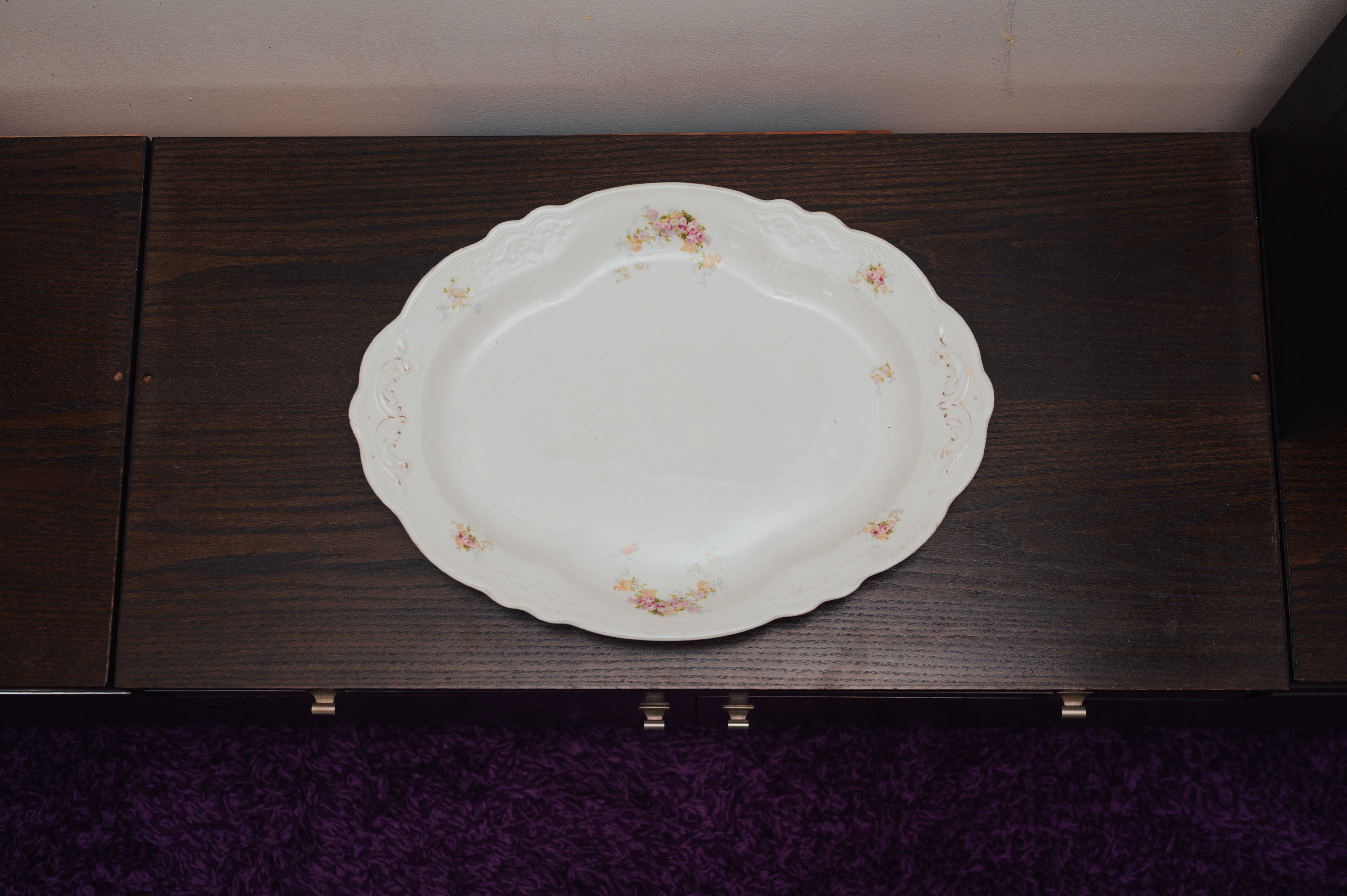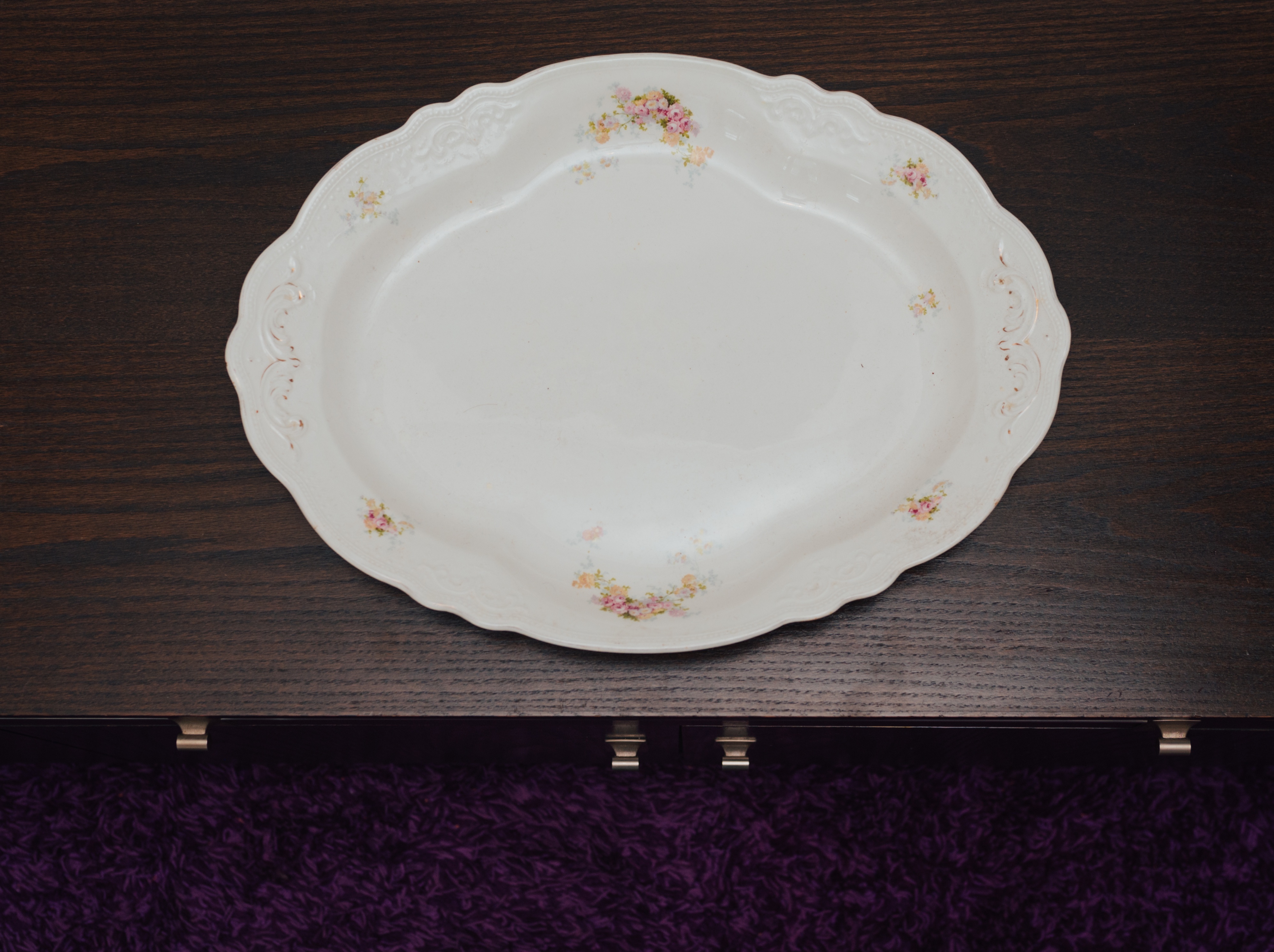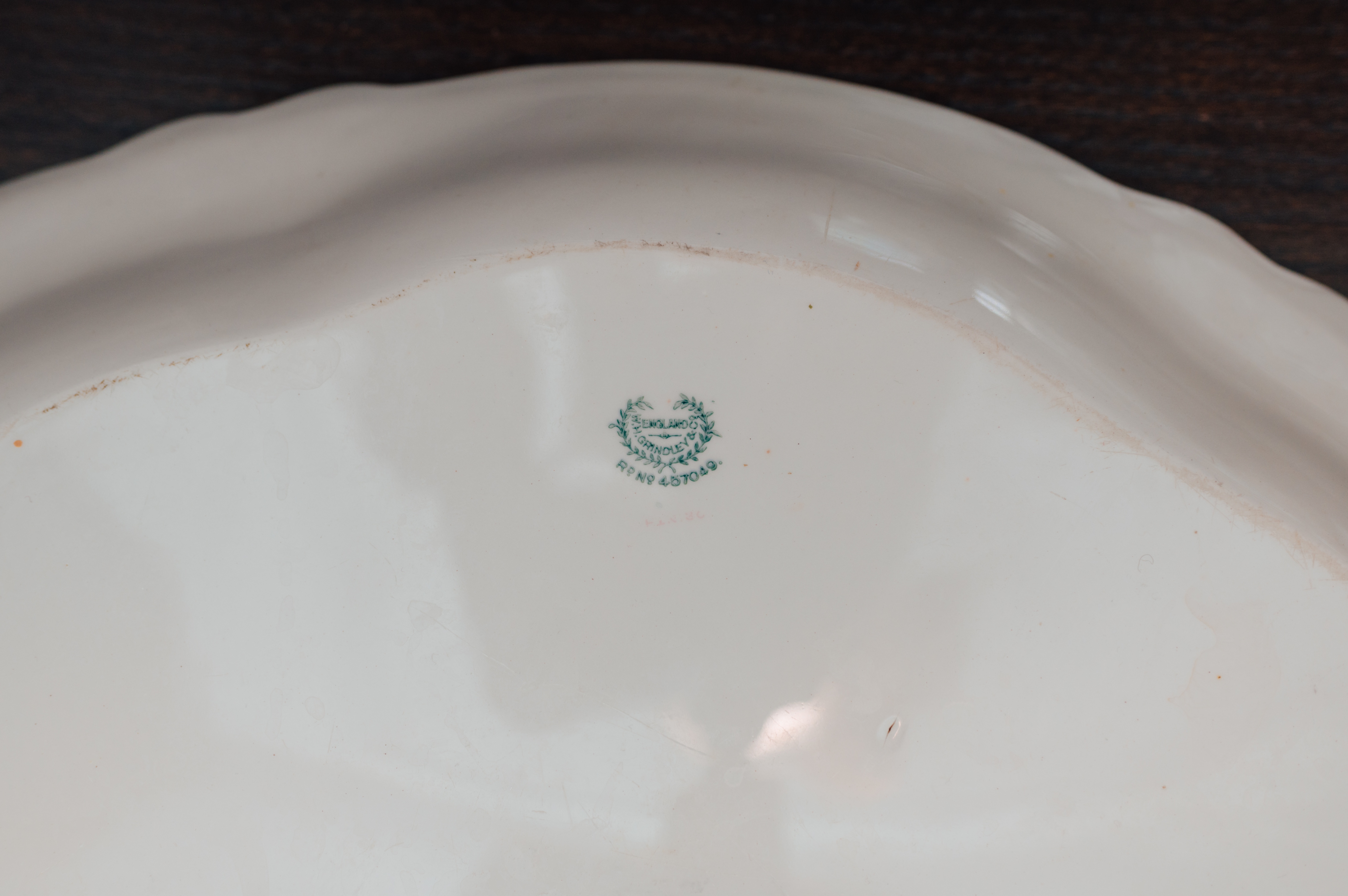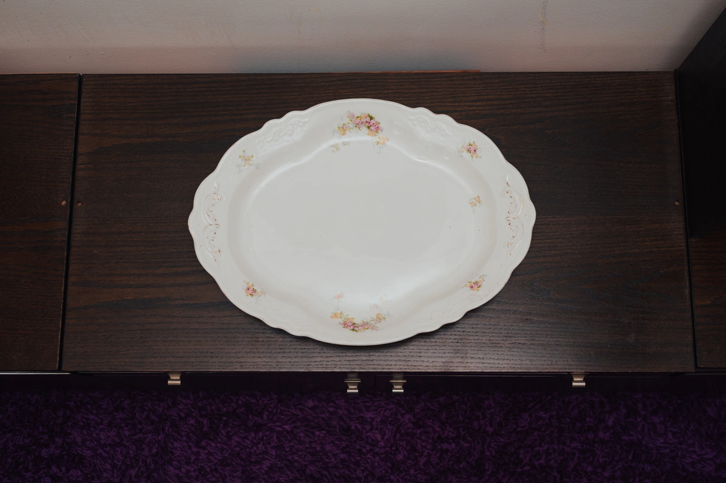 Beautiful vintage oval serving platter with delicate floral detailing and an elegant scalloped edge. Made in England, likely by Grindley, with classic cottage-style charm.