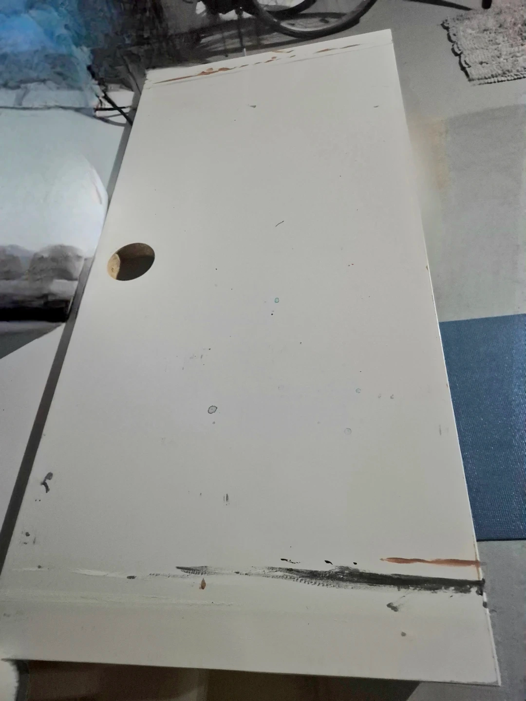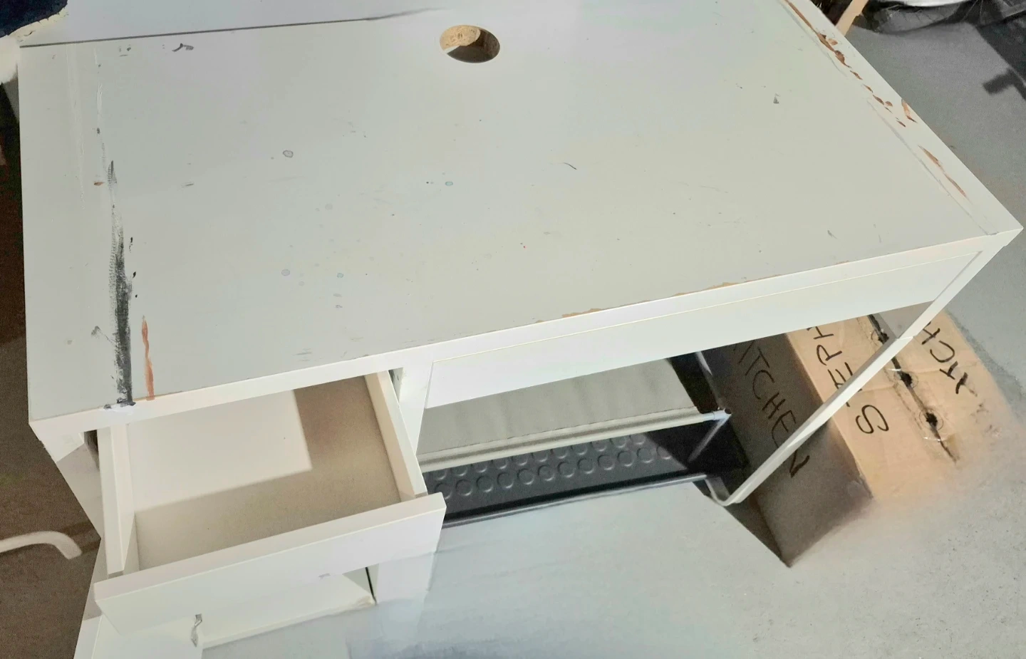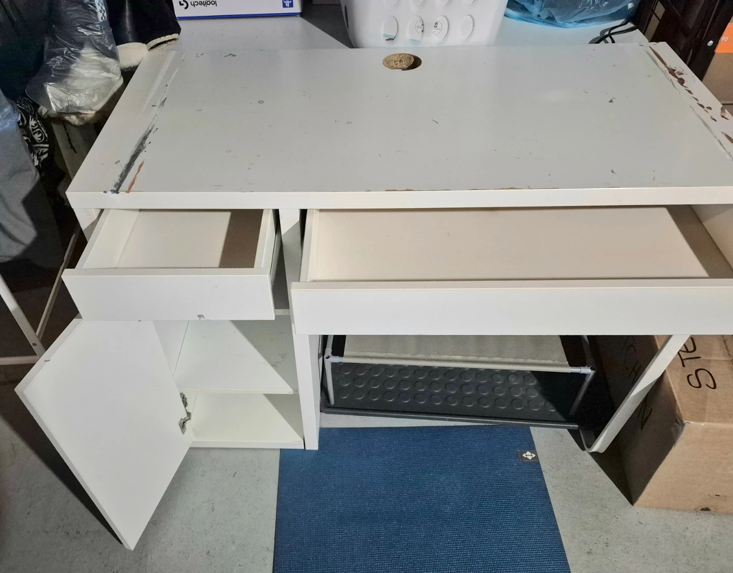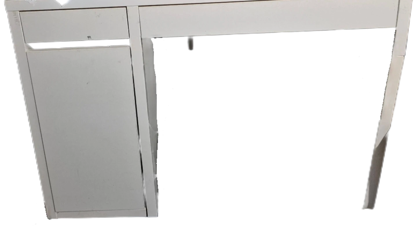 Selling a white desk with built-in storage. It has some wear and tear (paint & scratches), as shown in the photos, but it's still functional and sturdy. Great for a home office or student! You can be creative with covering the surface of the desk.