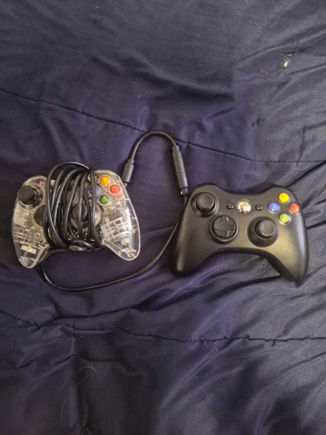Selling two Xbox 360 controllers! One is black and the other is a cool clear version. Both are used but still works, The black just needs new AA Batteries