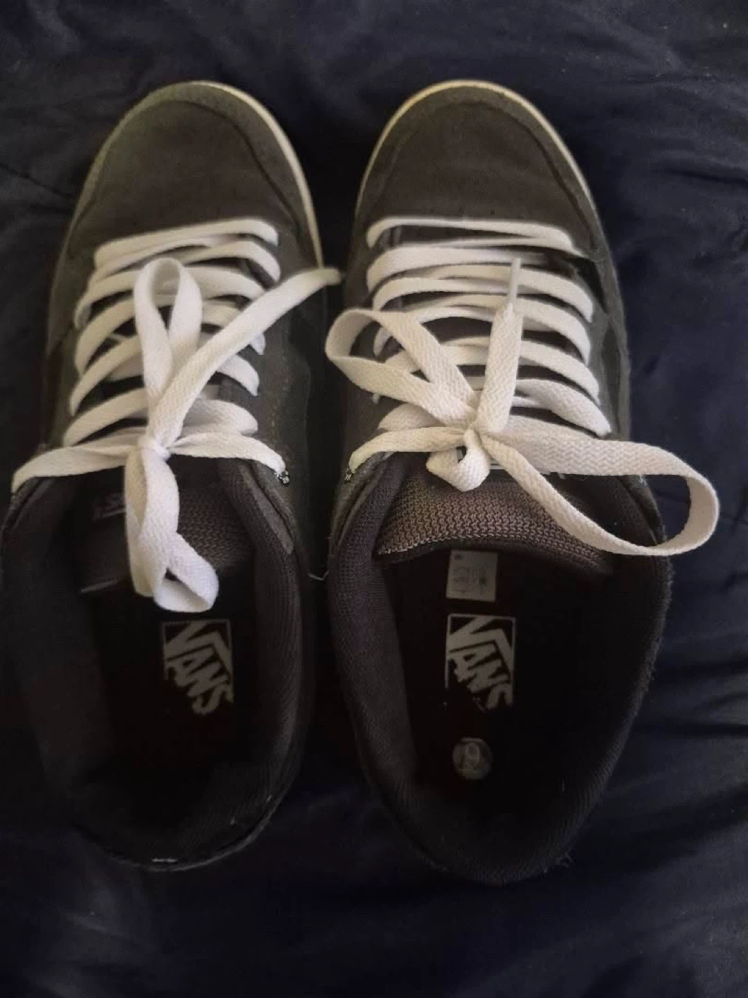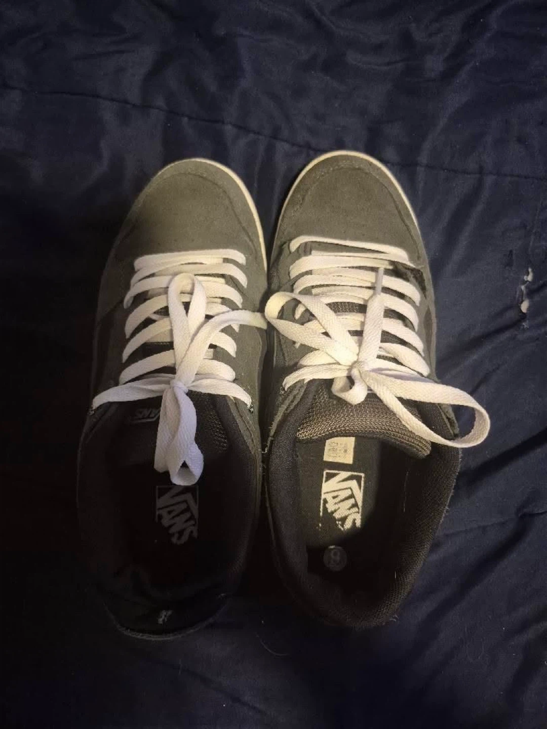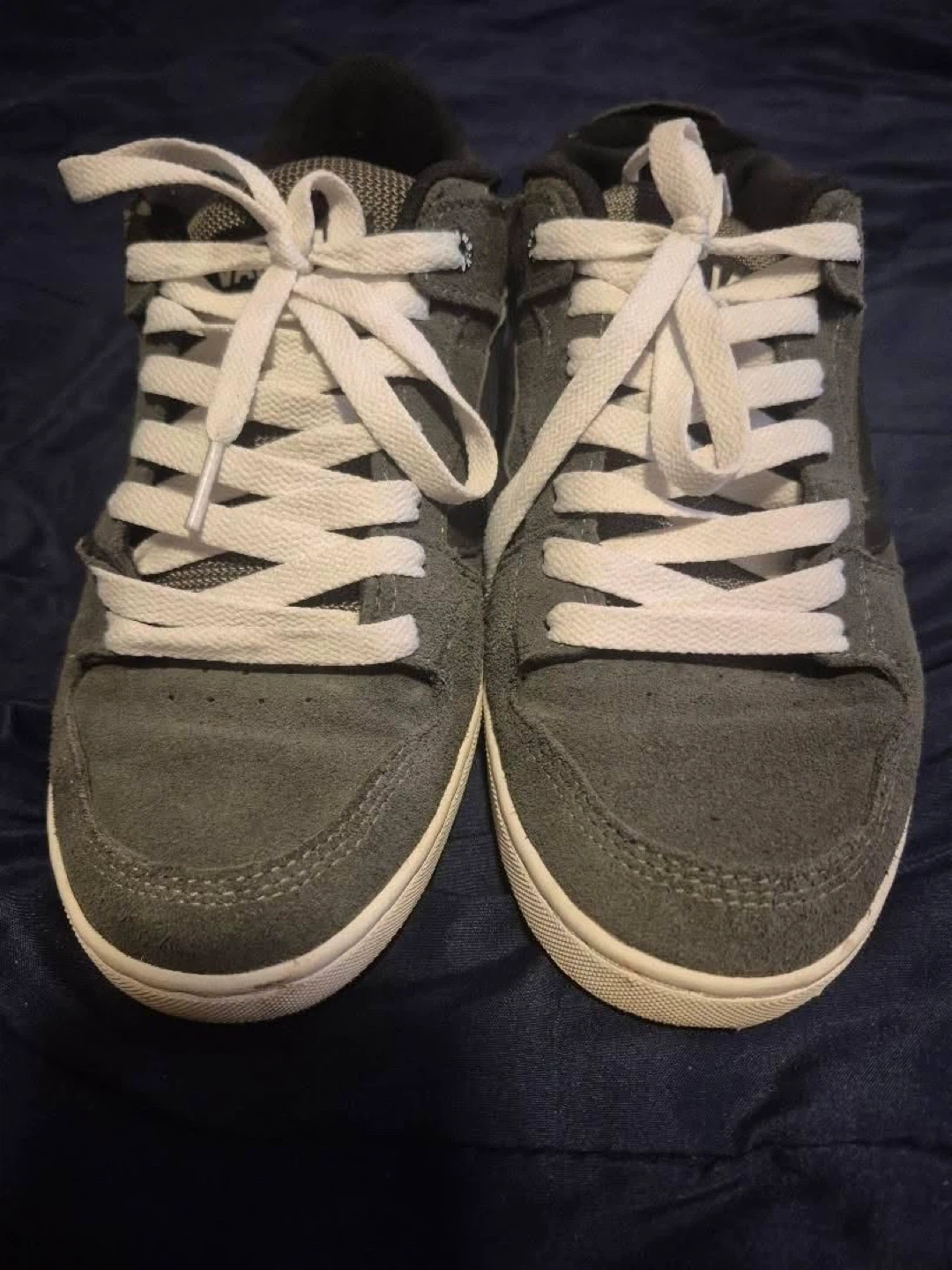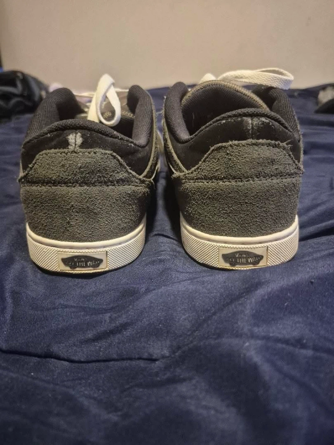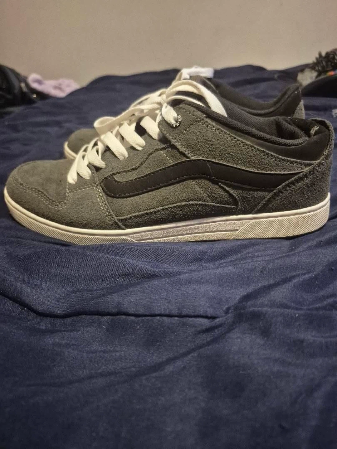Selling a pair of Vans sneakers in size 9. They're a stylish grey suede, perfect for everyday wear. They have the classic Vans stripe on the side and the iconic "Off The Wall" logo on the heel. They have some signs of wear, but still have lots of life left!