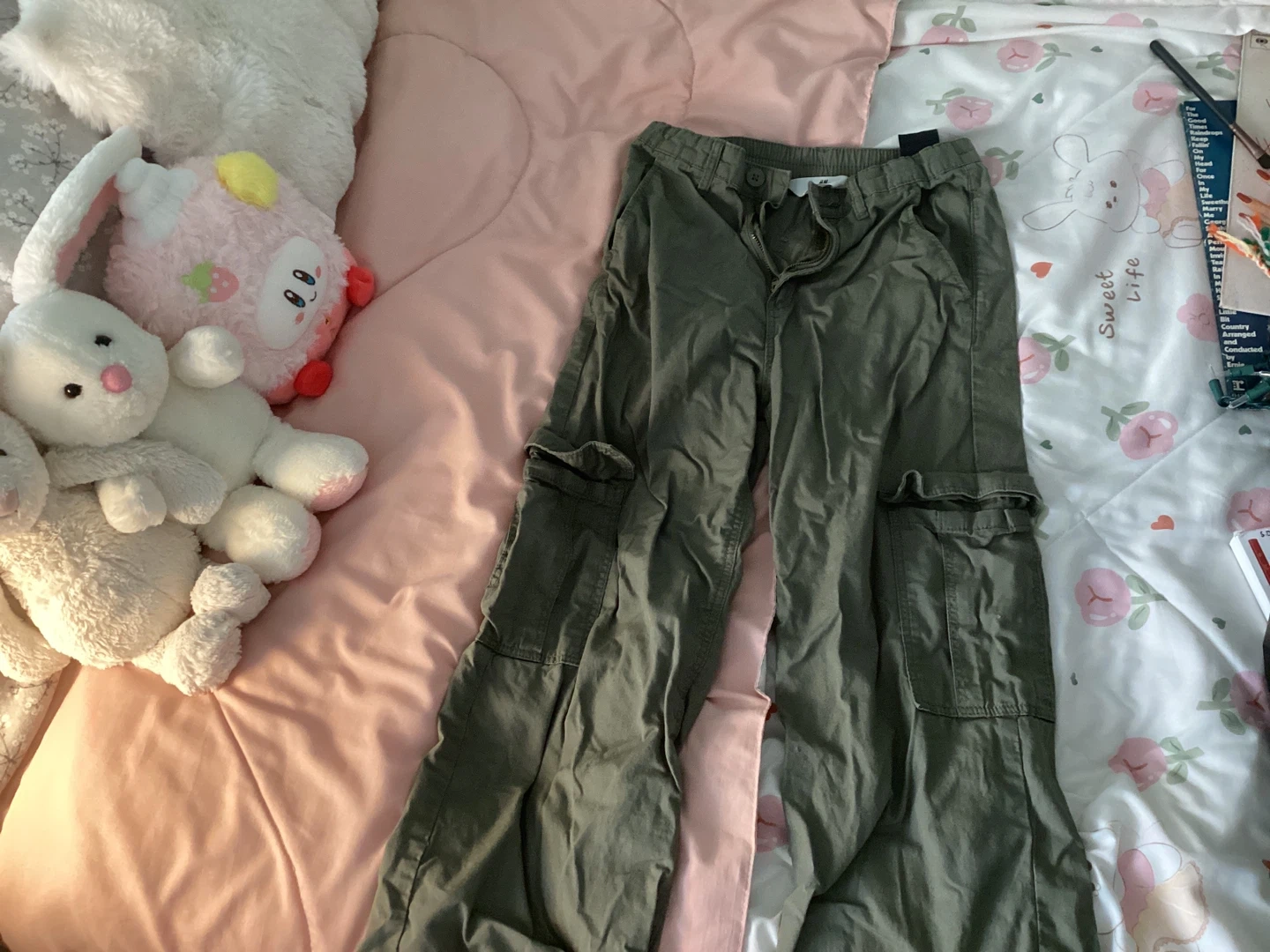 Selling a pair of H&M cargo pants in olive green. They're in great condition and ready for a new owner! They feature a comfortable fit and practical cargo pockets. Perfect for everyday wear!