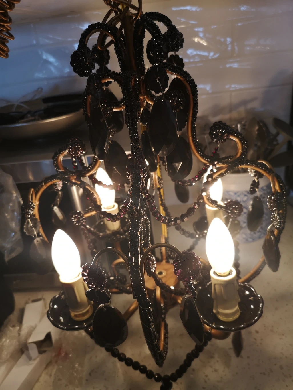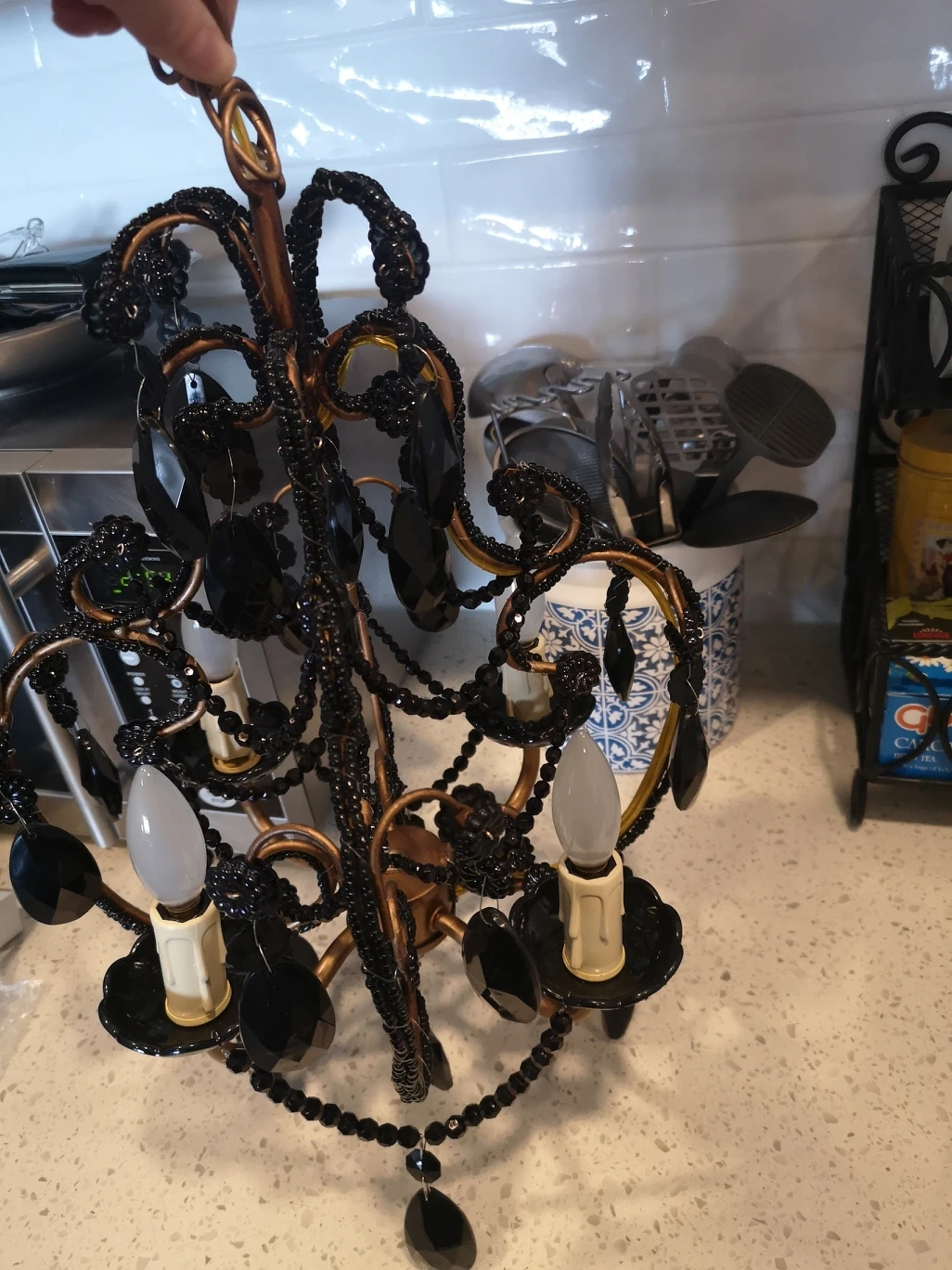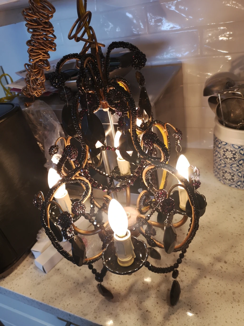 This beautiful Chandlier must be hung from the ceiling and then plugged into the wall. It's never been used and comes with all the bulbs.