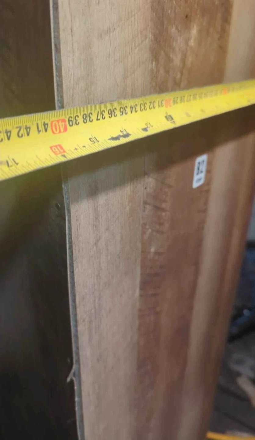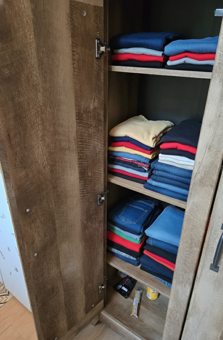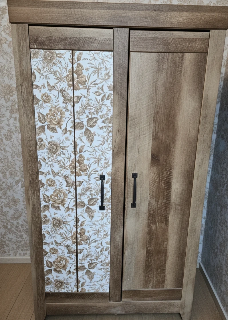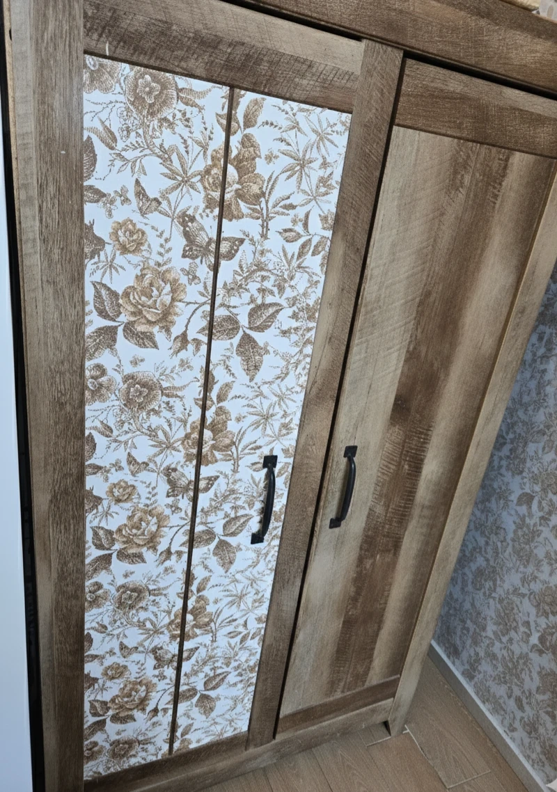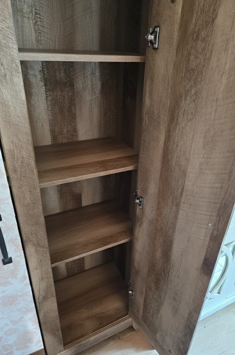 Here's a lovely wooden armoire that would be a great addition to any room! It features a unique floral accent on one of the doors. The armoire has several shelves for ample storage. The depth of the shelves is approximately 40cm.