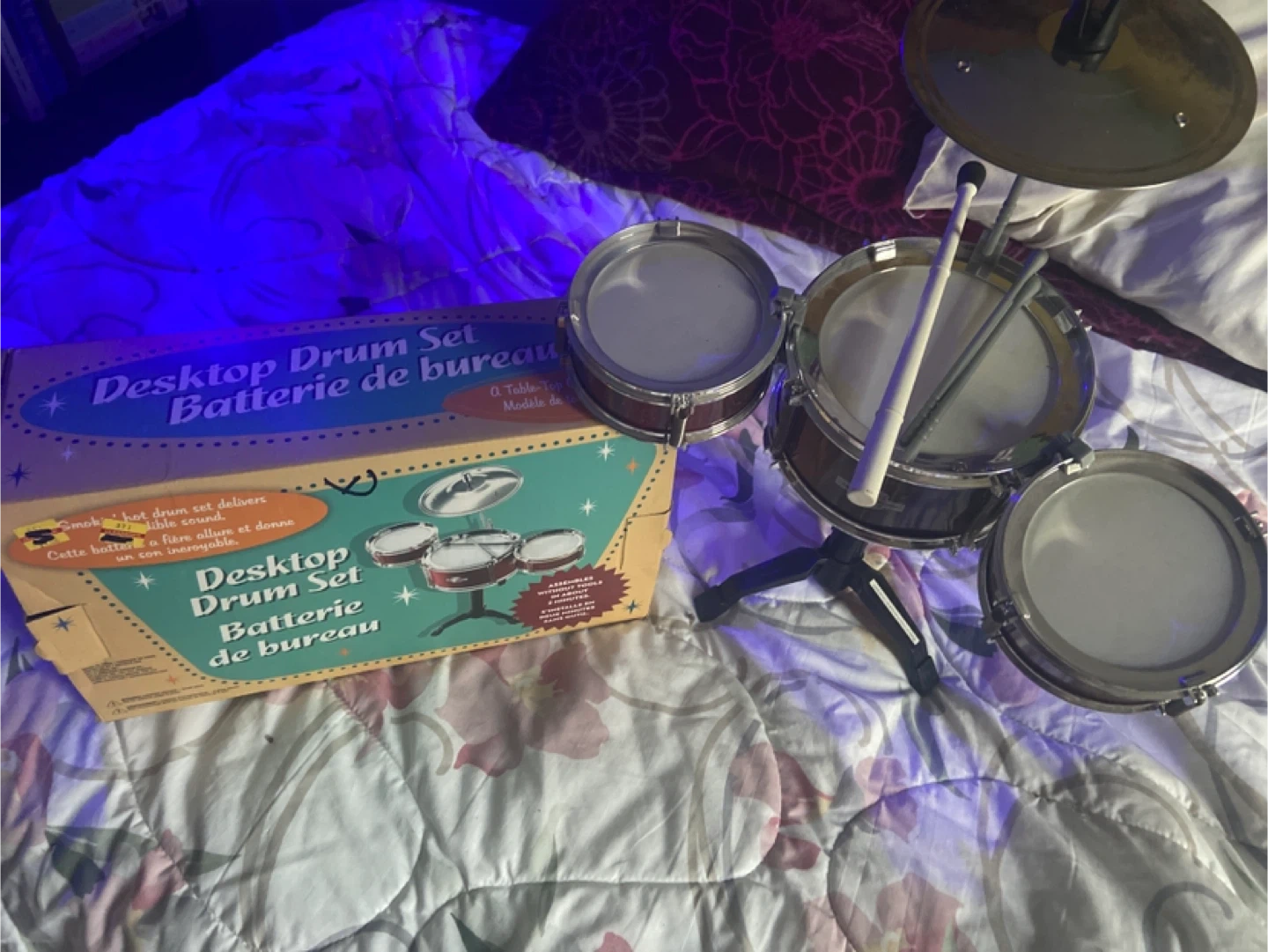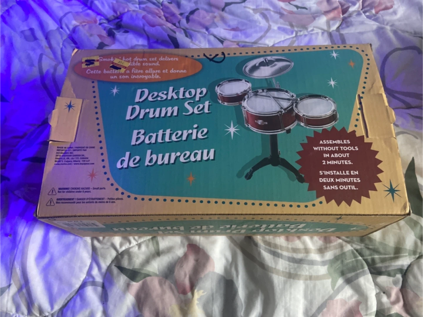 Selling a desktop drum set. It assembles without tools in about 2 minutes. It's a super hot drum set that delivers incredible sounds! The box is included