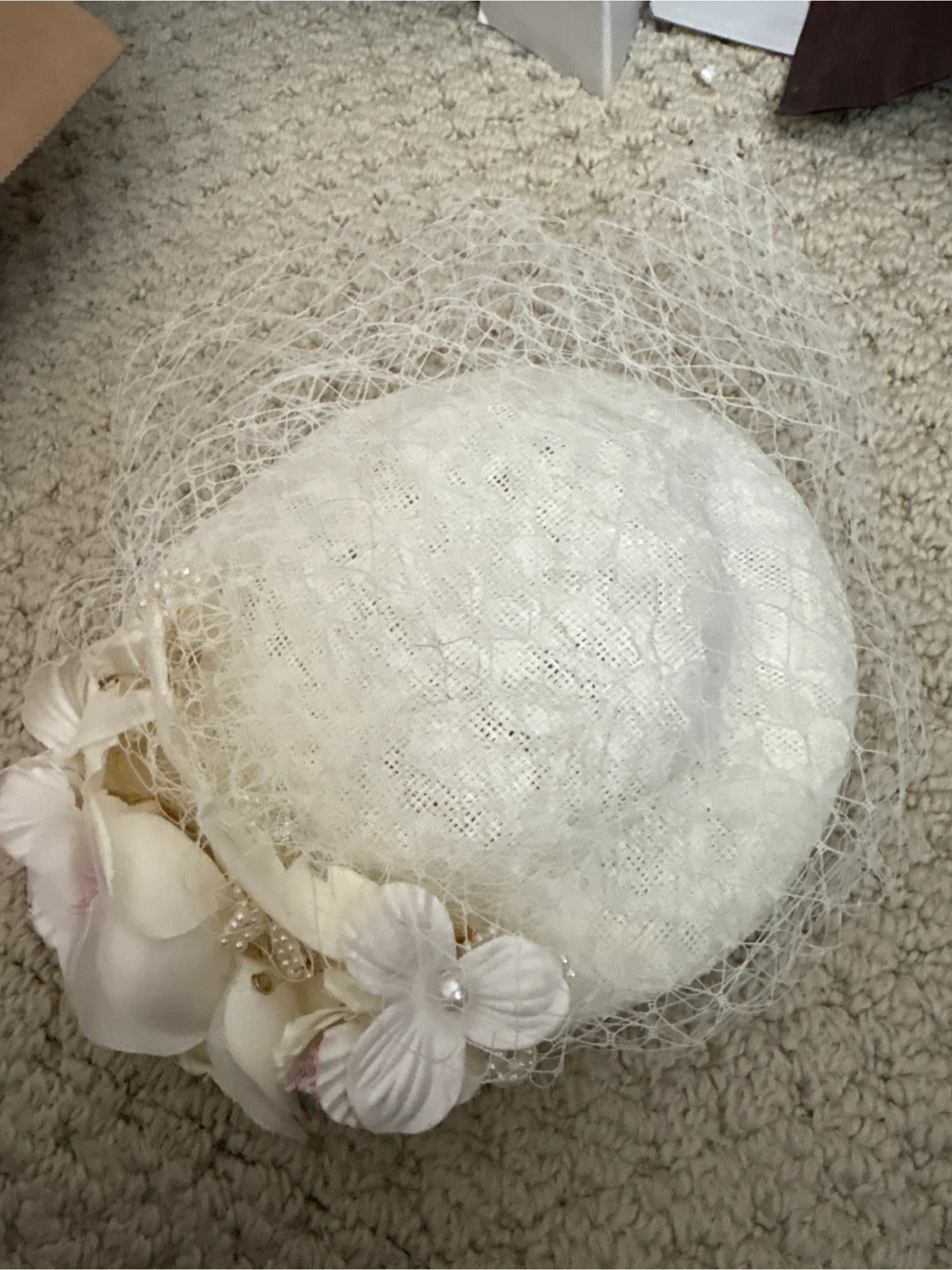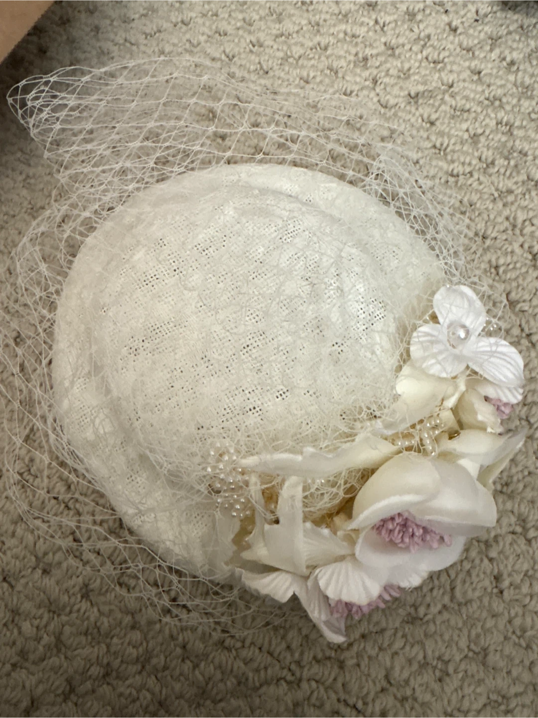 Selling a lovely fascinator hat in a cream colour. It has a vintage-inspired design with delicate floral accents and netting. Perfect for special occasions or adding a touch of elegance to your outfit!