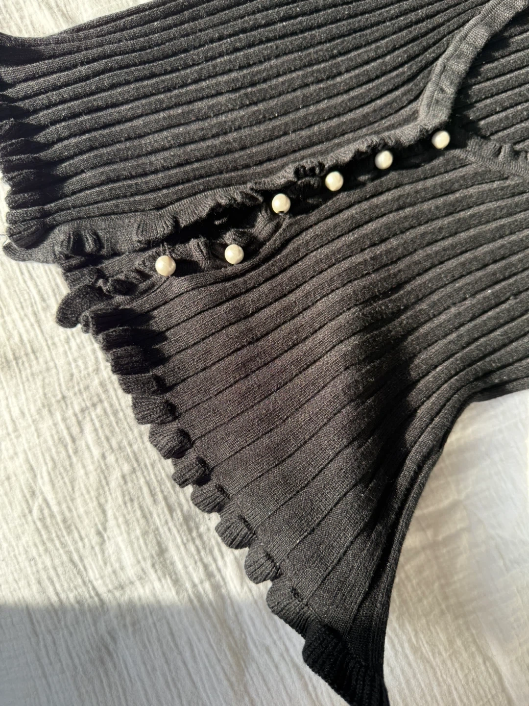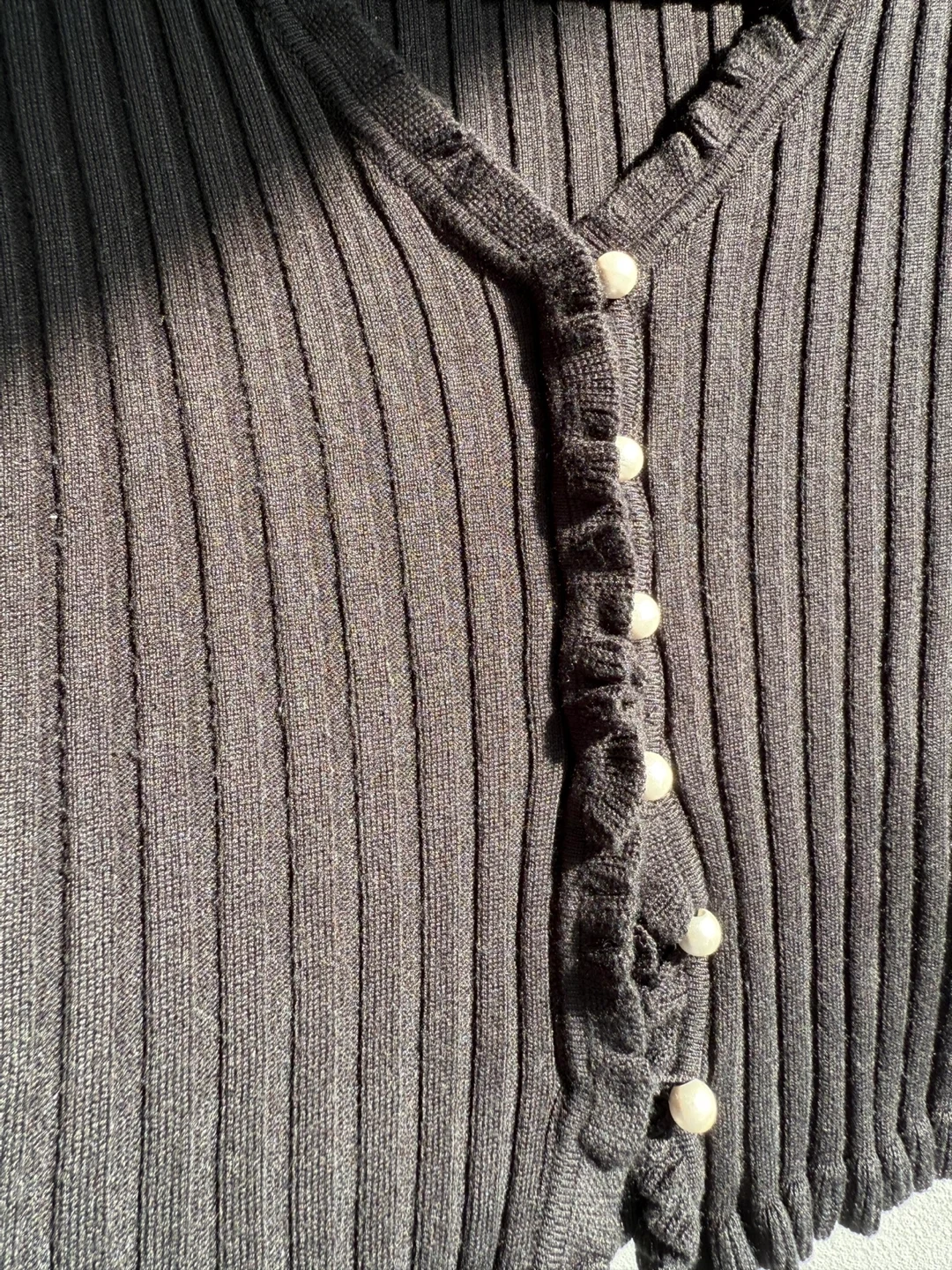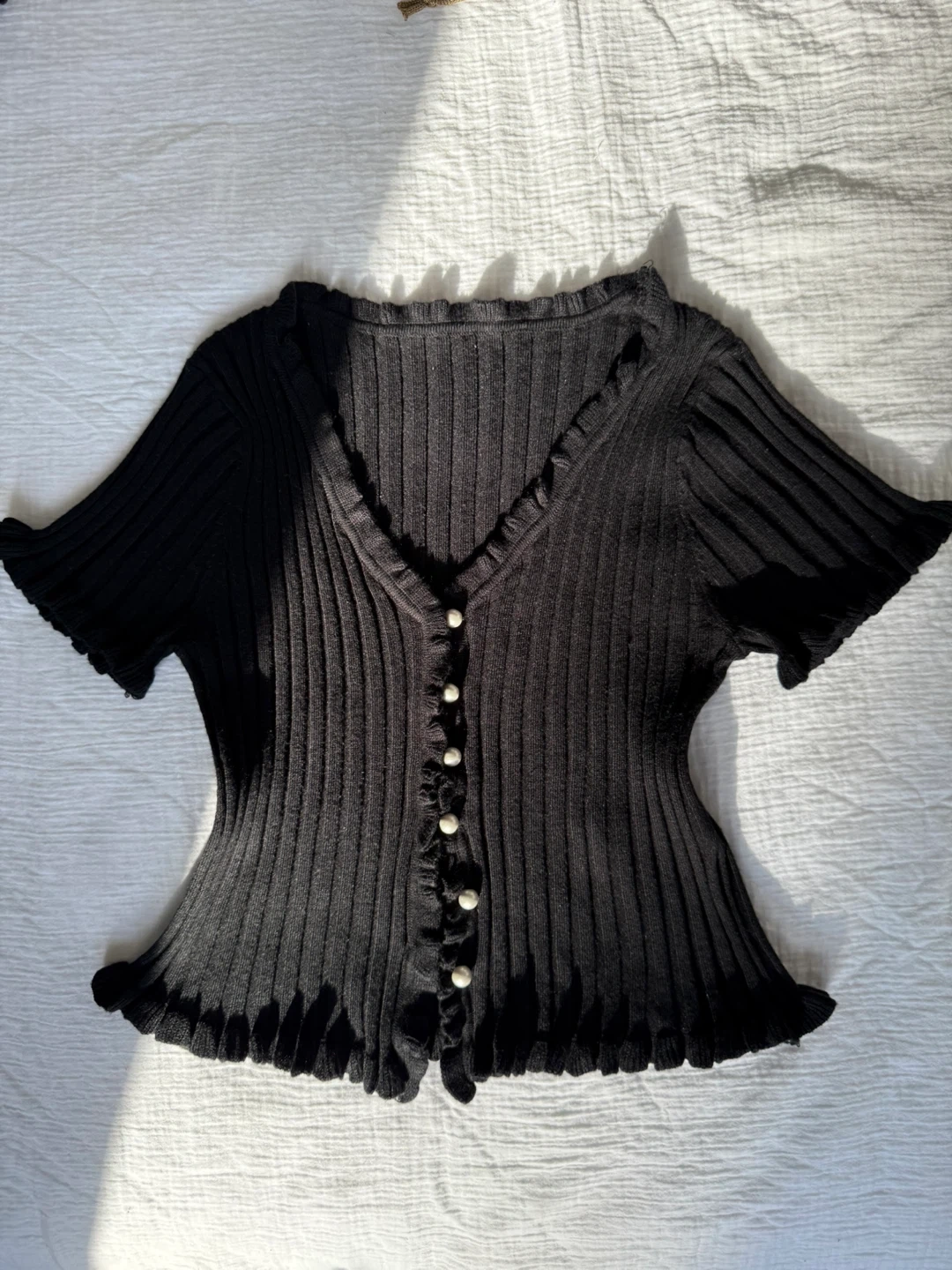 Selling a cute black ribbed knit cardigan. It features a V-neck it’s stretchy in size small with ruffle trim and pearl-like buttons. Great for night out !