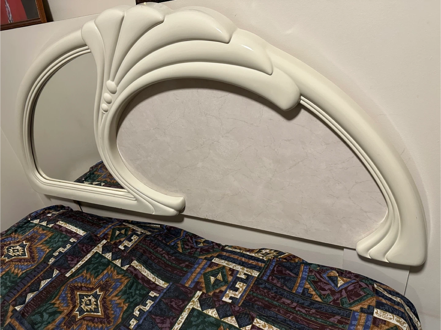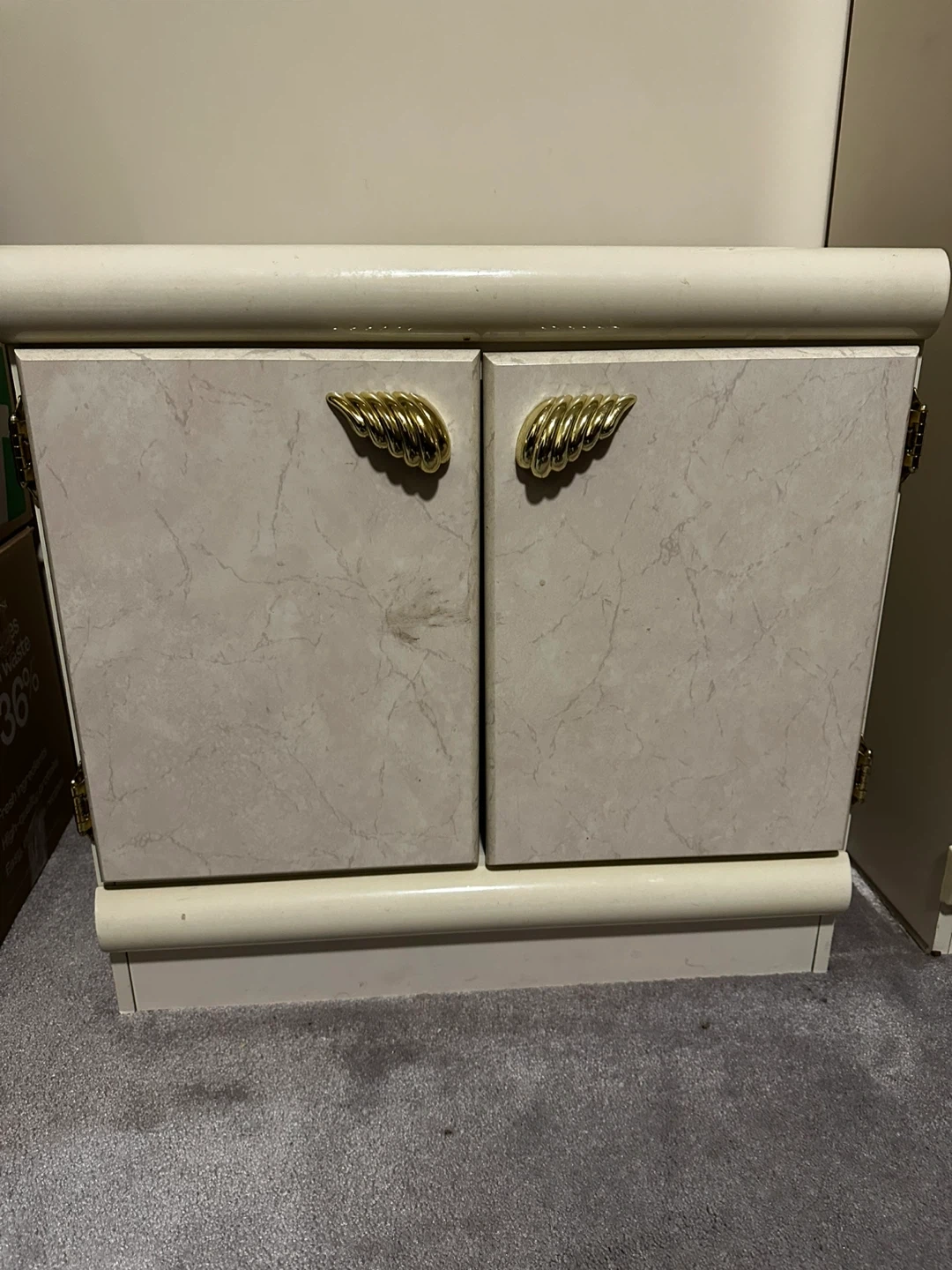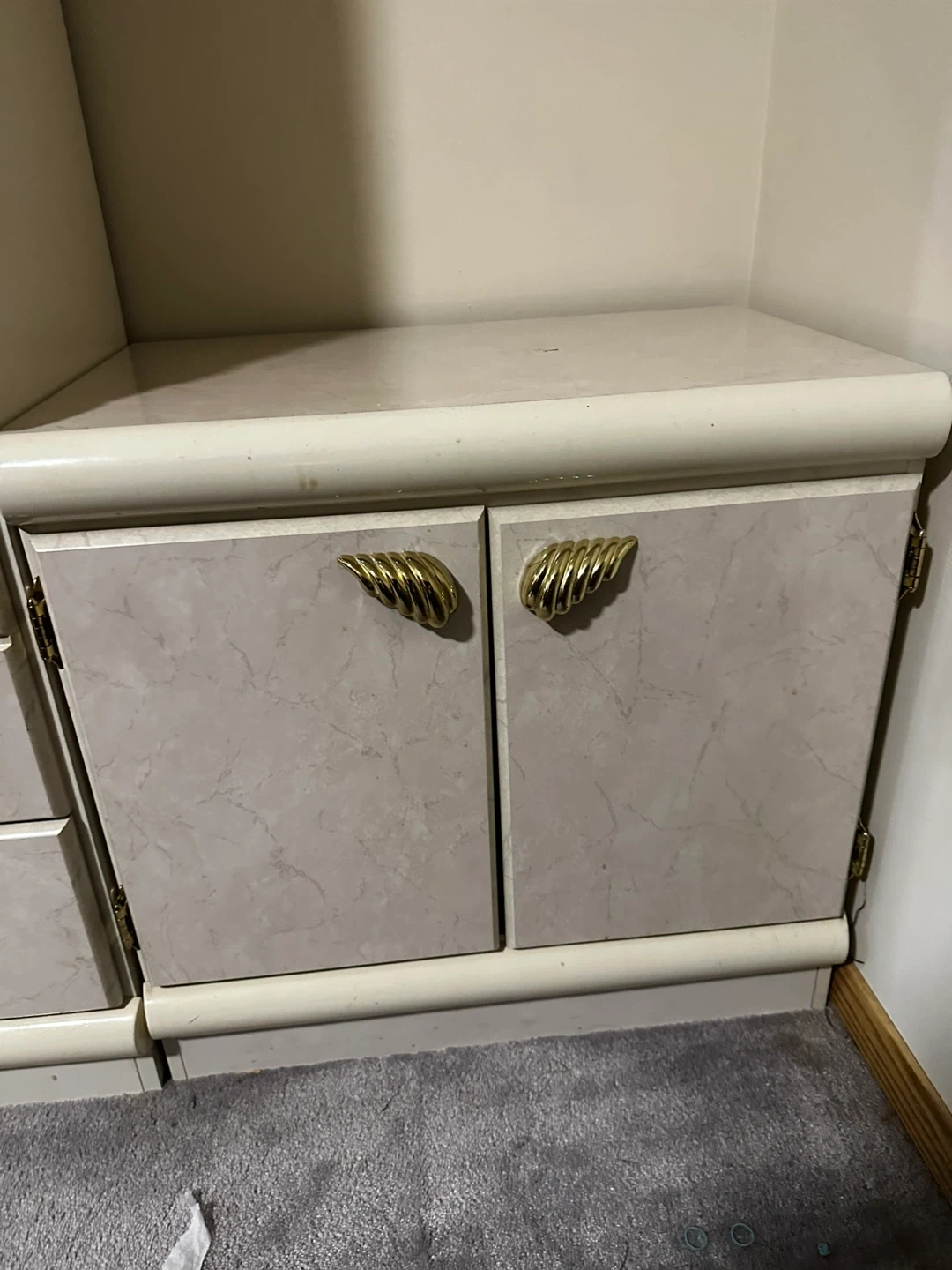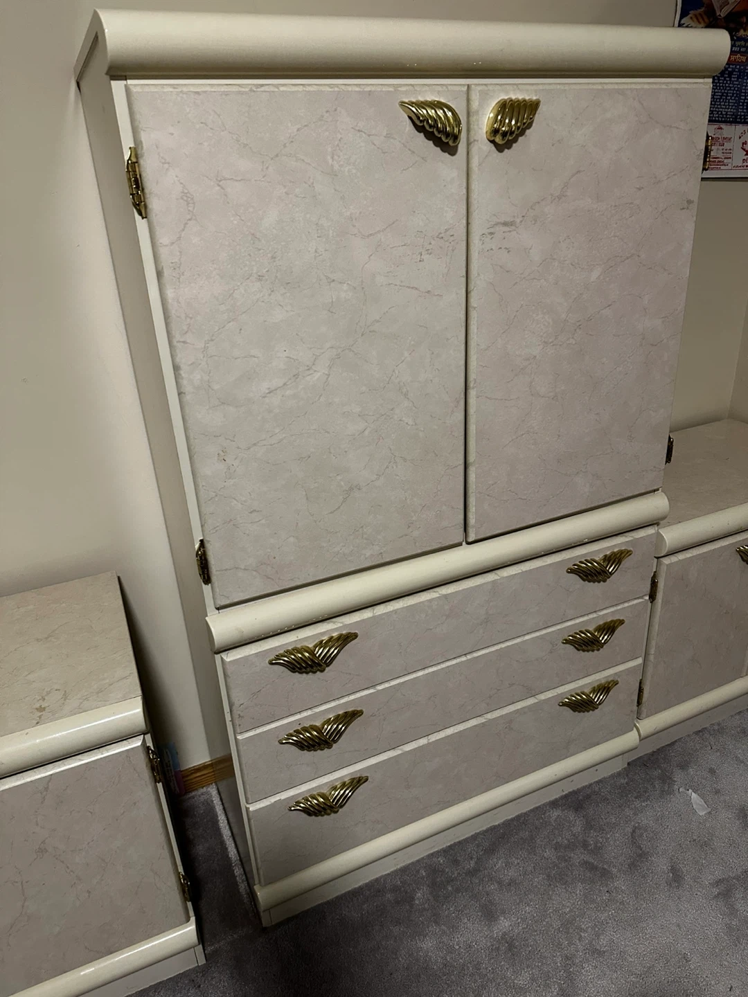 Selling a complete vintage bedroom set! It includes two nightstands, a dresser, and a wardrobe. The set features a unique marble-like finish and gold-toned hardware. Perfect for adding a touch of retro charm to your space