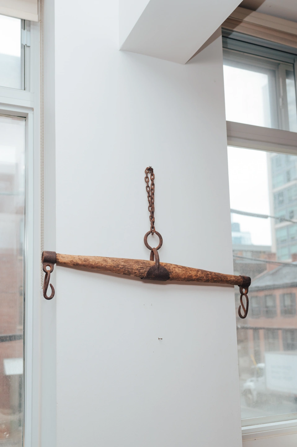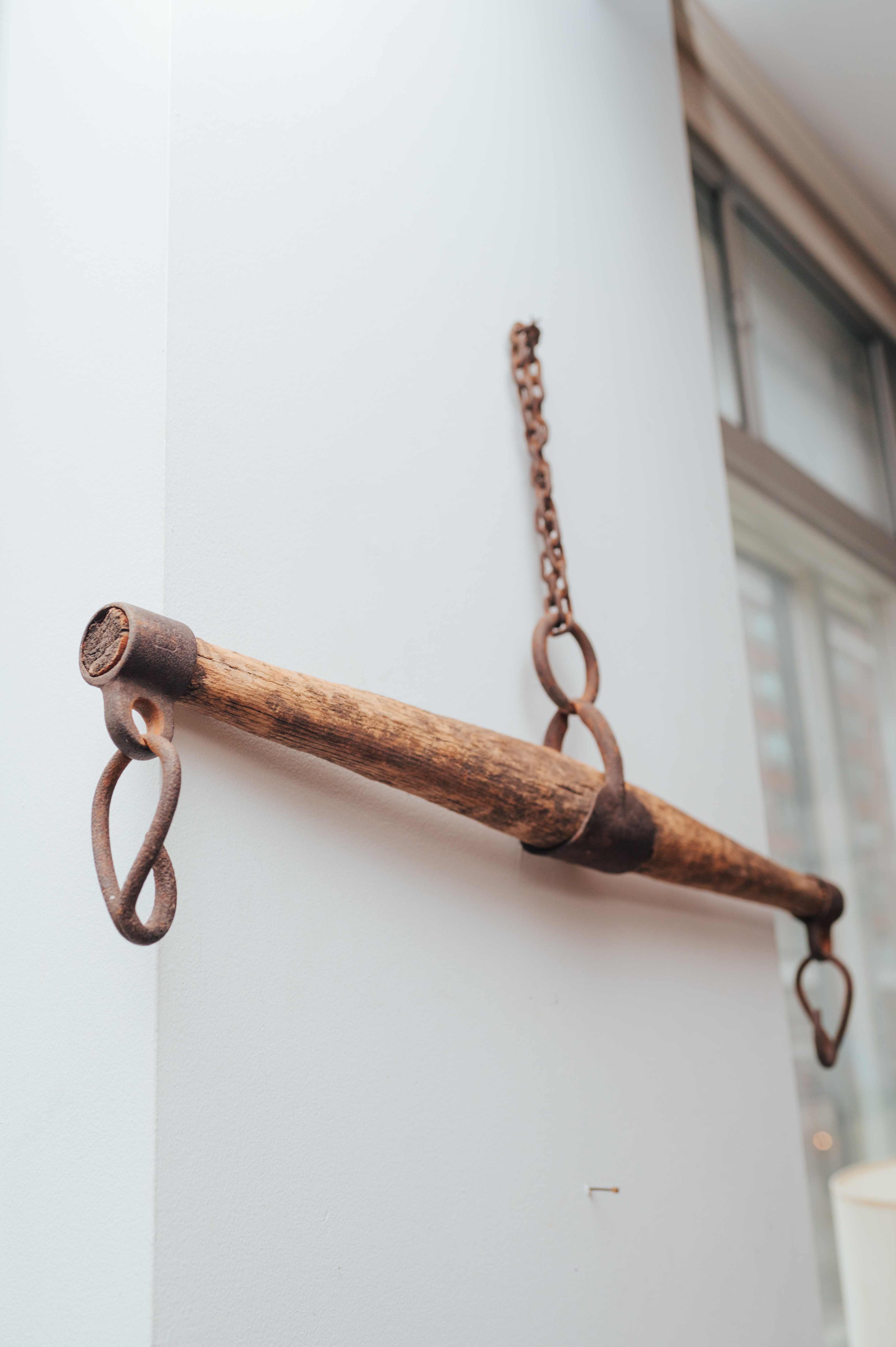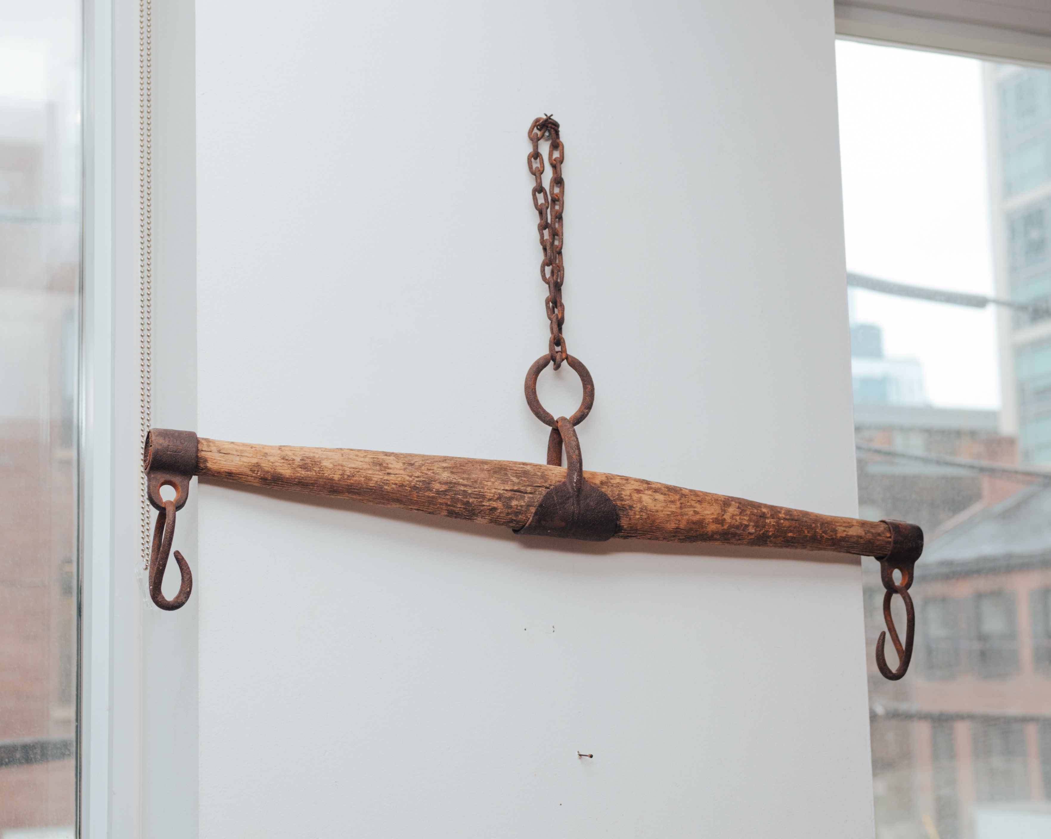 Vintage Wooden Farm Drag Bar / Hanging Wall Piece Authentic vintage wooden farm drag bar with original iron hardware and chain. This piece was traditionally used behind the knees of a horse for dragging timber - — and today makes an incredible rustic décor object. Beautiful aged wood, heavy iron hooks, and tons of character. Perfect as a: • Wall-mounted décor piece • Entryway or mudroom hanging bar • Studio or retail display • Rustic / farmhouse accent • Interior styling prop 32" A truly unique, sculptural object with real history. Details: • Solid wood construction • Original iron chain + hooks • Gorgeous aged patina • One-of-a-kind vintage piece Condition: Very good vintage condition. Structurally solid with age-appropriate wear. Pickup: Downtown Toronto – Adelaide St E & Sherbourne Delivery available within the GTA - DM for rates. You are always welcome to send an Uber Courier. — Follow for my COMMERCE PROFILE for more curated vintage & statement decor Follow me on Instagram @_sundaycreative