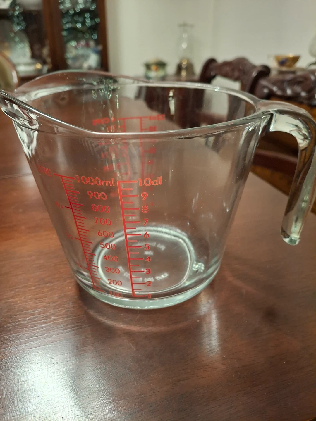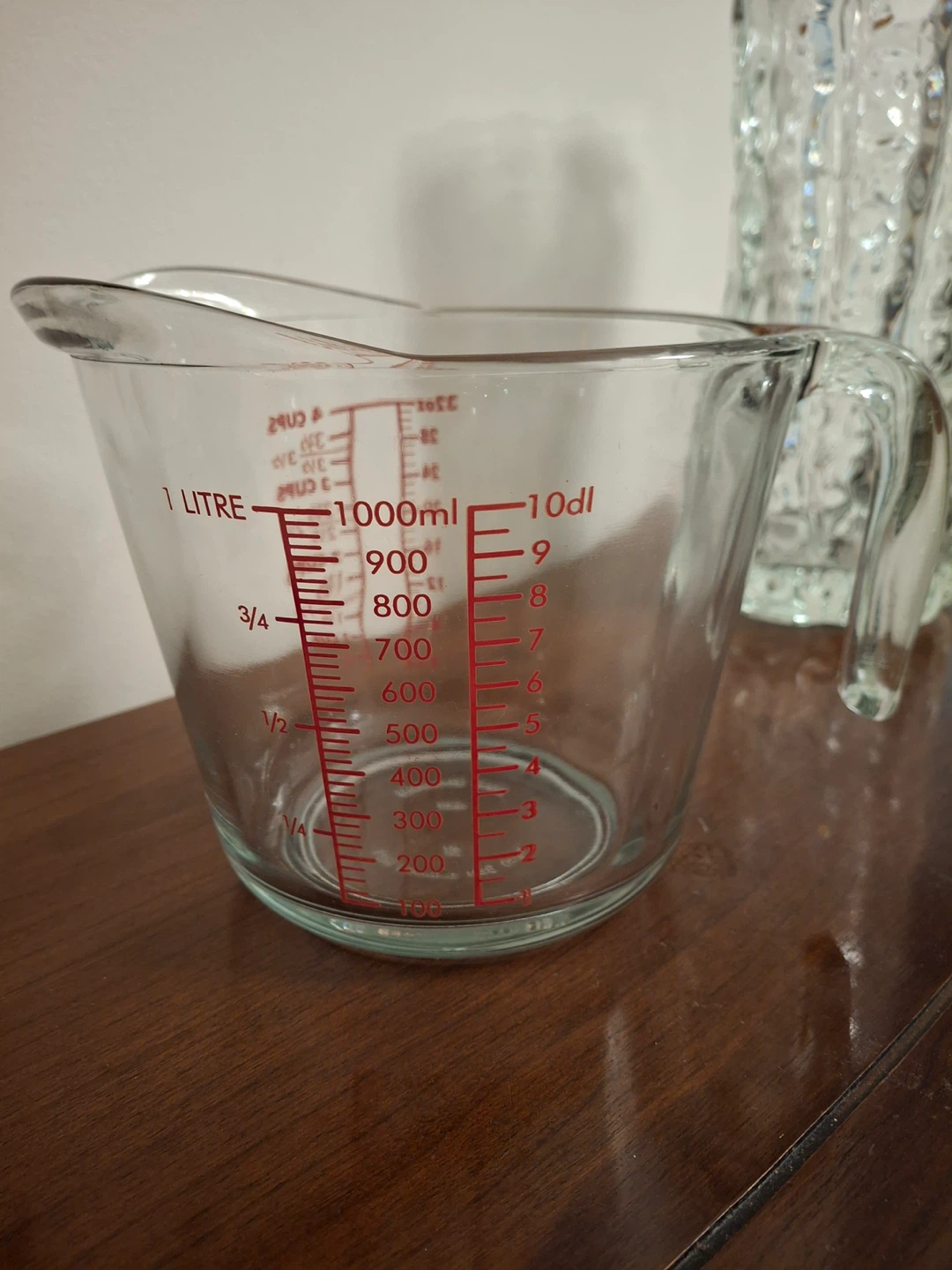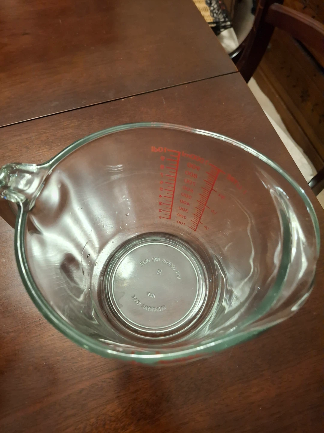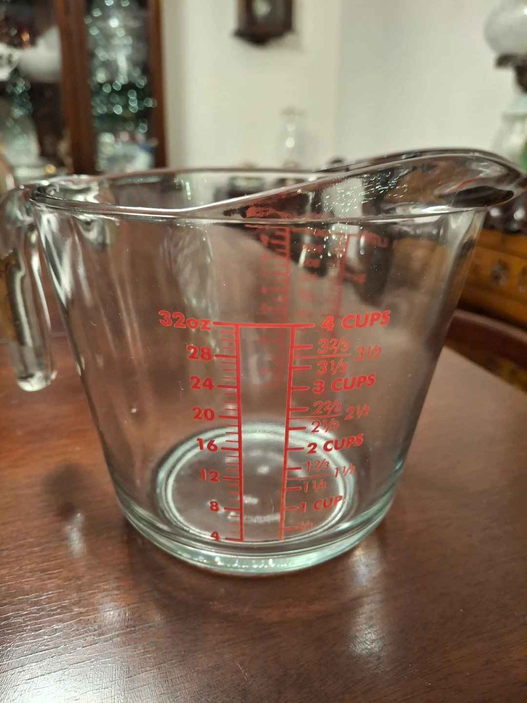 Unbranded glass measuring cup - 32oz/4 cups, 1L. Microwave safe. 5” high, 5.5” across, 6.5” from handle to spout.