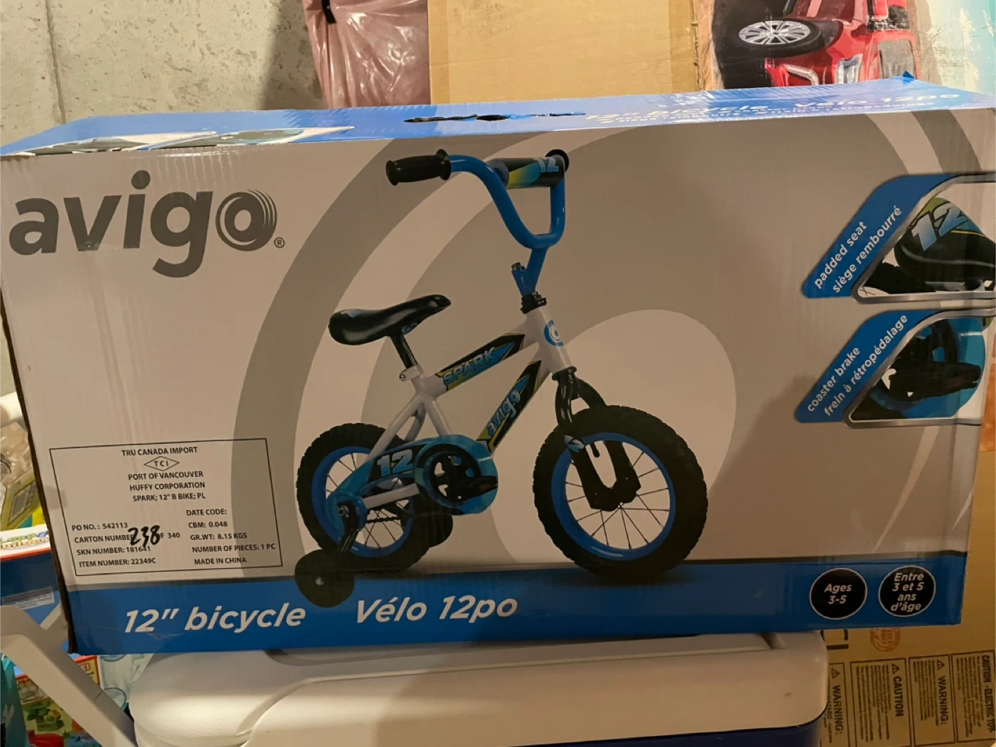 Selling a brand new Avigo Spark 12" bicycle, still in its original box! This bike is perfect for kids aged 3-5. It features a padded seat and a coaster brake. Ready for a new rider!