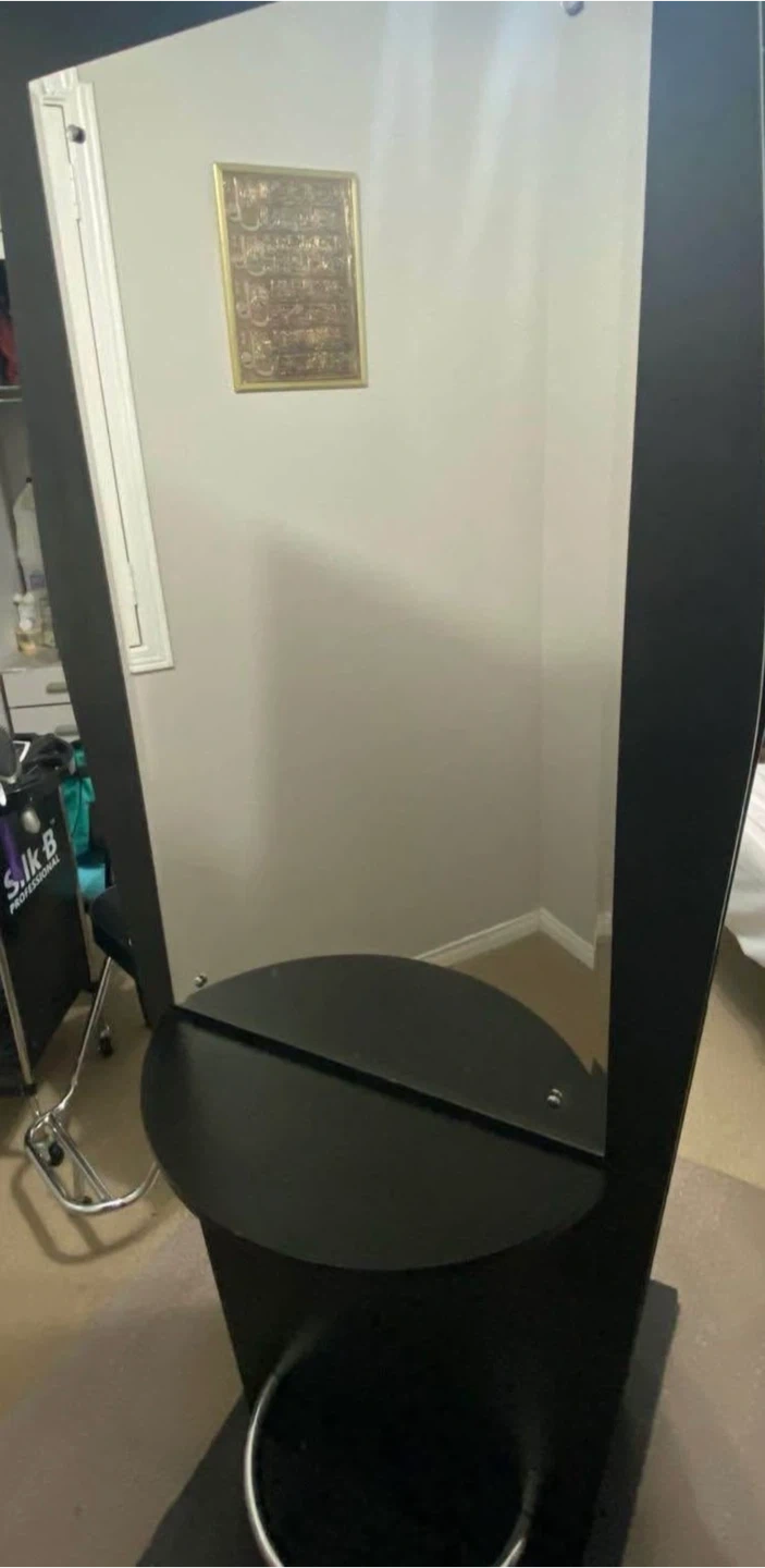 Selling a black salon styling station with a mirror. It features a built-in mirror, a shelf, and holders for styling tools. Perfect for setting up your own salon space at home!