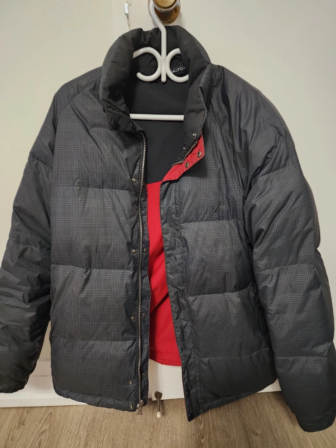 Selling a Nautica puffer jacket in a stylish black and red colour block design. It's in great condition and perfect for staying warm during the colder months. The jacket features a high collar and a comfortable fit. It's a great addition to any winter wardrobe!