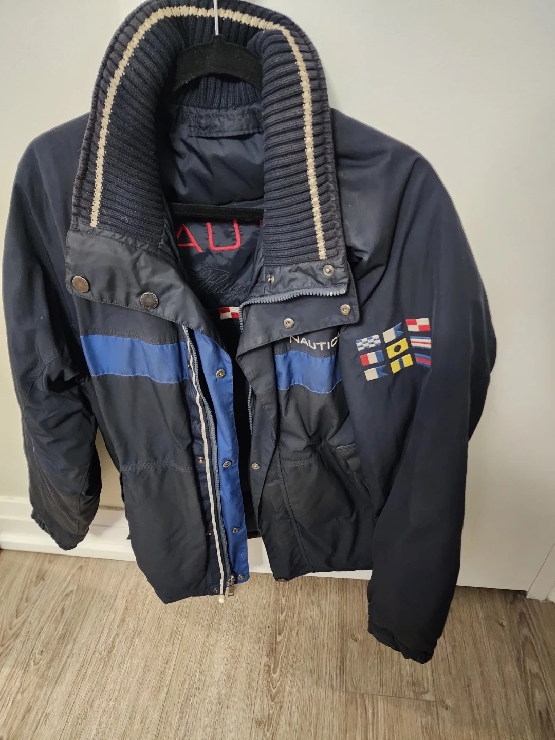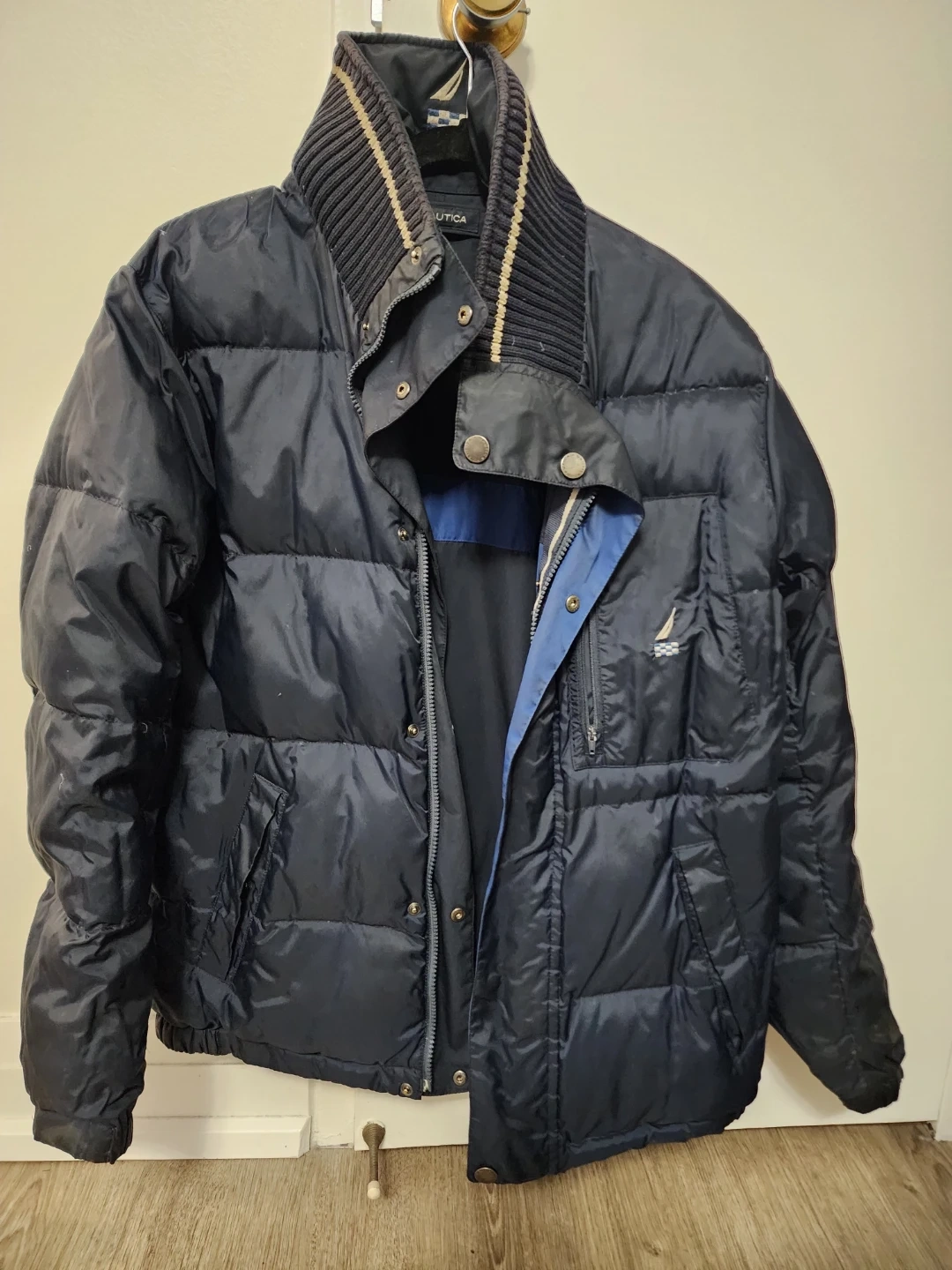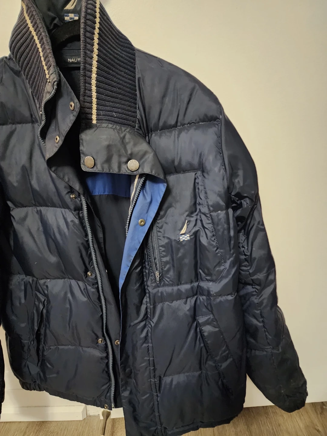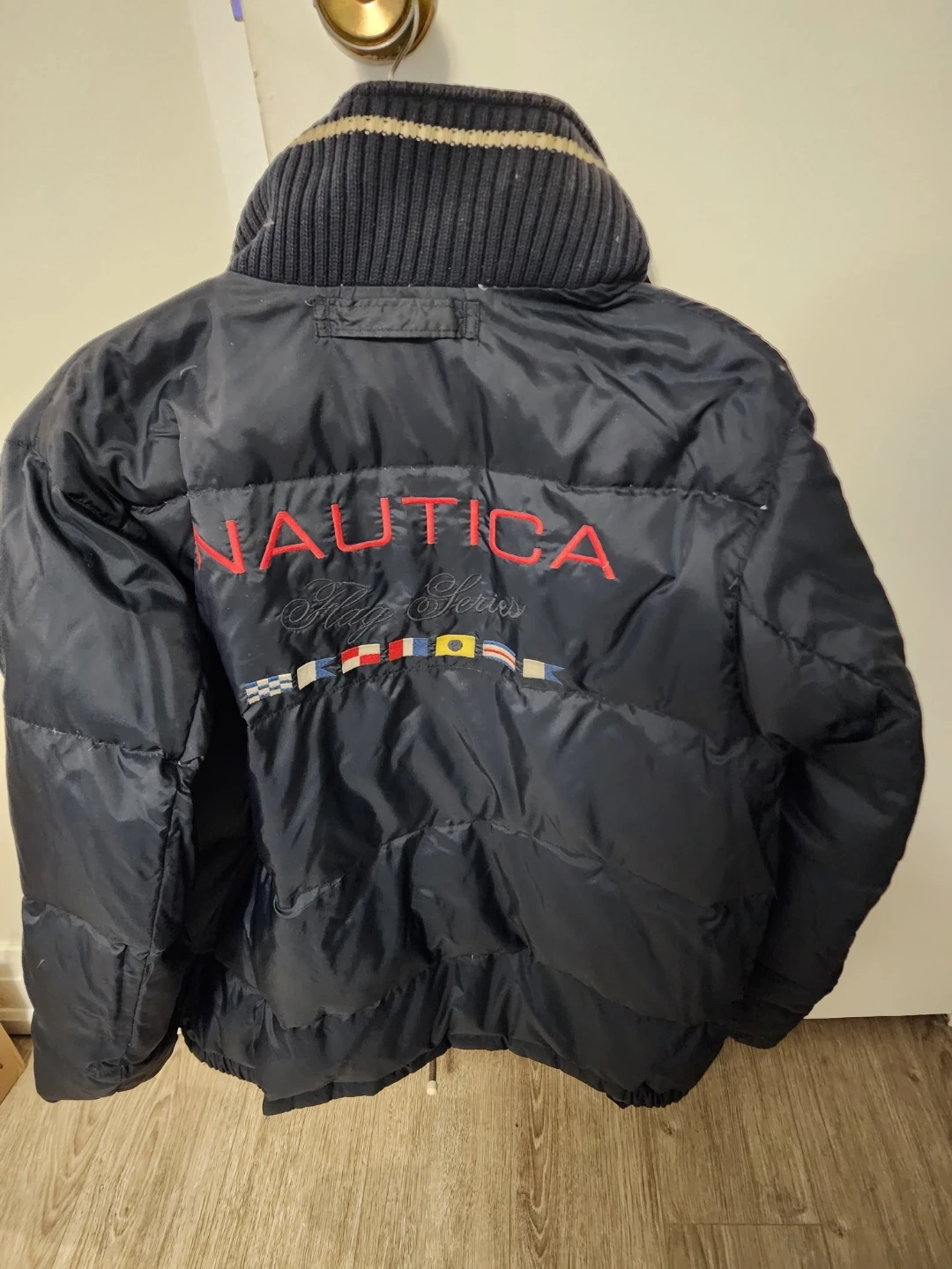 Selling a Nautica navy blue puffer jacket. It features a ribbed collar and a blue stripe across the back. The jacket has the Nautica logo on the upper back and flags on the sleeve. It's a great jacket for staying warm!