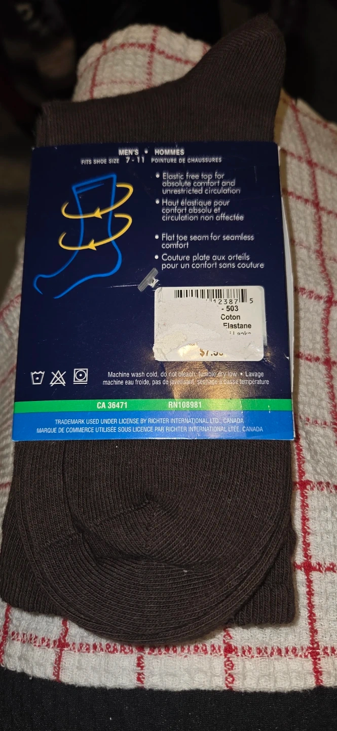 Here's a pair of All Day Socks for men, fitting shoe sizes 7-11. They feature a non-elastic top for unrestricted circulation and a flat toe seam for added comfort. The socks are made of cotton and elastane, providing a comfortable fit. They're in a nice brown colour!
