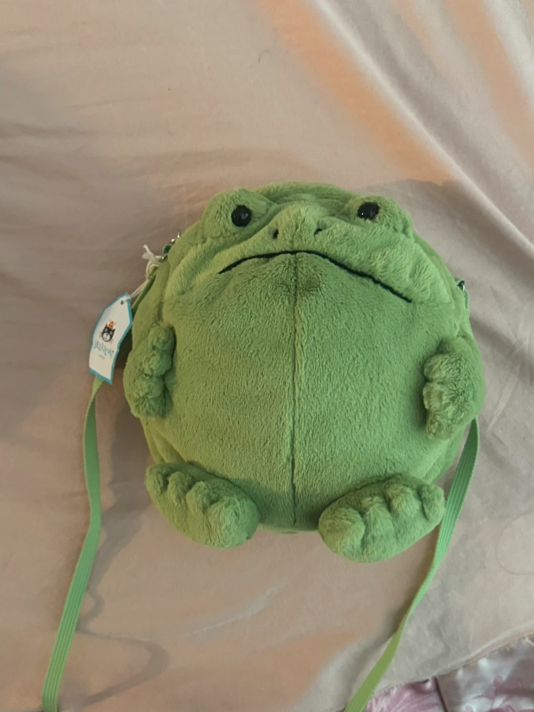 Selling a cute Jellycat frog bag! It's in great condition and ready for a new owner. The bag is a soft, plush green and has a zipper closure. Perfect for carrying small items!