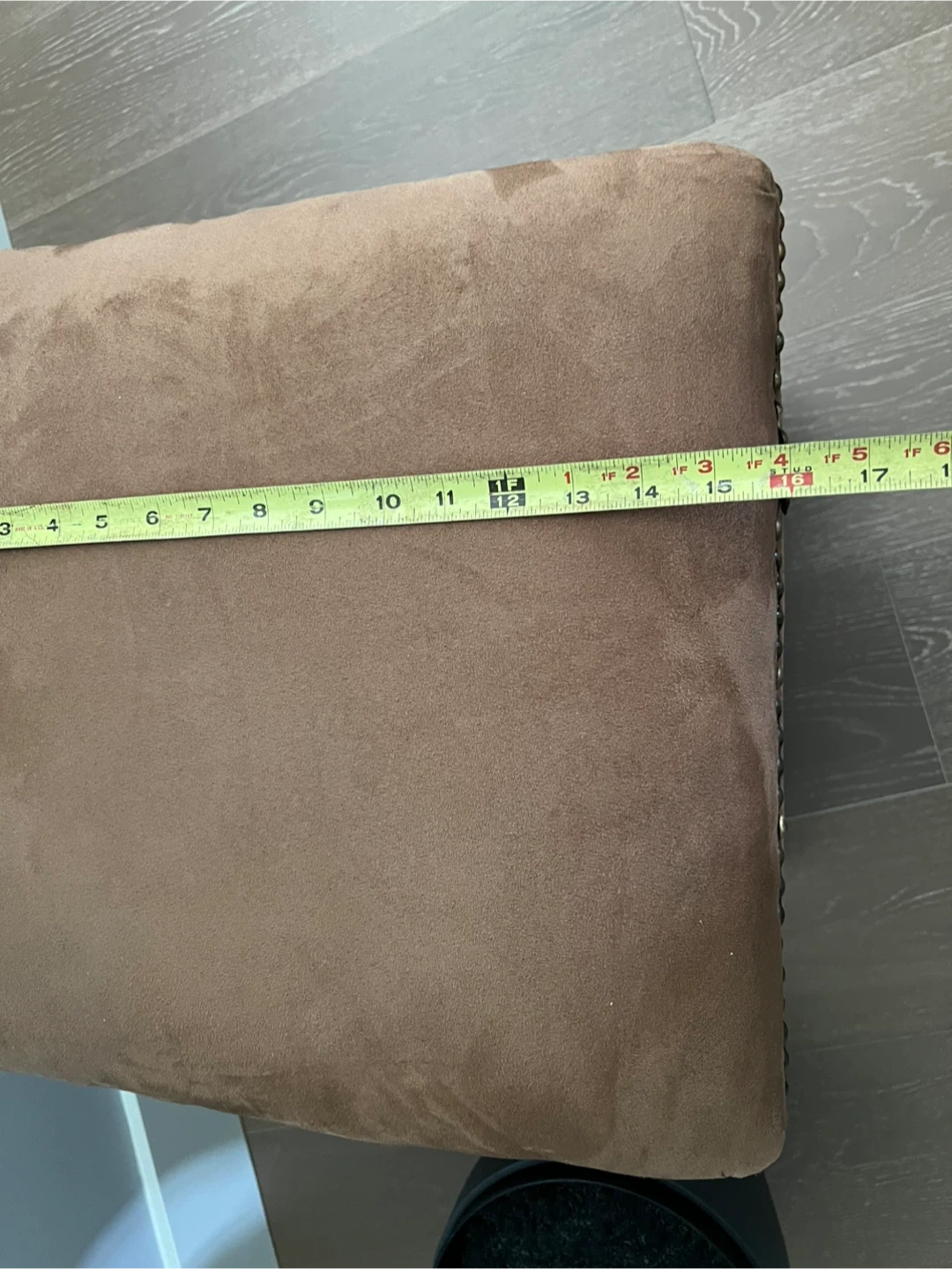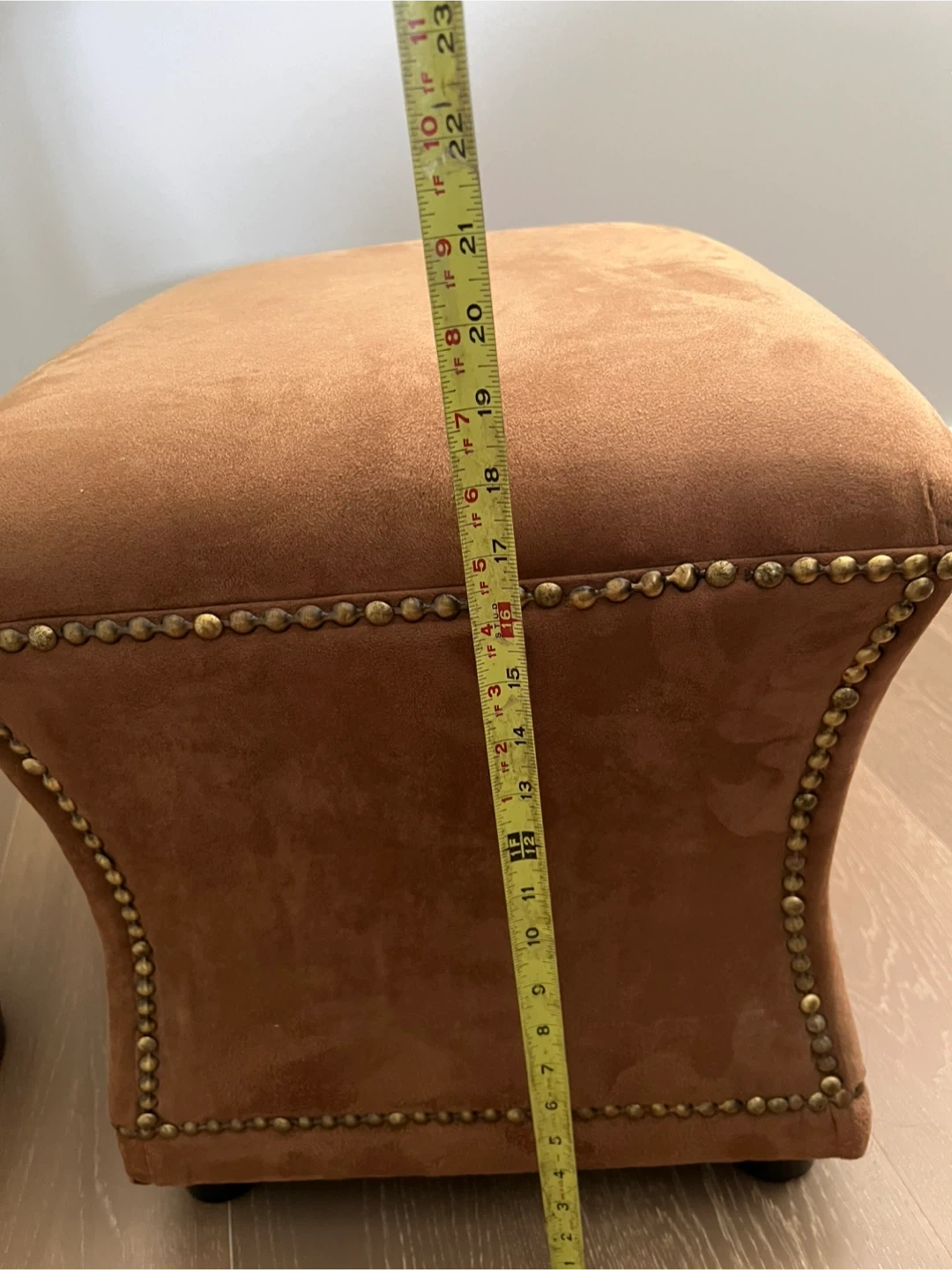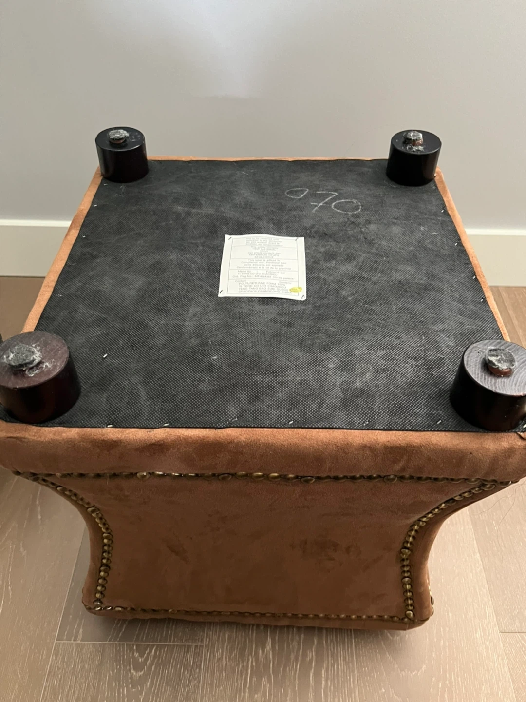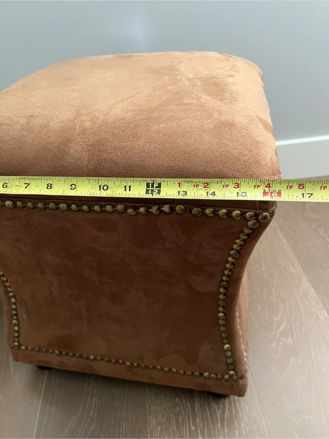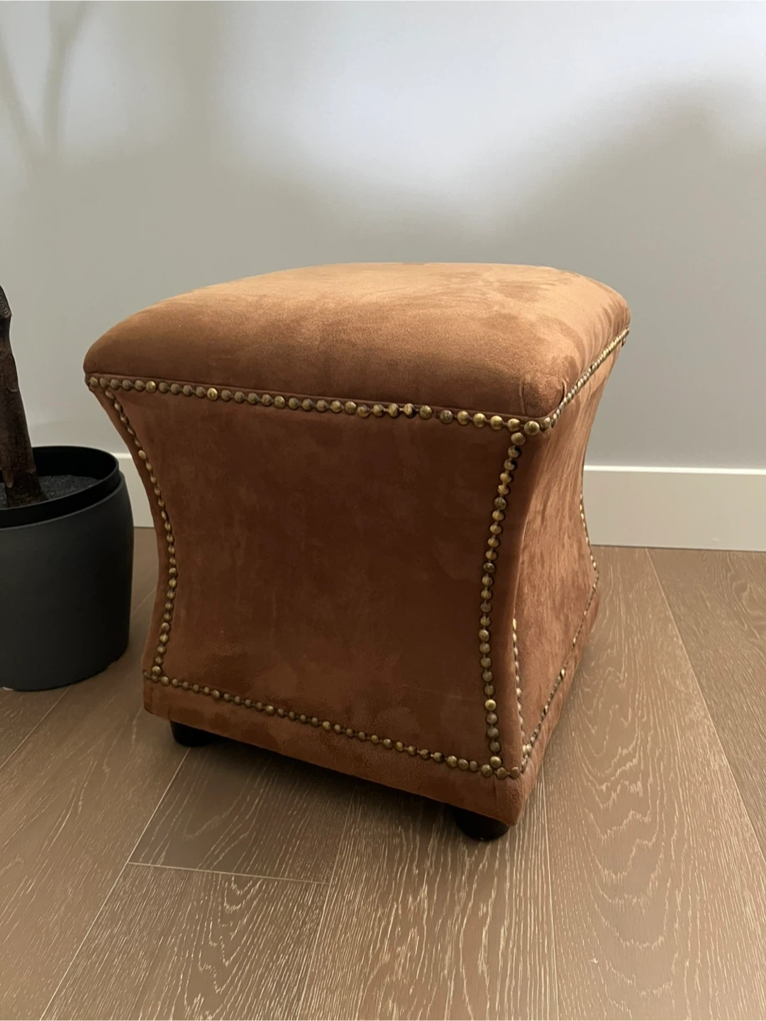 Vintage brown suede ottoman footstool. It's in great shape and would look lovely in any living room or bedroom. The dimensions are approximately 18 inches tall, 16 inches wide, and 16 inches deep