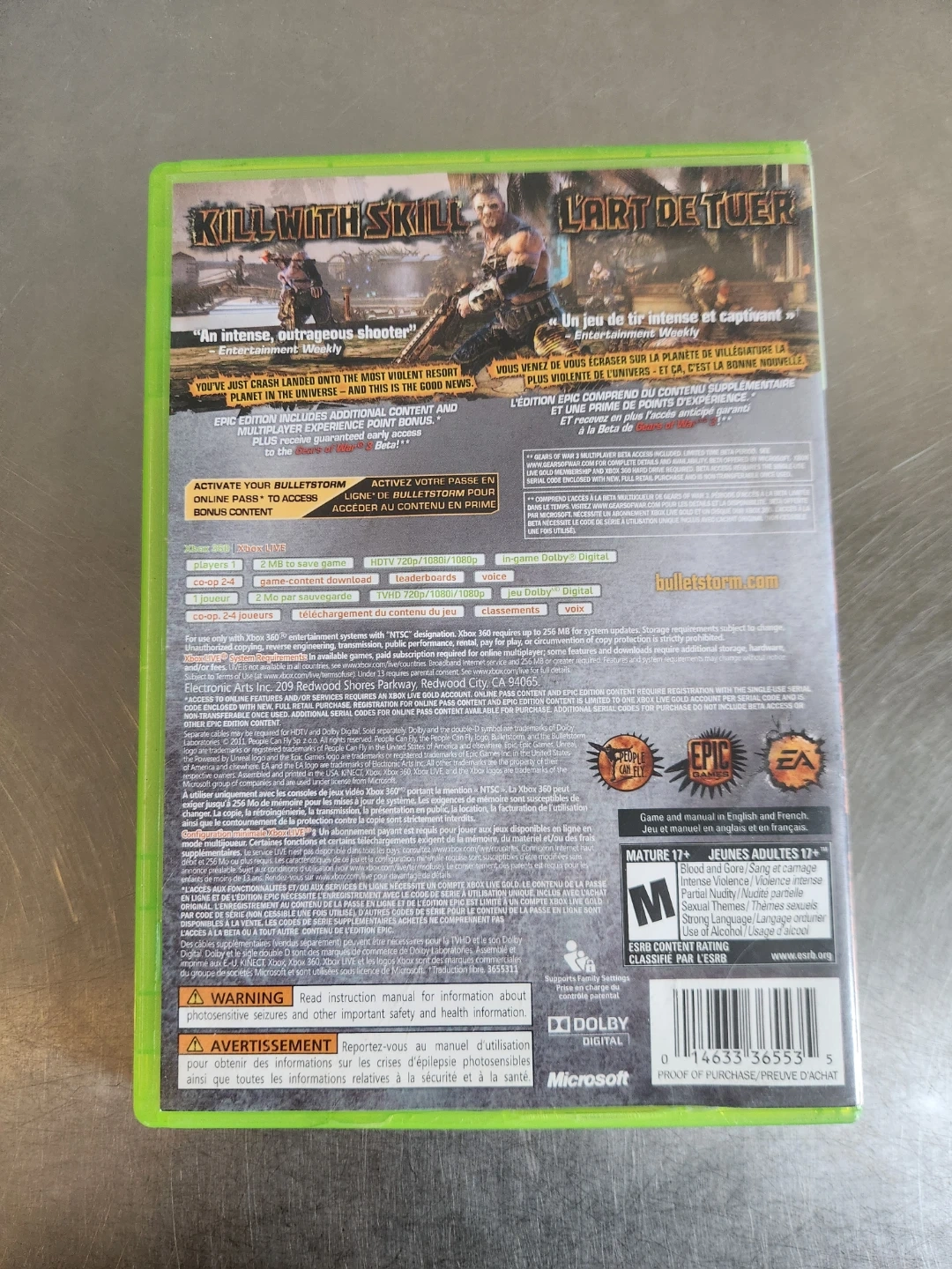 Selling Bulletstorm Epic Edition for Xbox 360! Game and manual in English and French. Rated Mature 17+ by ESRB for intense violence and sexual themes. Enjoy!