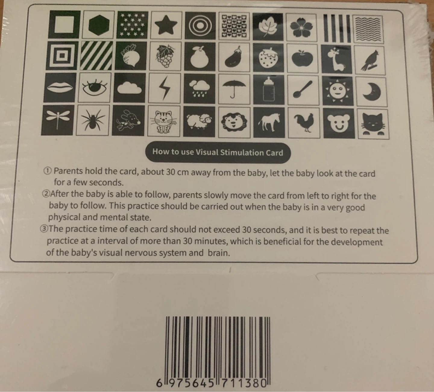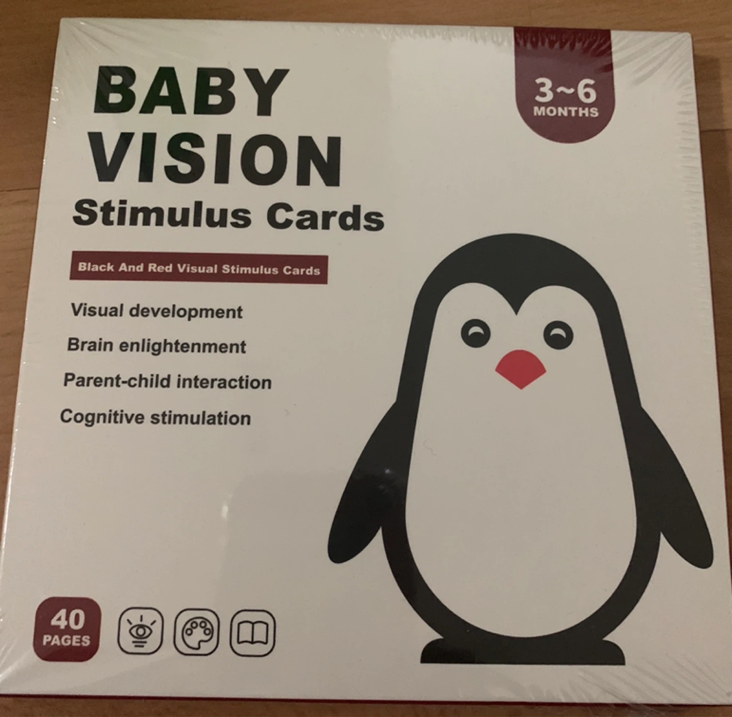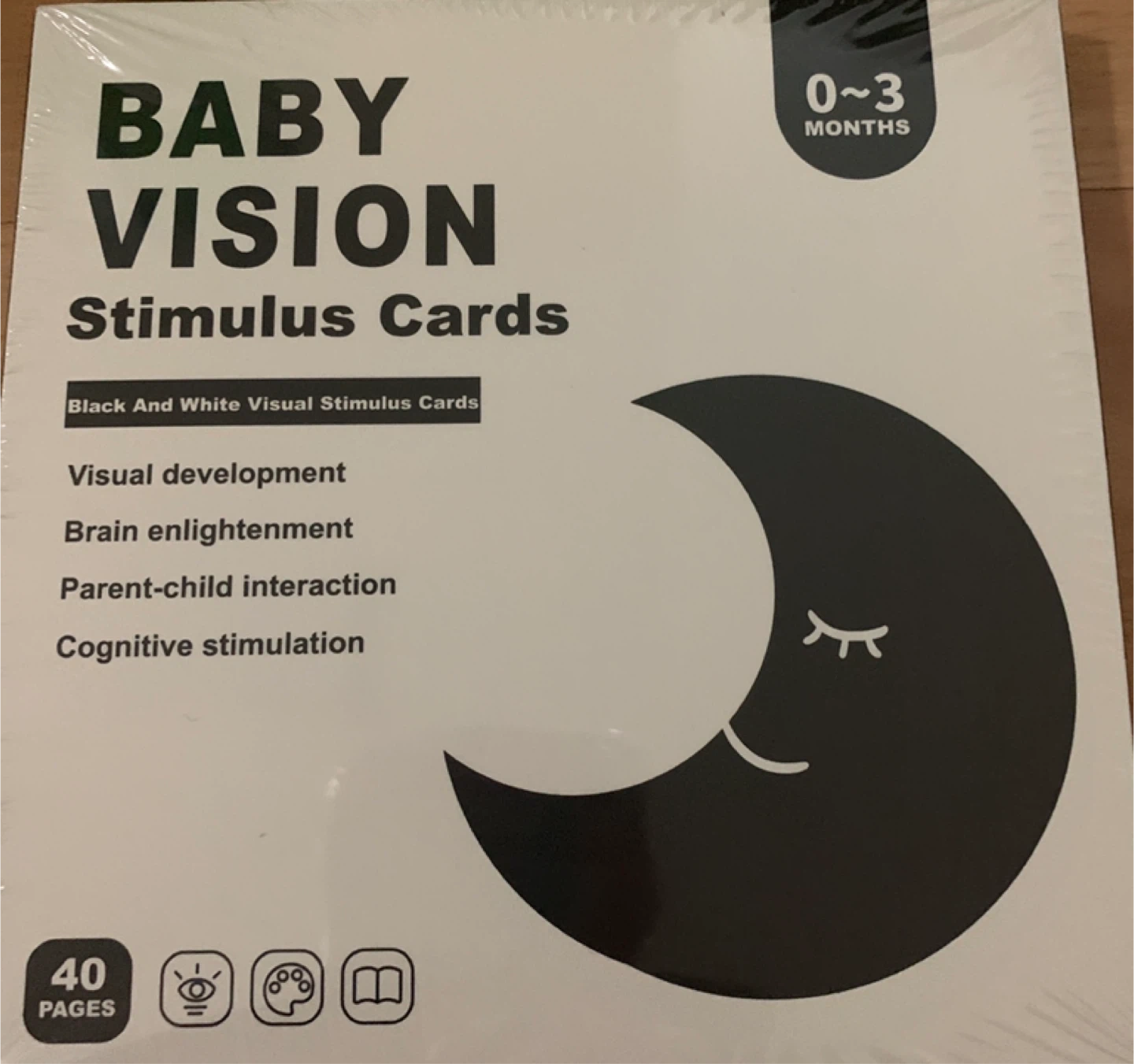 I'm selling Baby Vision Stimulus Cards for babies aged 0-3 months and 3-6 months. These cards are designed for visual development, brain enlightenment, parent-child interaction, and cognitive stimulation. Each set contains 40 pages. The box includes instructions on how to use the visual stimulation cards.