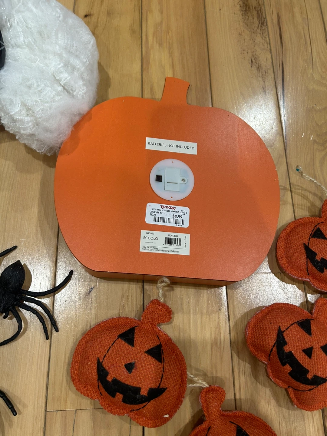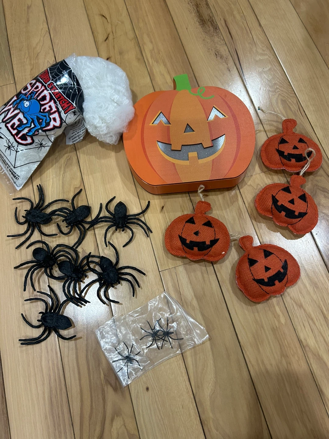 I'm selling a Halloween decoration set! It includes a spider web, plastic spiders, a decorative pumpkin, and small pumpkin ornaments. The pumpkin requires batteries (not included). Originally priced at $8.99.