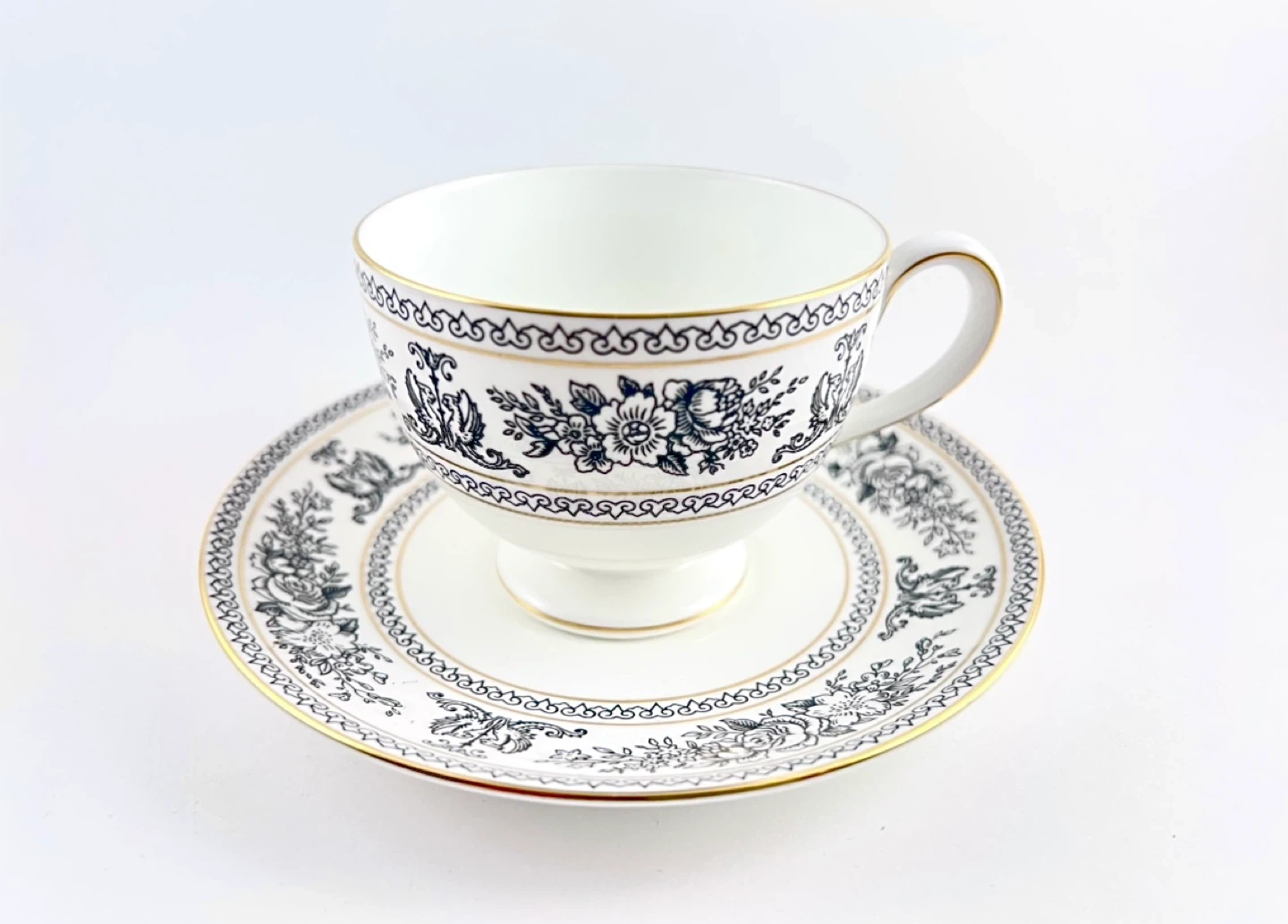 Wedgwood Black Columbia (discontinued) teacup— no chips, cracks, crazing or gold loss. Both pieces ring/ping