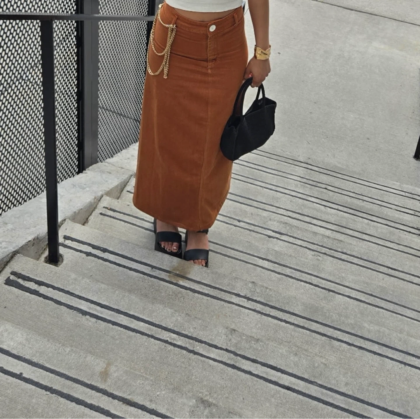 Here's a stylish brown corduroy maxi skirt! It's perfect for adding a touch of texture and warmth to your wardrobe. The maxi length and corduroy material make it a versatile piece for various occasions