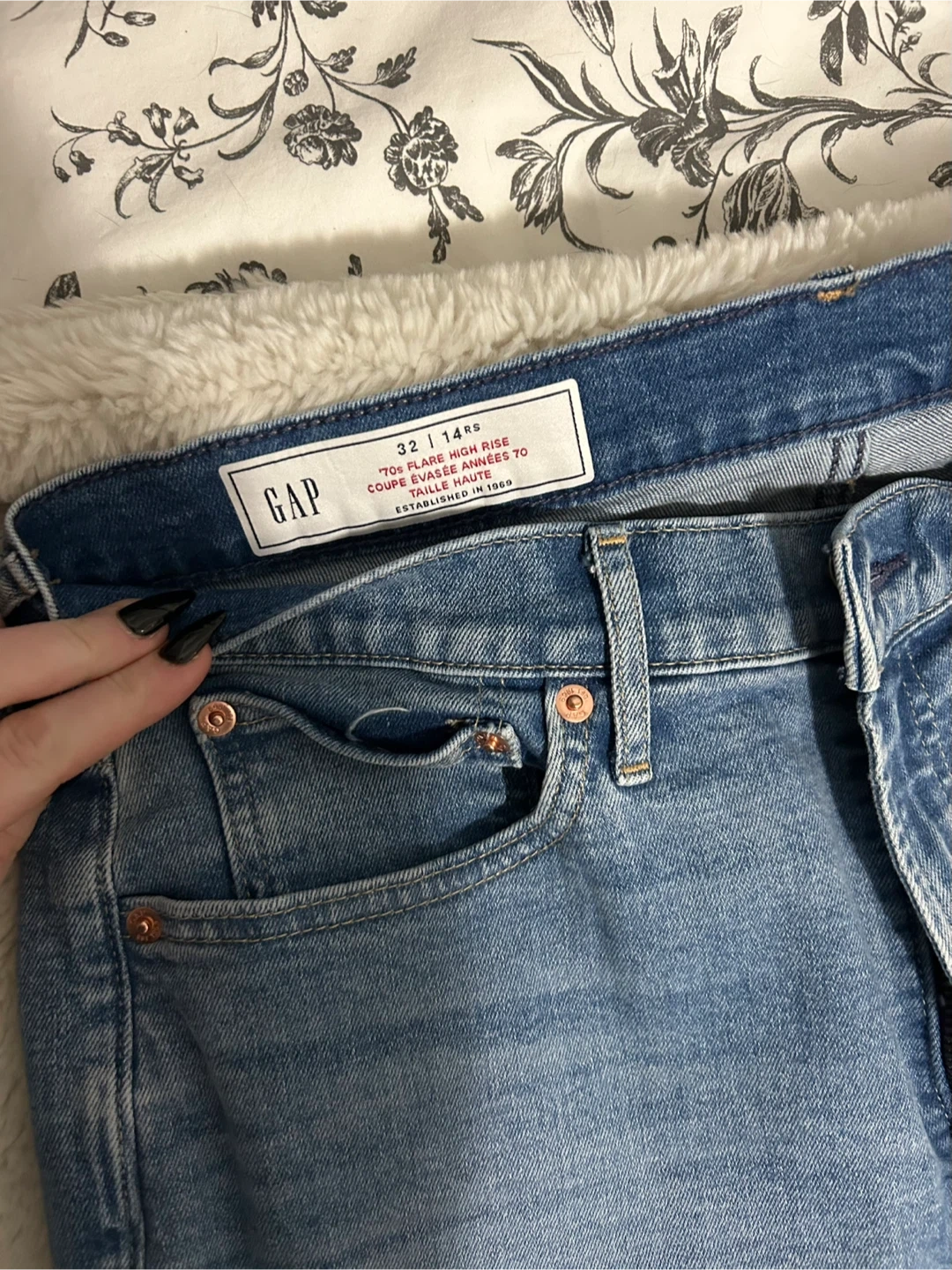 Selling a pair of Gap 70s Flare High Rise jeans in size 32. They are in great condition and ready for a new owner!