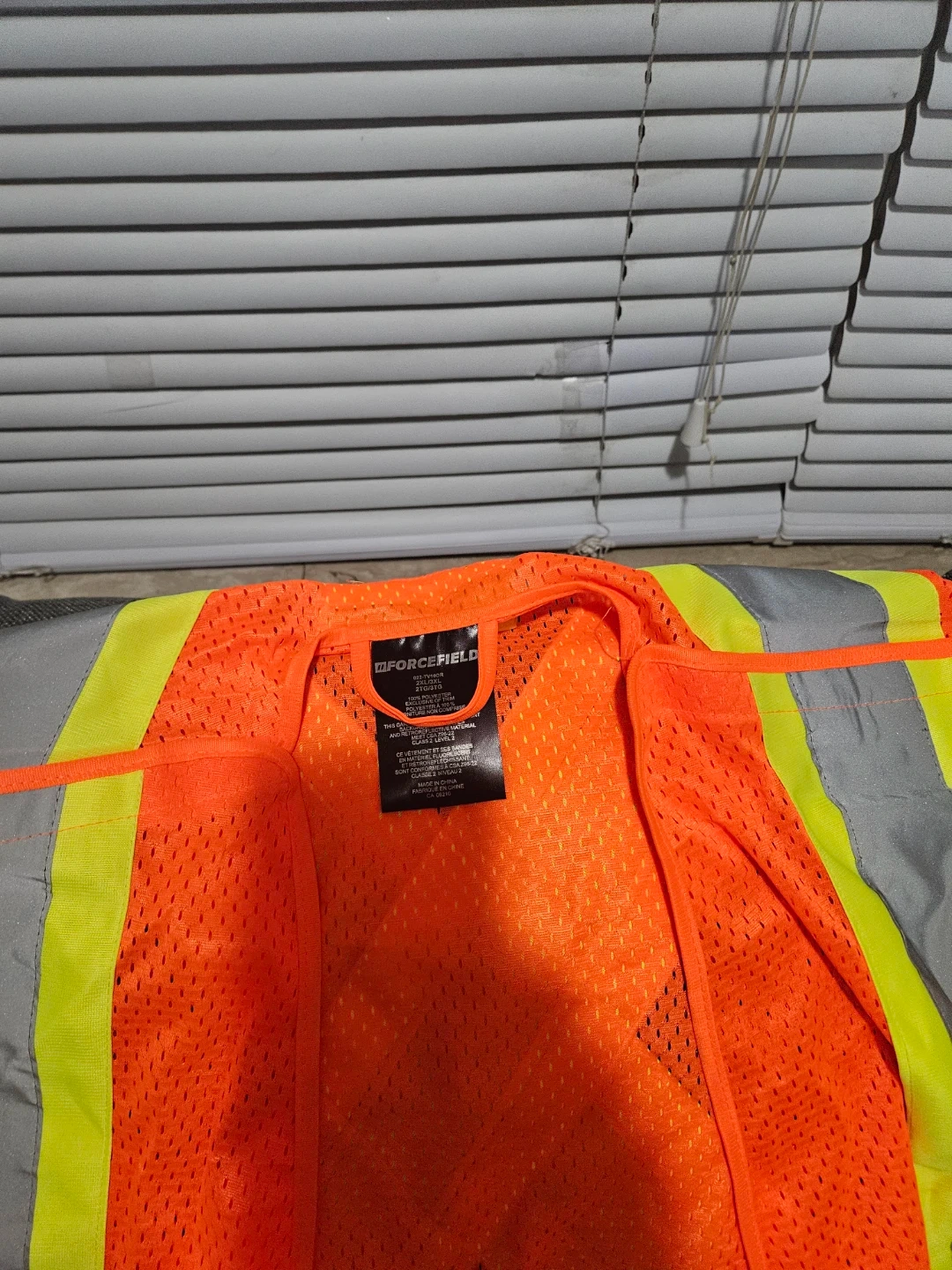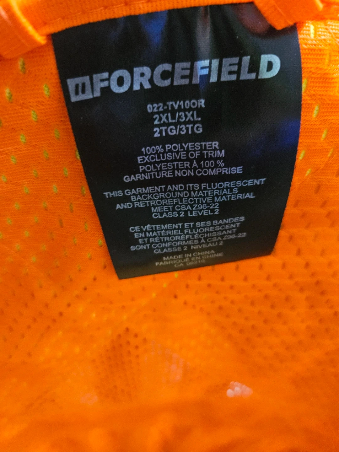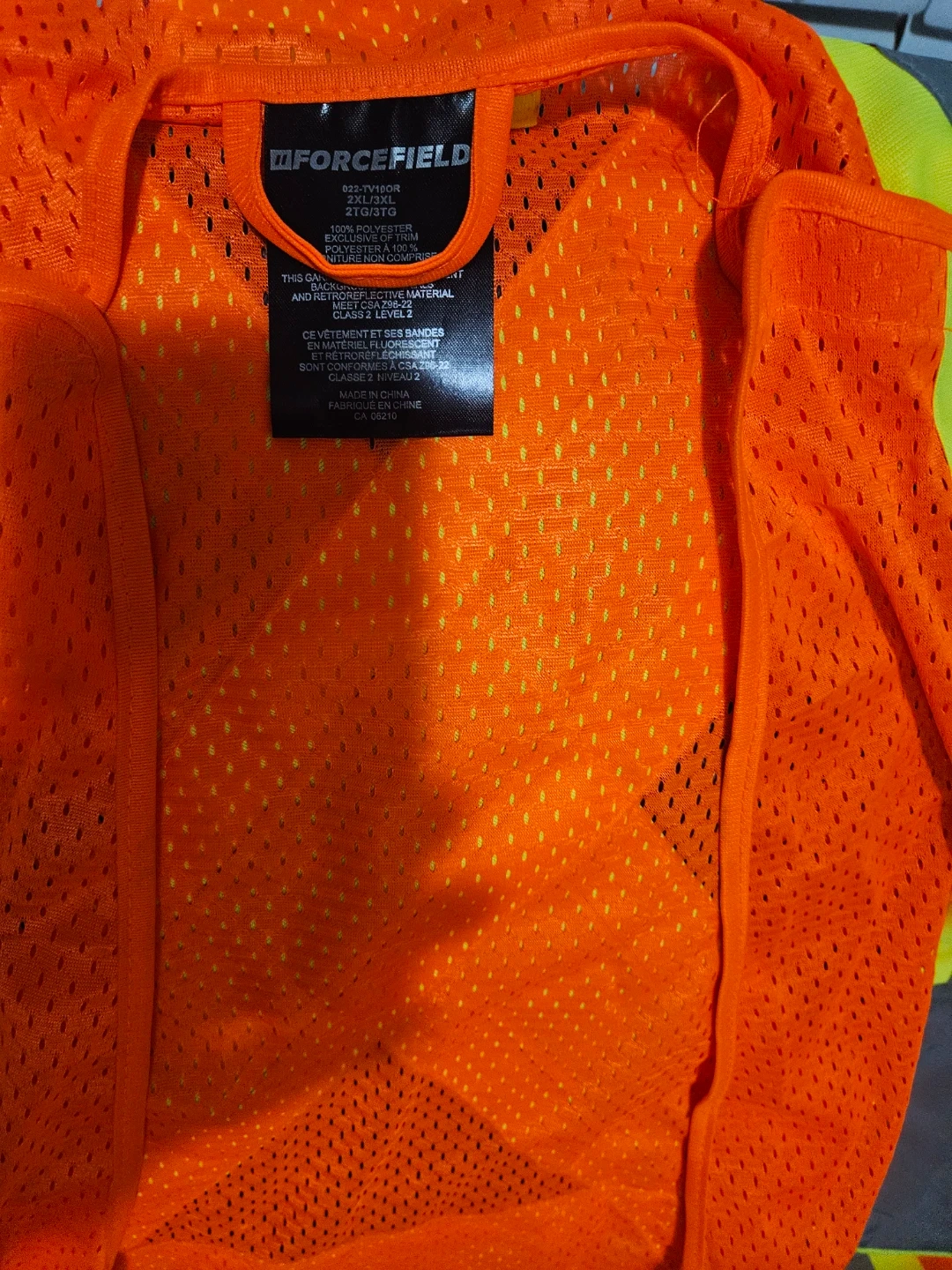 Selling a Forcefield safety vest in size 2XL/3XL. It's made of 100% polyester and features fluorescent background materials and retroreflective material. Perfect for staying visible on the job!