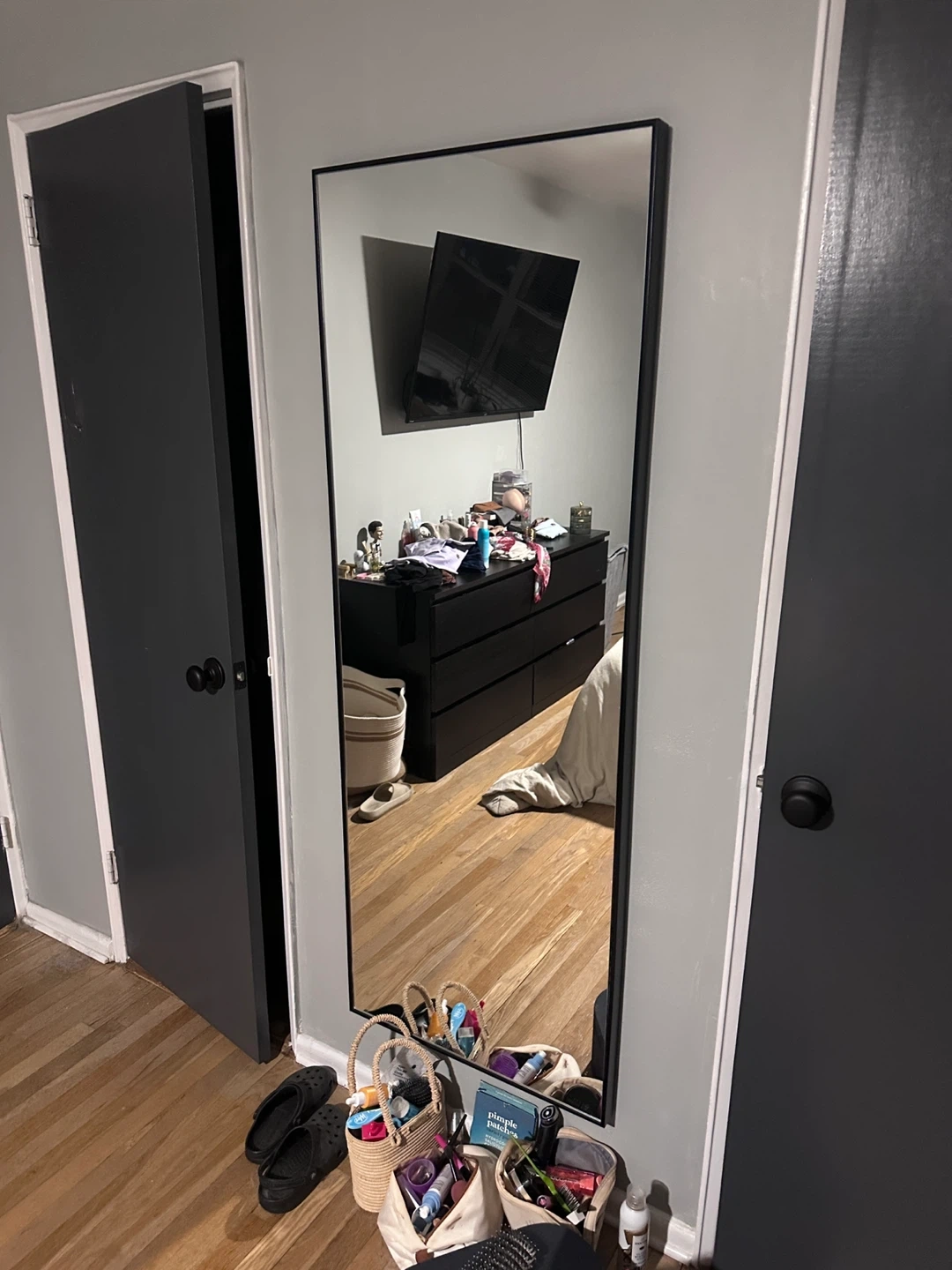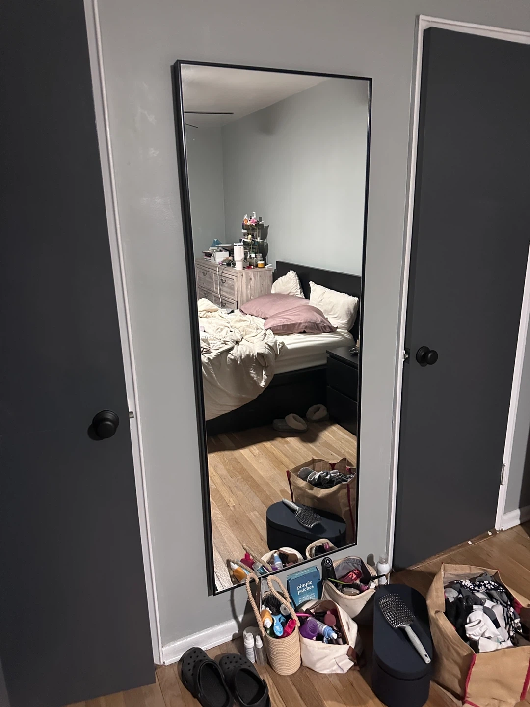 Selling a full length mirror. It's perfect for bedrooms or any space where you need a good view of your outfit. It's in great condition and ready to go!