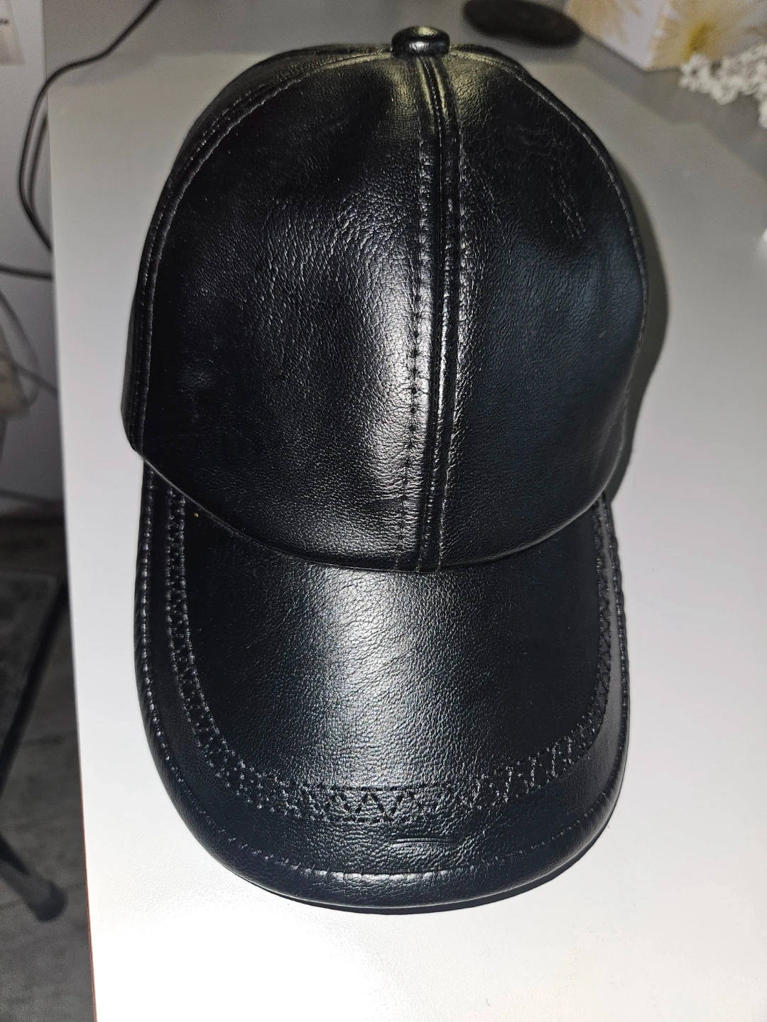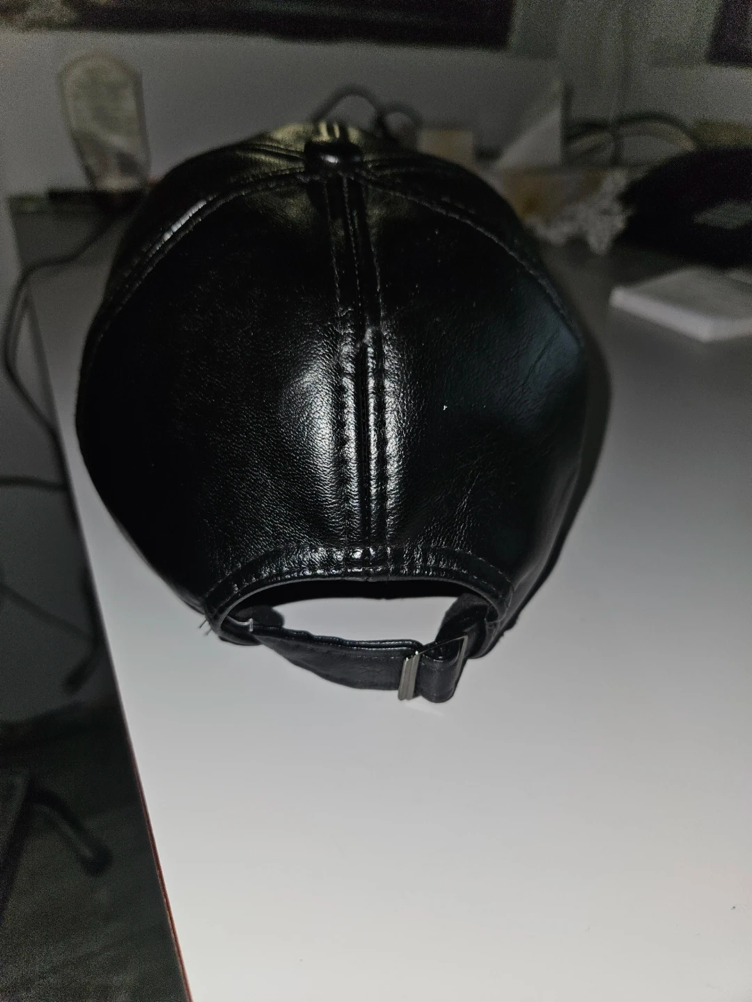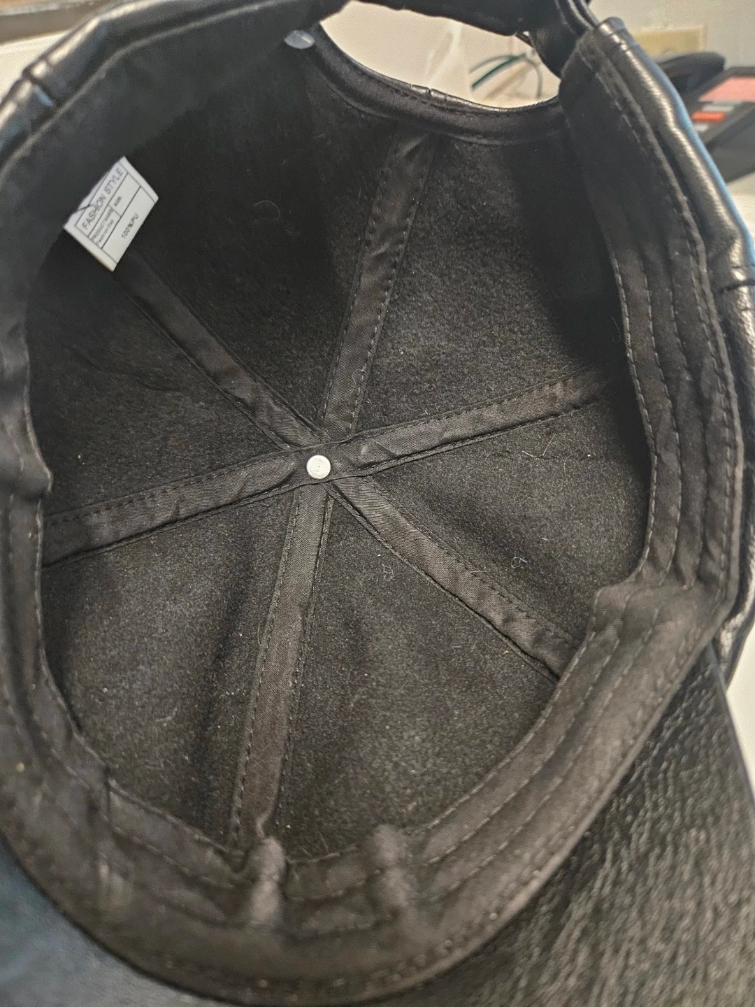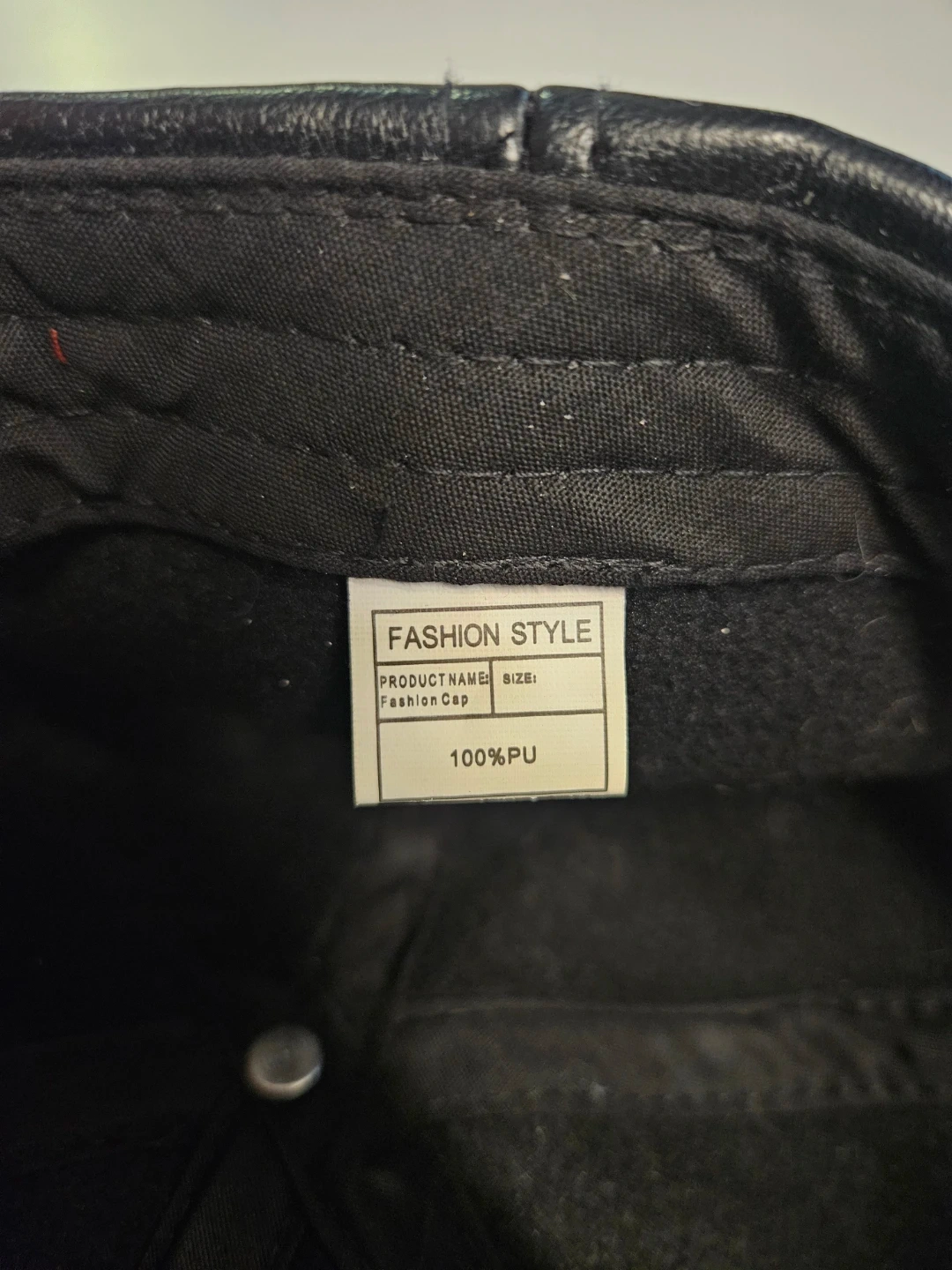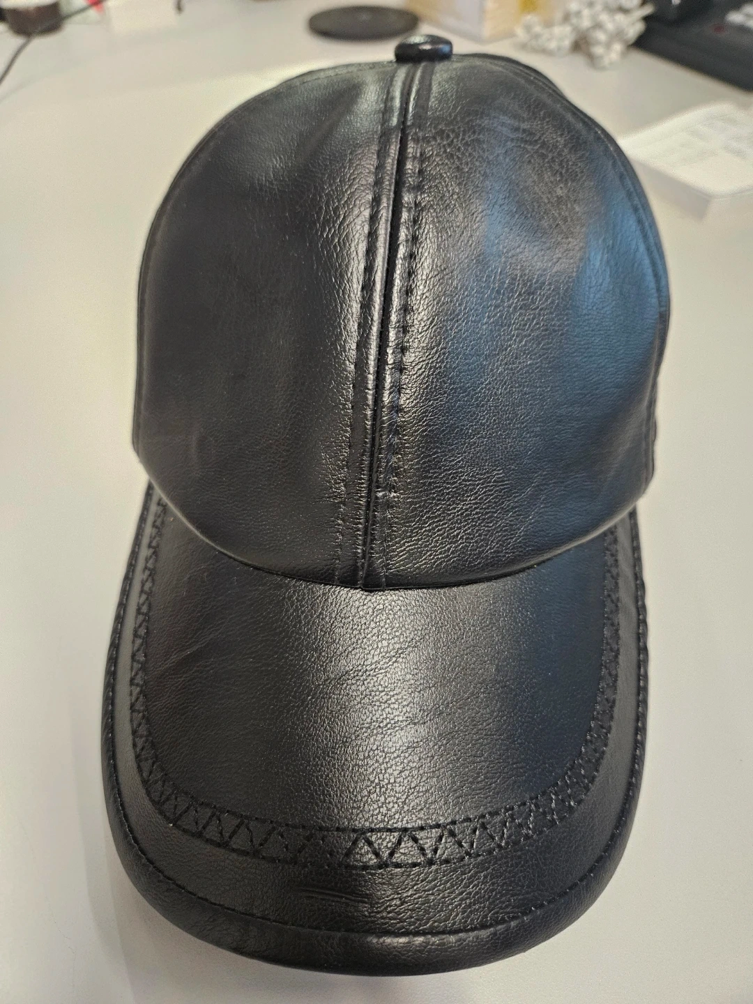 Selling a black leather baseball cap. It's in great condition and ready for a new owner! The cap has a classic design and an adjustable strap at the back for a comfortable fit