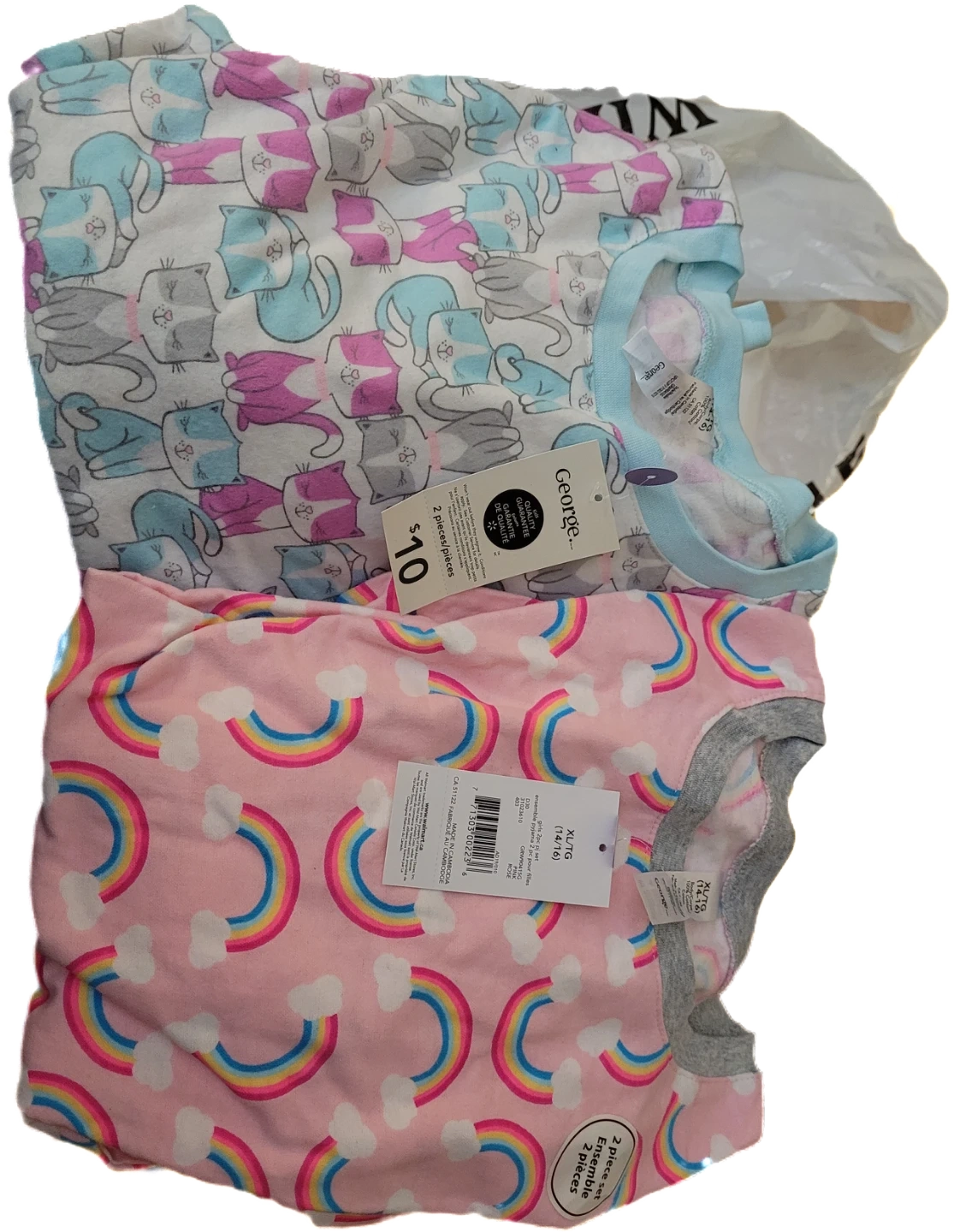 Selling a brand new 2-piece pajama set from George in size XL (14/16)! This includes two adorable sets, one with a cute cat pattern and the other with a rainbow design. The original price was $10 each. Selling 2 for $10 or $5 each.