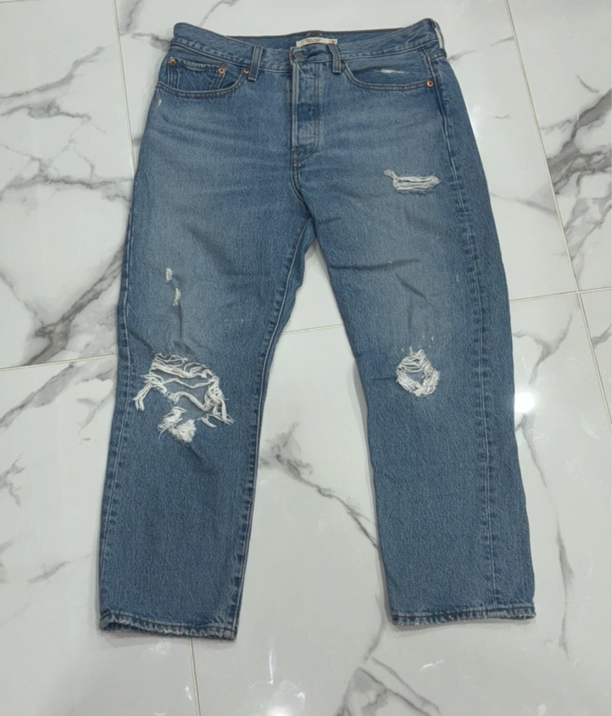 Levi's Wedgie Straight jeans in size 30. These jeans are in good condition and feature a classic light wash denim. There are some distressed areas and rips for a trendy look. Perfect for casual wear!
