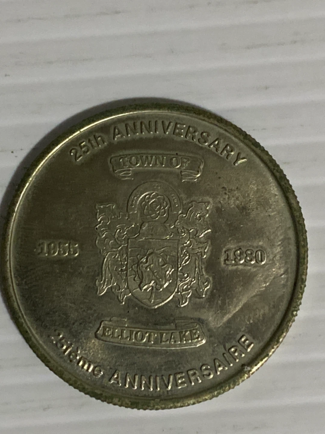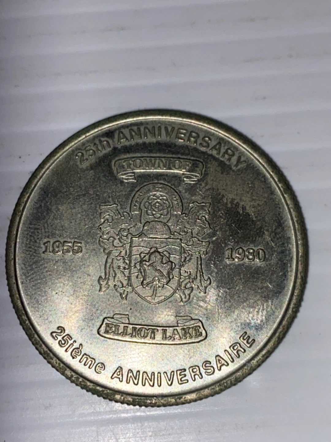 Selling an Elliot Lake 25th Anniversary coin. It commemorates the town's anniversary from 1955 to 1980. A unique piece for collectors interested in Canadian history and numismatics