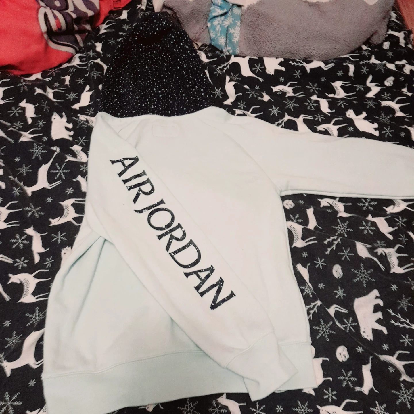 Selling a Nike Air Jordan hoodie! It's in great condition and has a cool design. The sleeves have 'AIR JORDAN' printed on them, and the front features the Nike Air logo. It has a hood and a front pocket too!