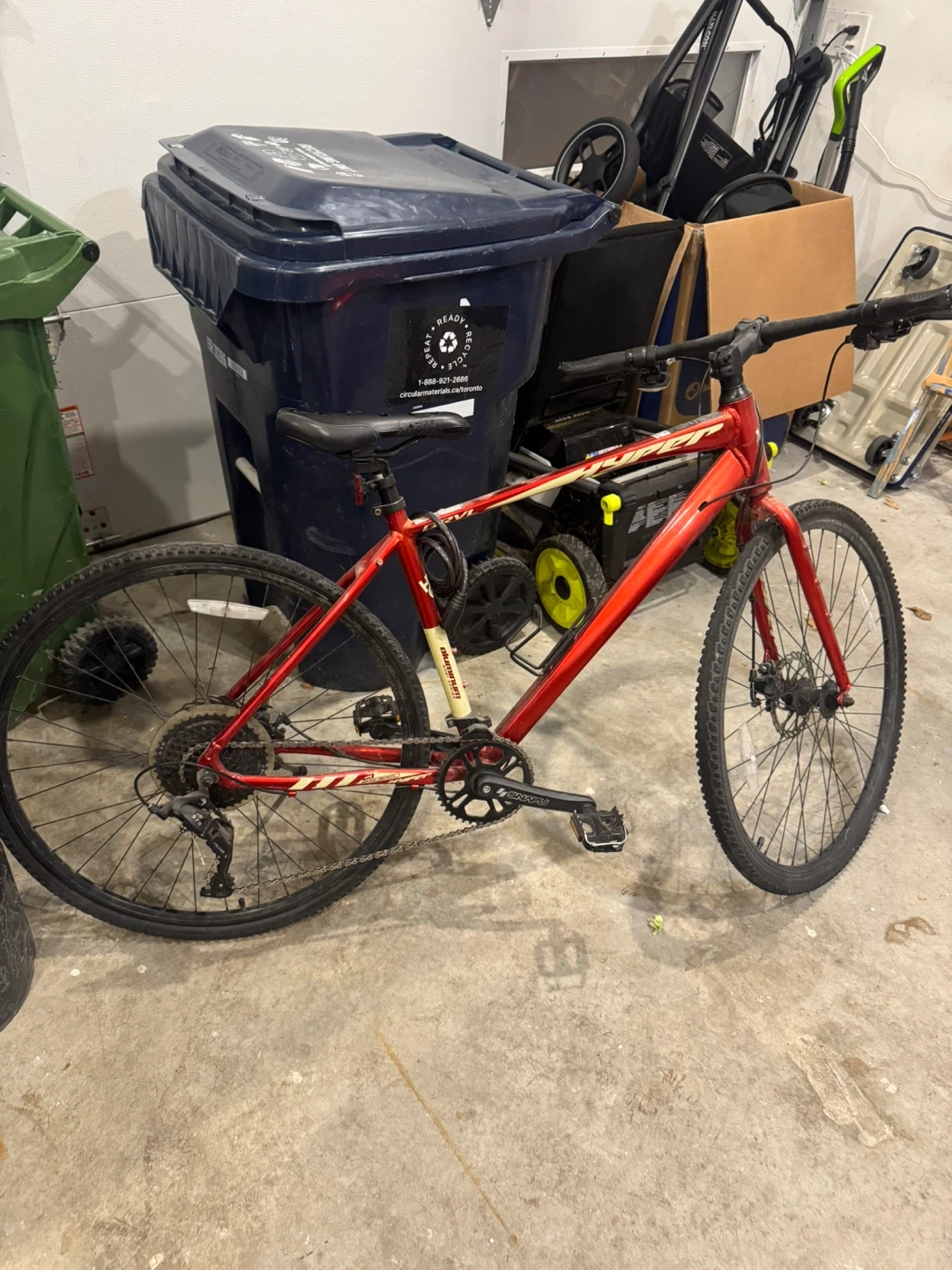 Selling a red Hyper bicycle. It's in good condition and ready for a new owner. The bicycle has been well-maintained and is perfect for commuting or recreational rides