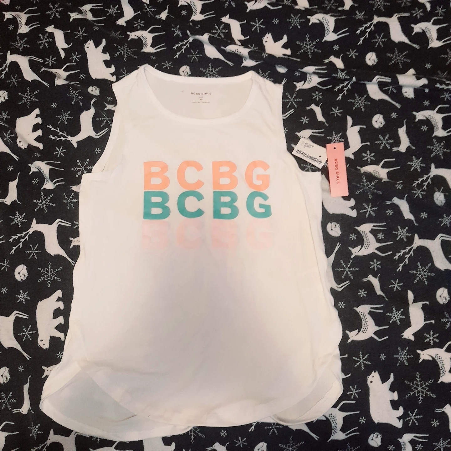 Selling a BCBG Girls white tank top in size M. Its new with tag and features the BCBG logo in a fun, colourful print. Perfect for everyday wear!