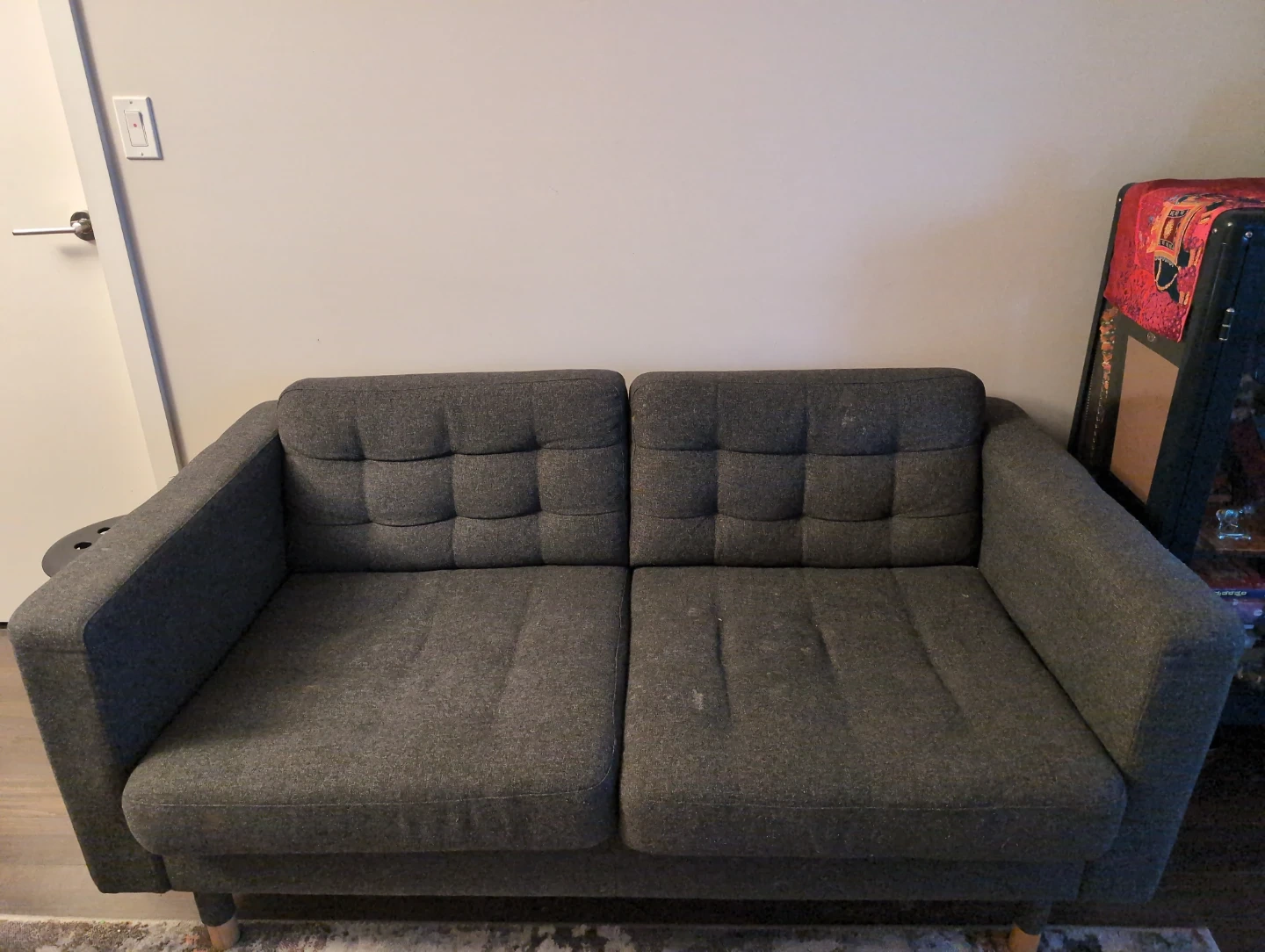 Selling a cozy grey loveseat sofa! It's in good condition and would be perfect for a small space or apartment. It has a modern, tufted design that would fit in with any decor. There are some signs of use.