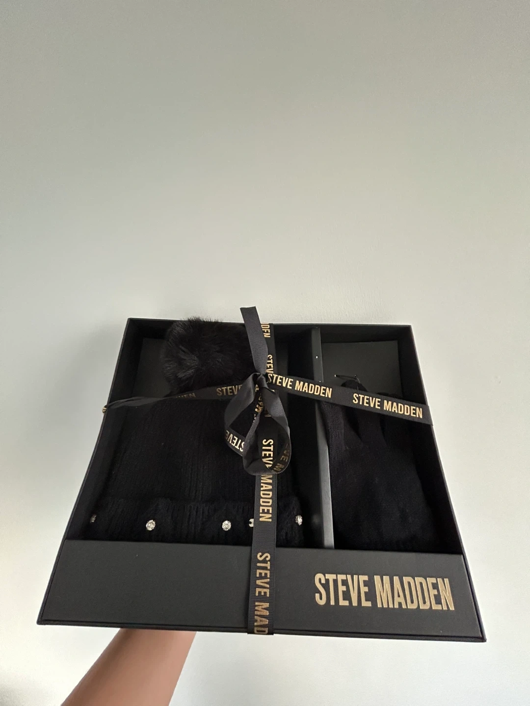 Selling a brand new Steve Madden hat and gloves set! It comes in the original box, perfect for gifting or keeping yourself cozy. The set is black and features a stylish design. Originally bought for $24.98