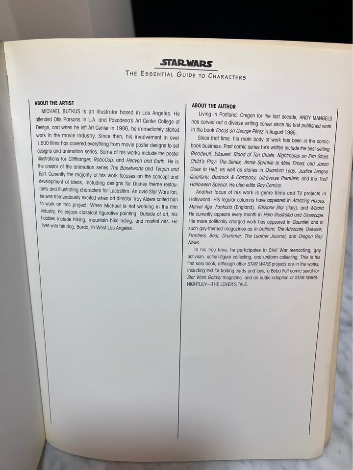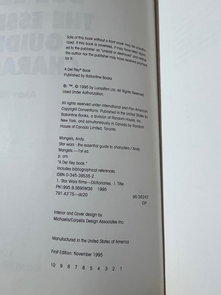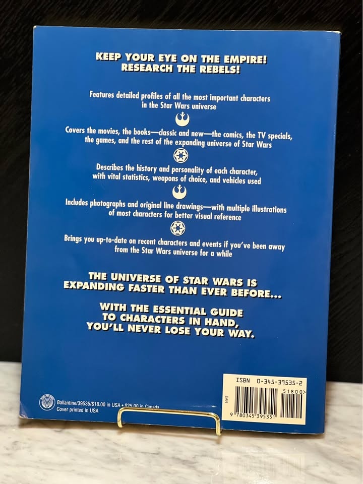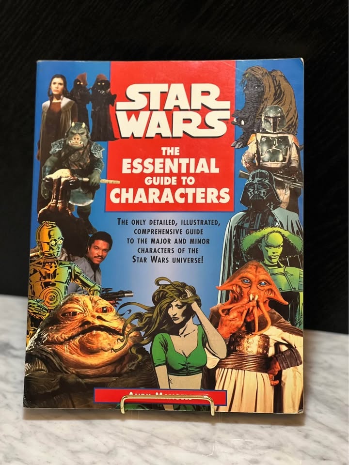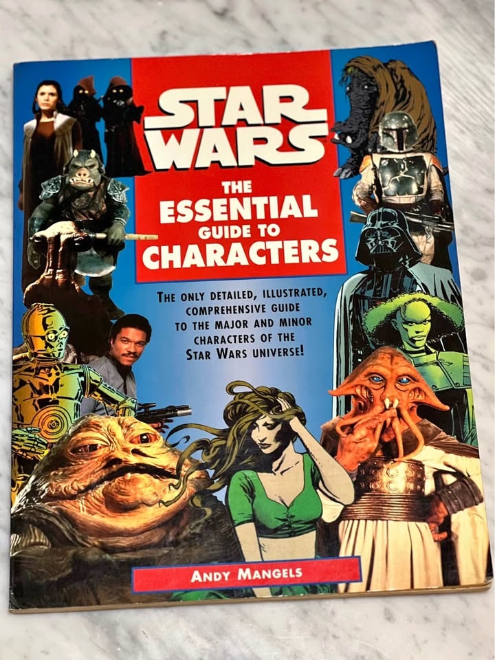 The original 1995 edition of Star Wars: The Essential Guide to Characters by Andy Mangels. This reference book provides detailed profiles and illustrations of over 100 characters from the Star Wars universe, covering characters from the movies, books, comics, and games in the expanded universe.
