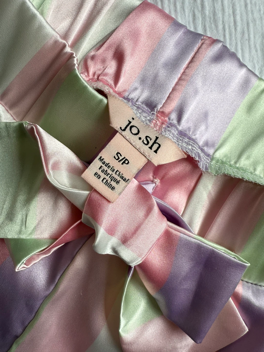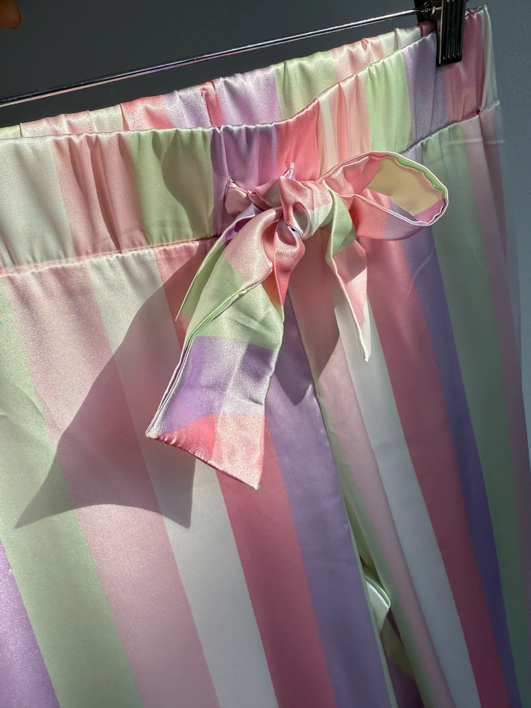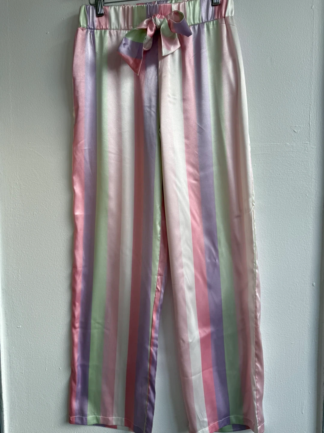 Satin lounge pants super cute and stylish! They feature a fun striped pattern in pastel colours and a cute tie at the waist. Size small. Perfect for tea 🫖 day !