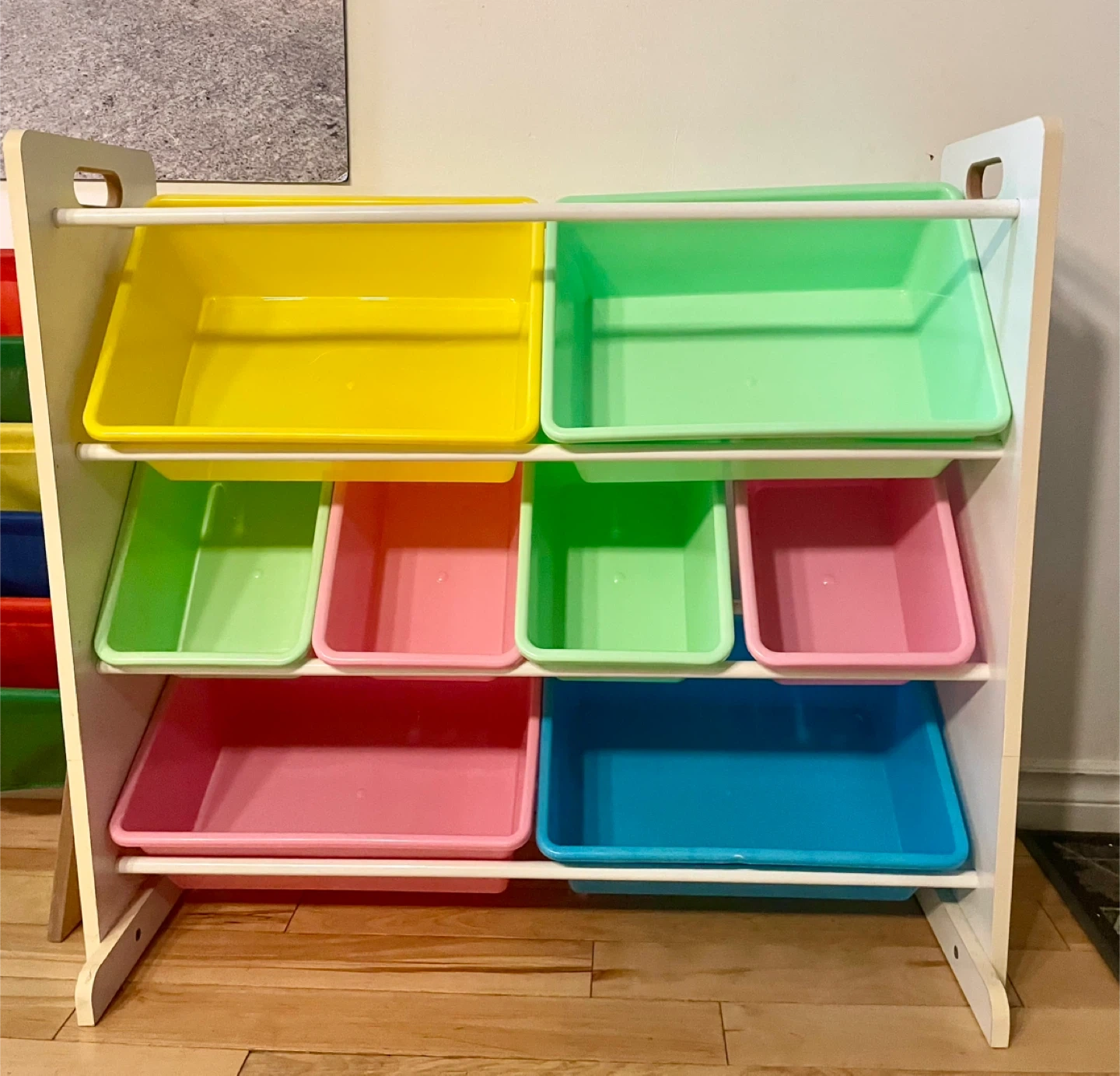 Declutter your little one's play area with this colourful toy storage organizer! It features multiple bins in various colours like yellow, green, pink, and blue. Perfect for keeping toys, books, and art supplies neatly organized and easily accessible