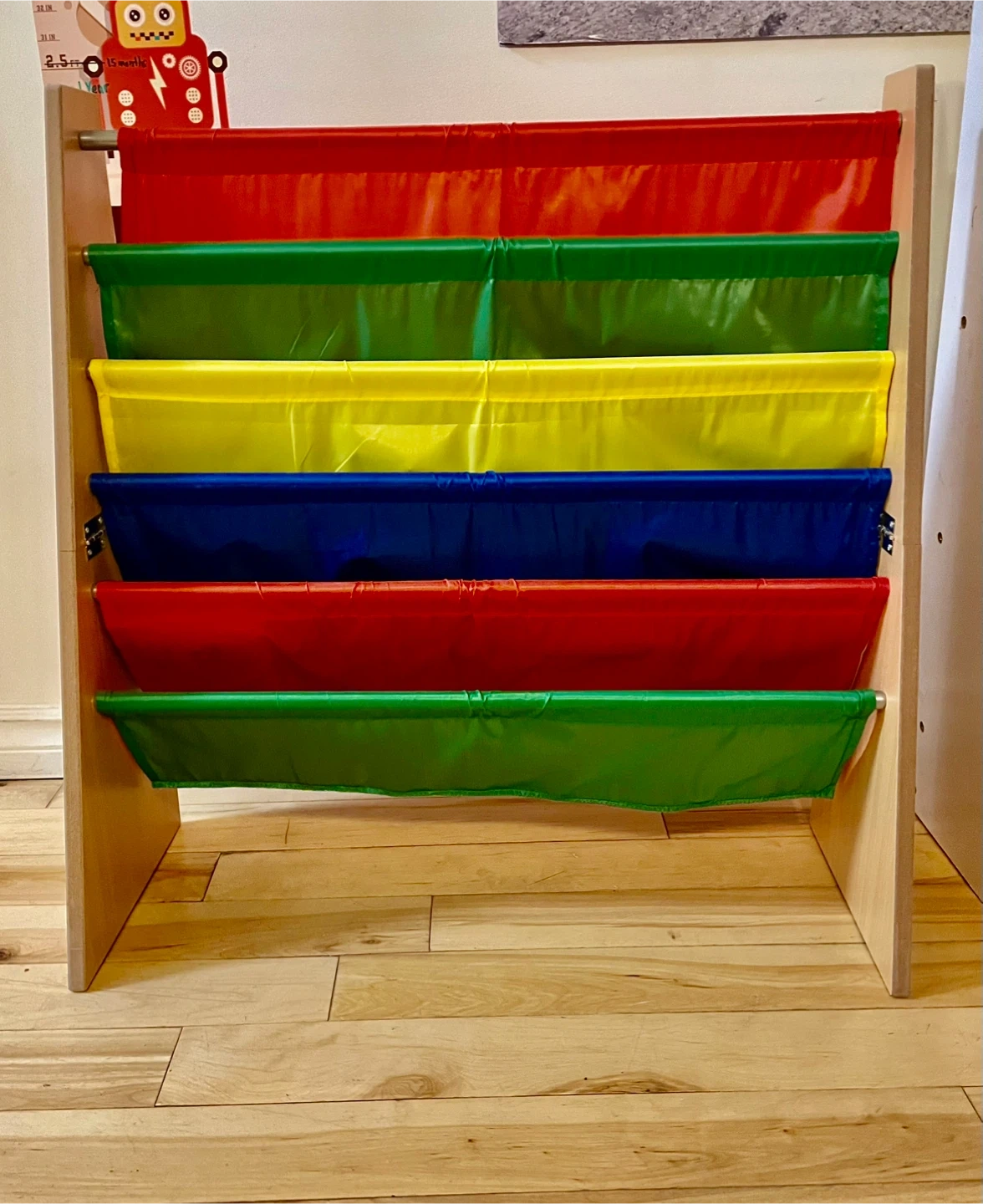 Here's a super handy book rack for kids! It has colourful storage bins that make organizing books a breeze. Perfect for a playroom or bedroom to keep things tidy and fun