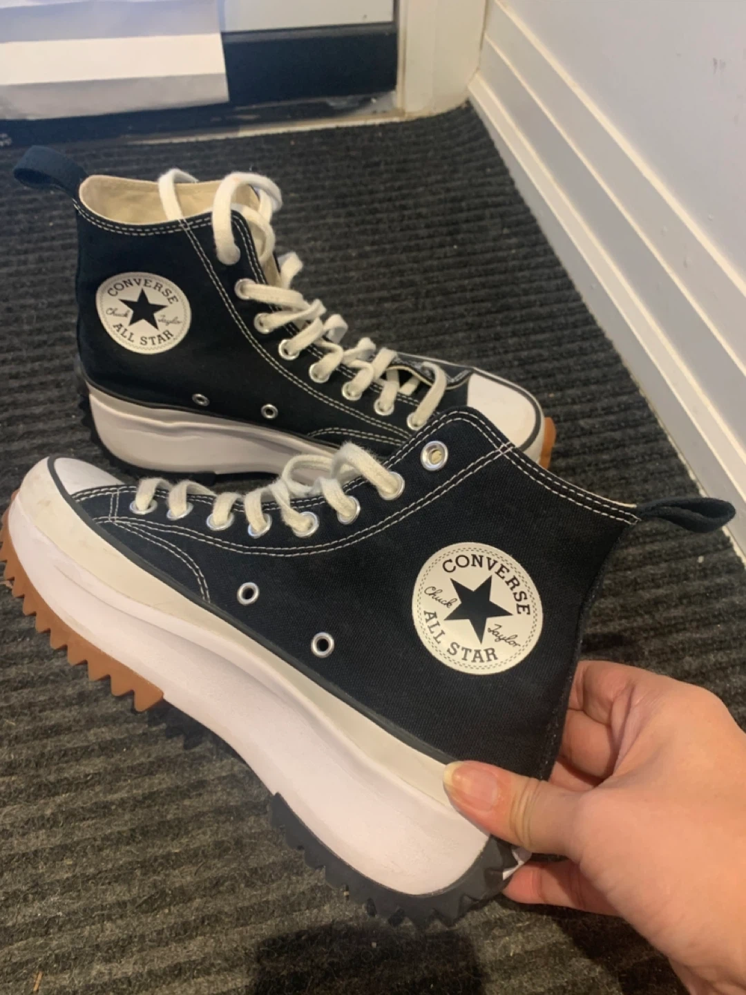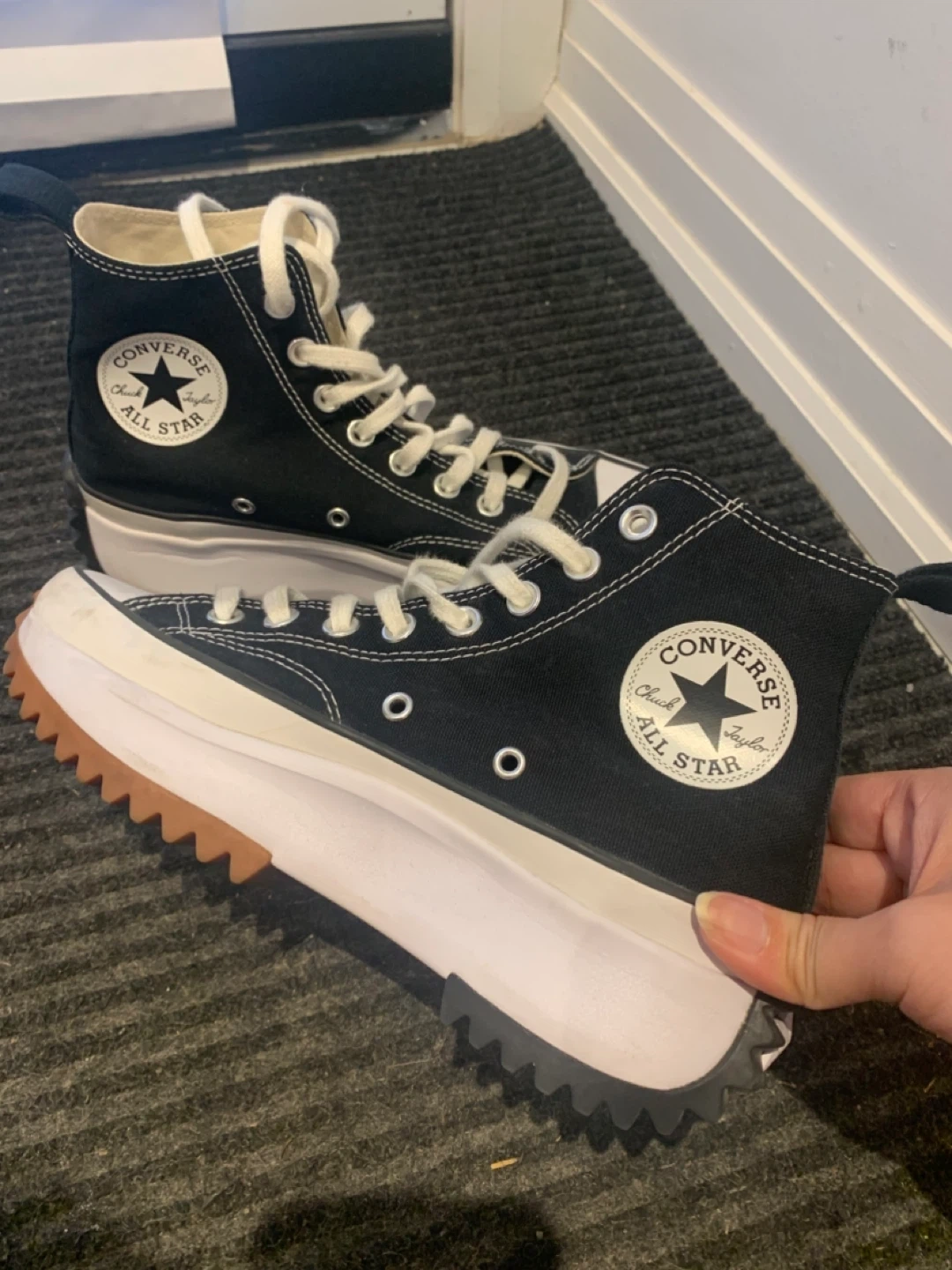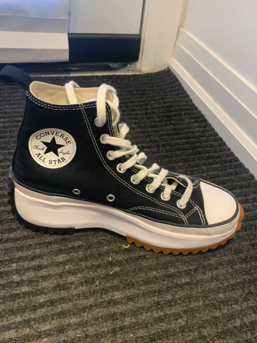 Selling a pair of Converse Chuck Taylor All Star Run Star Hike sneakers in women's size 8 (US). These have a unique platform sole and are in great condition. They are black and white with a rubber outsole.