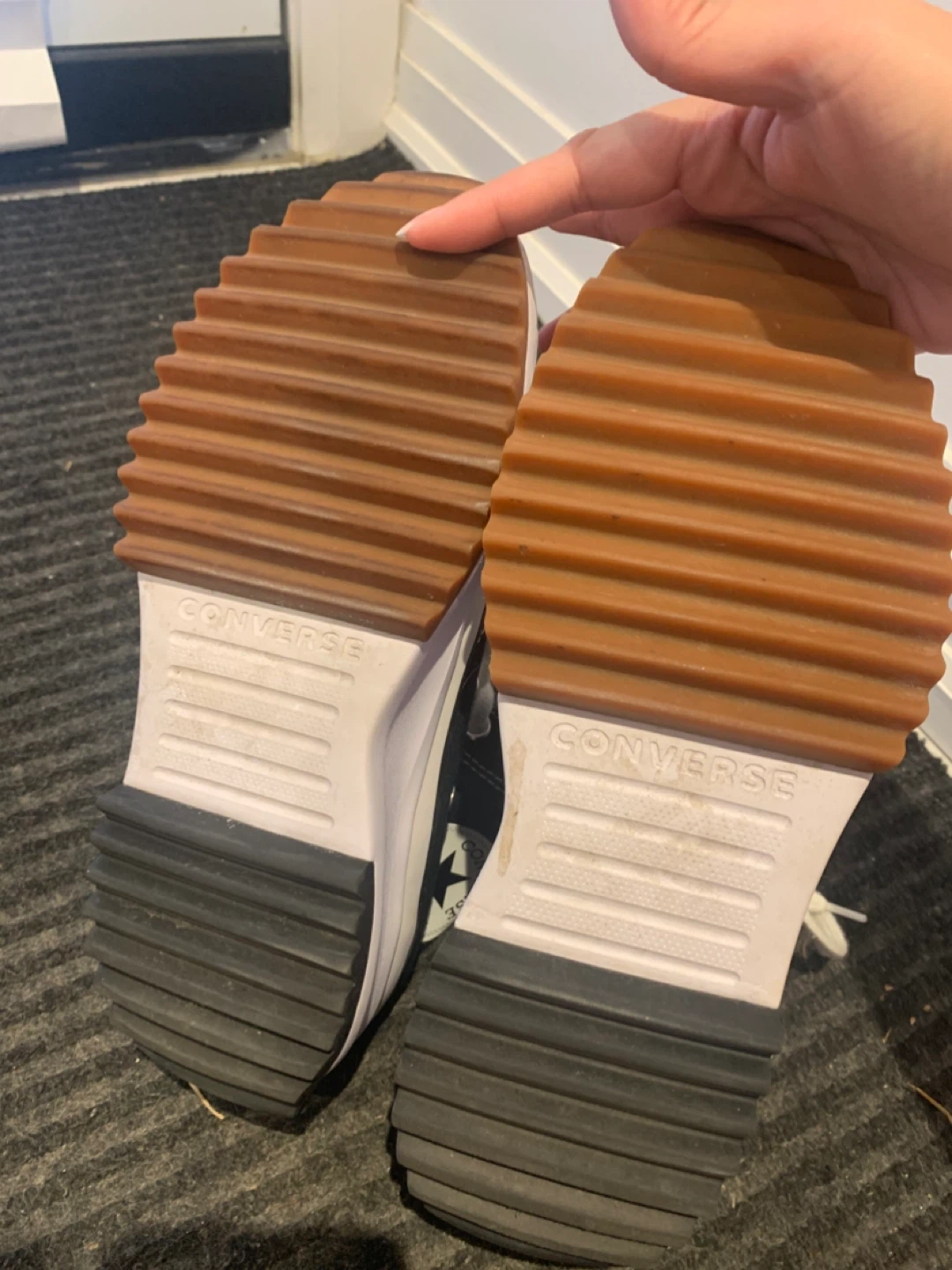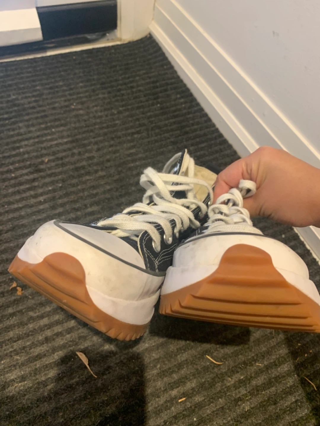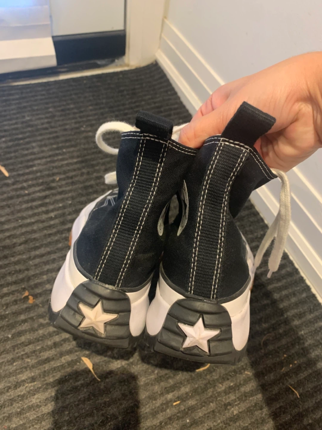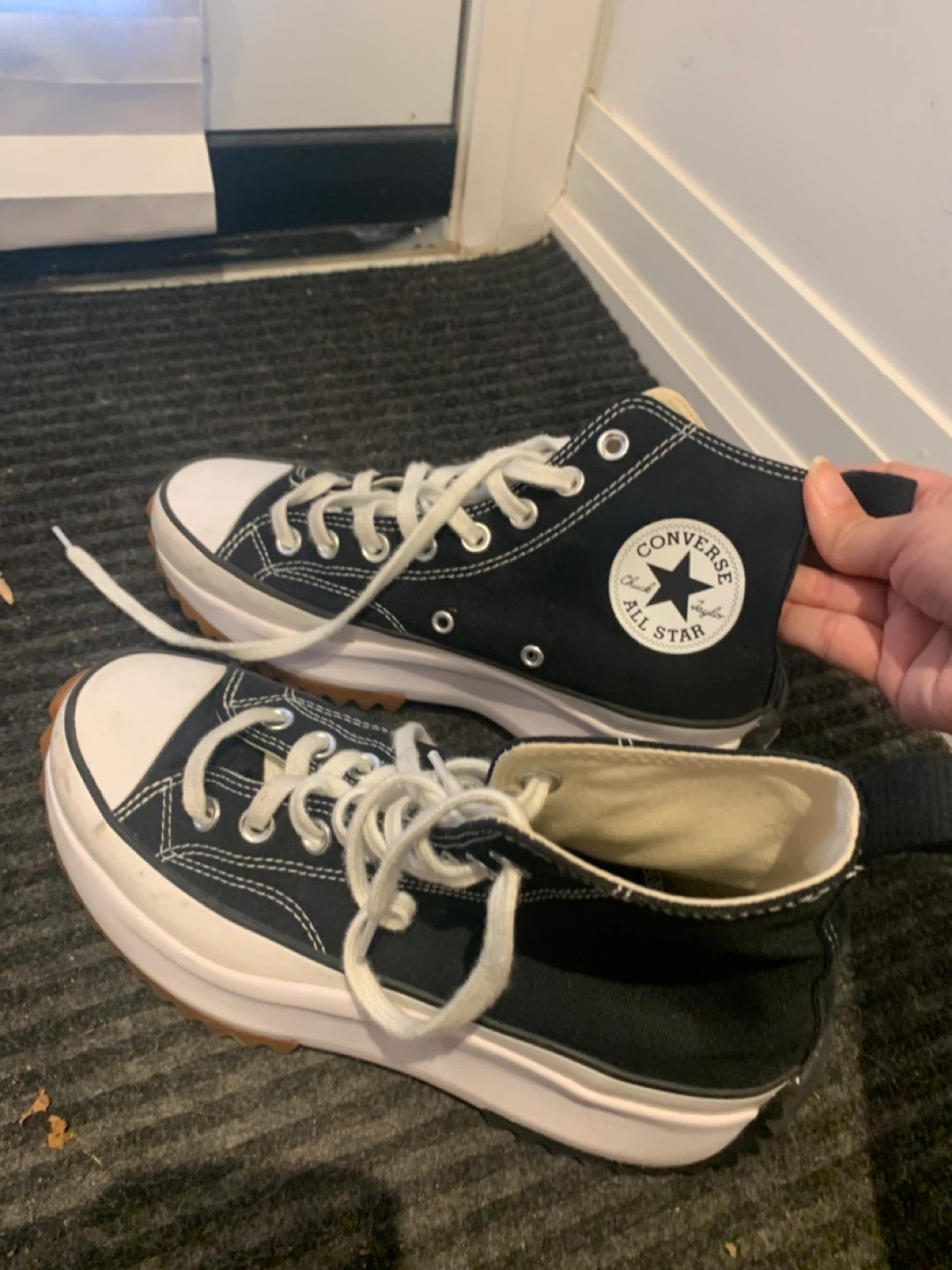 Selling a pair of Converse Chuck Taylor All Star Run Star Hike sneakers in women's size 8 (US). These have a unique platform sole and are in great condition. They are black and white with a rubber outsole.