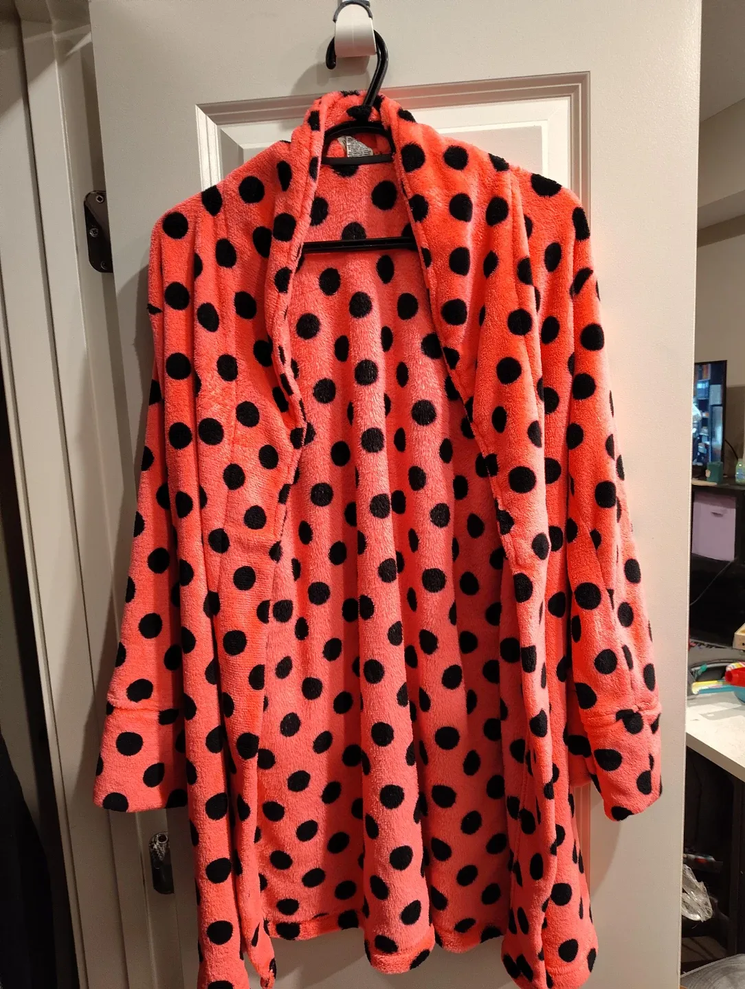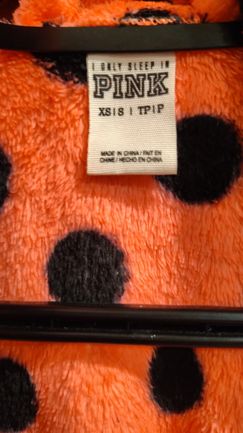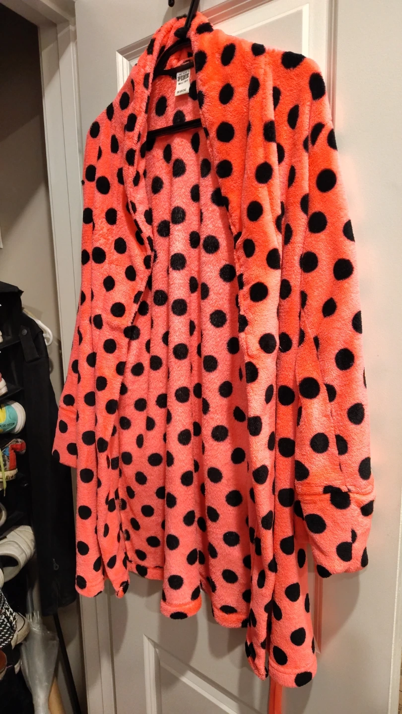 Cozy Victoria Secret PINK robe in size XS! Fits a bit big so would probably fit a small maybe even a medium just might be a bit short on a medium! The bright pink colour with black polka dots is so fun. It's super soft and perfect for lounging around the house. Only worn twice, original price is double. OBO