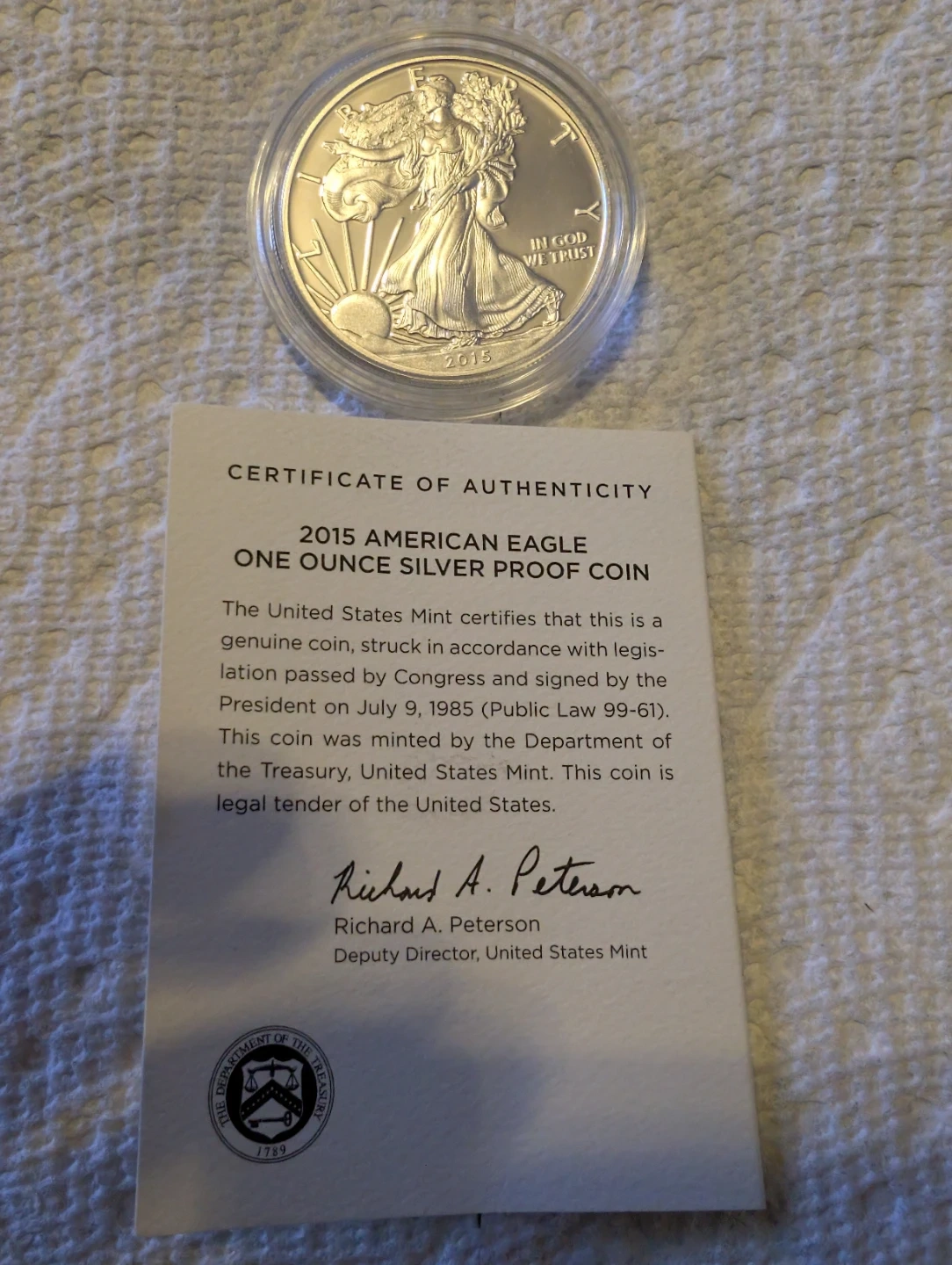 Selling a 2015 American Eagle One Ounce Silver Proof Coin! This coin is 99.9% silver and comes with its certificate of authenticity. Condition New , Finish - Proof , Composition - 99.9 Silver , Content Silver 0.999 Troy once ( 31.072 grams ) Mint Vest Point .