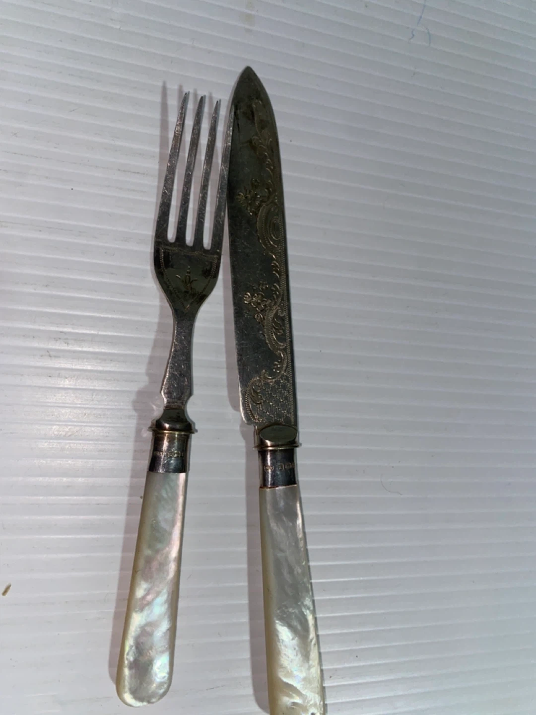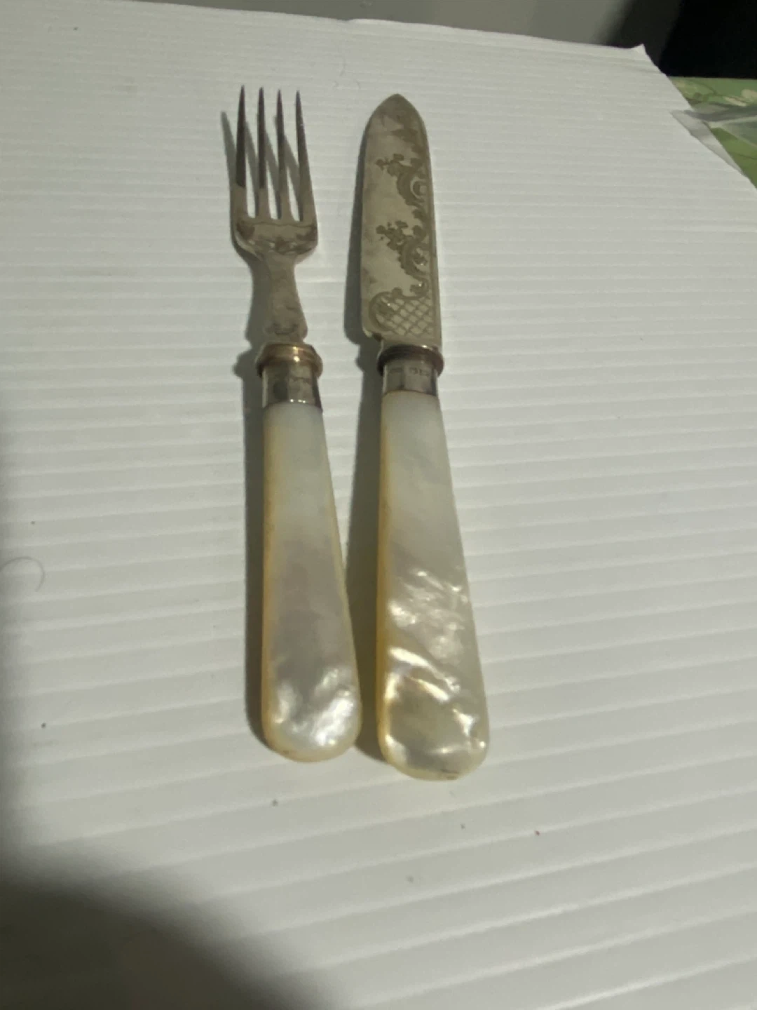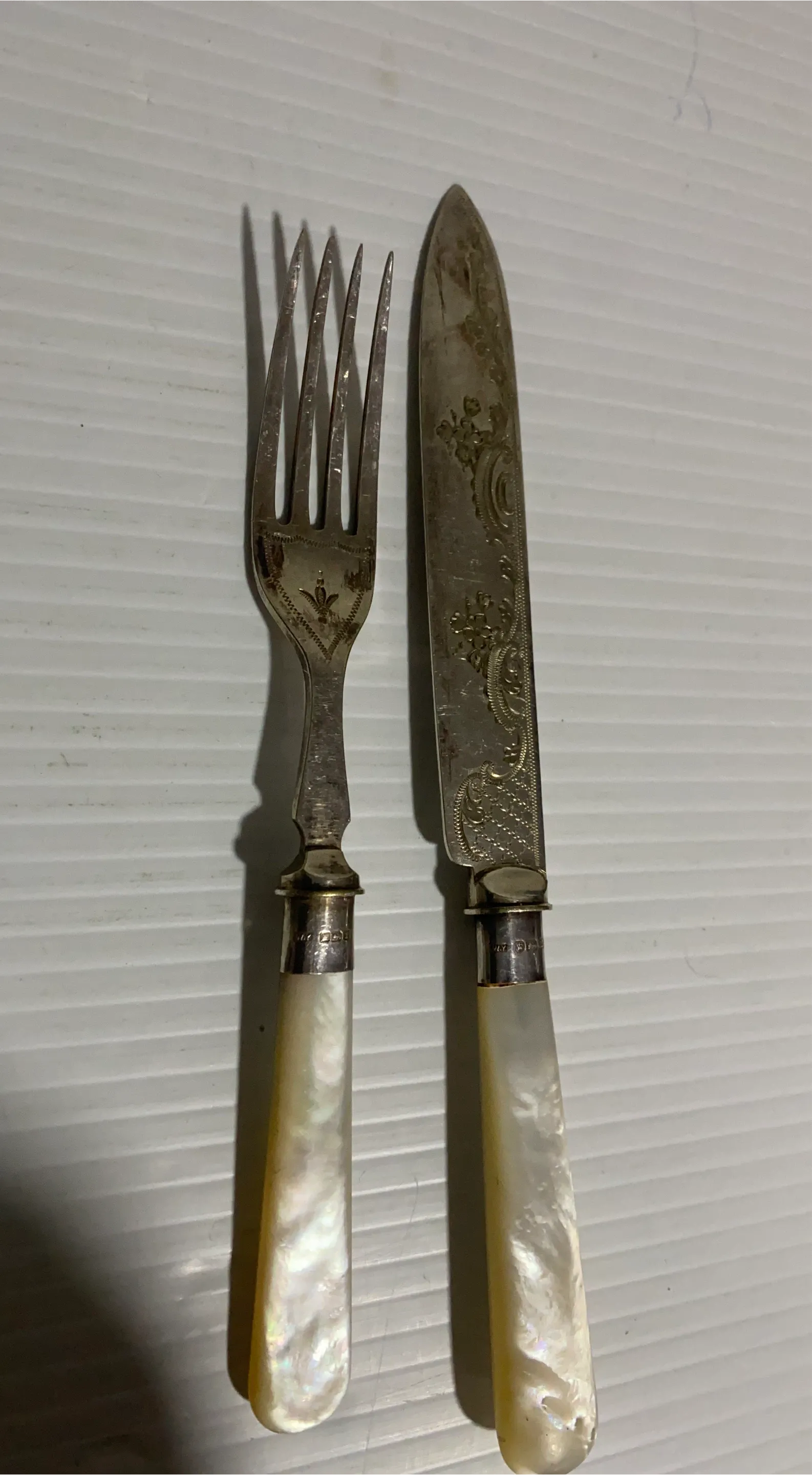 Selling a vintage silver plated fork and knife set. They have a beautiful, intricate design and mother of pearl handles. Perfect for adding a touch of elegance to your dining table!