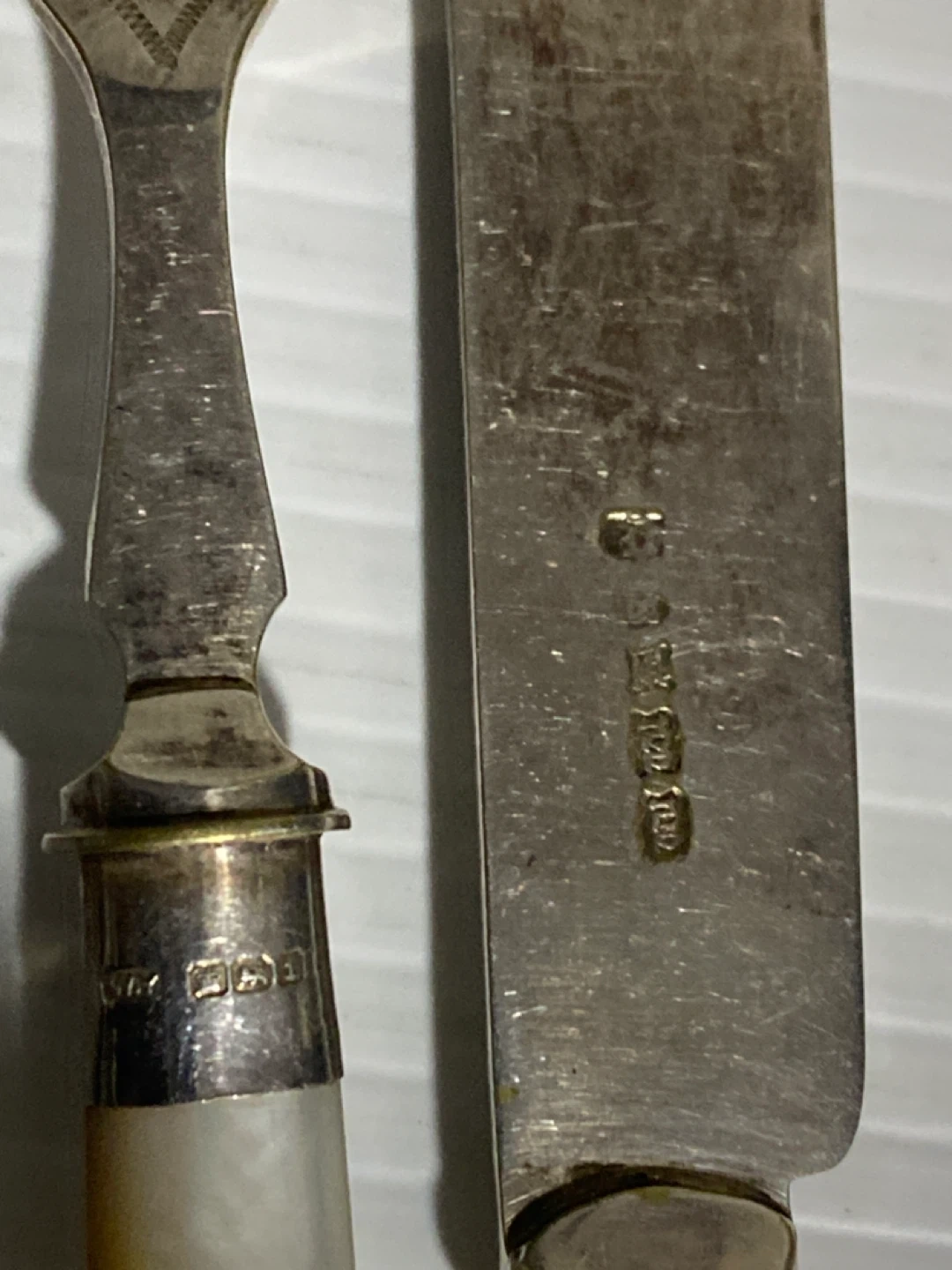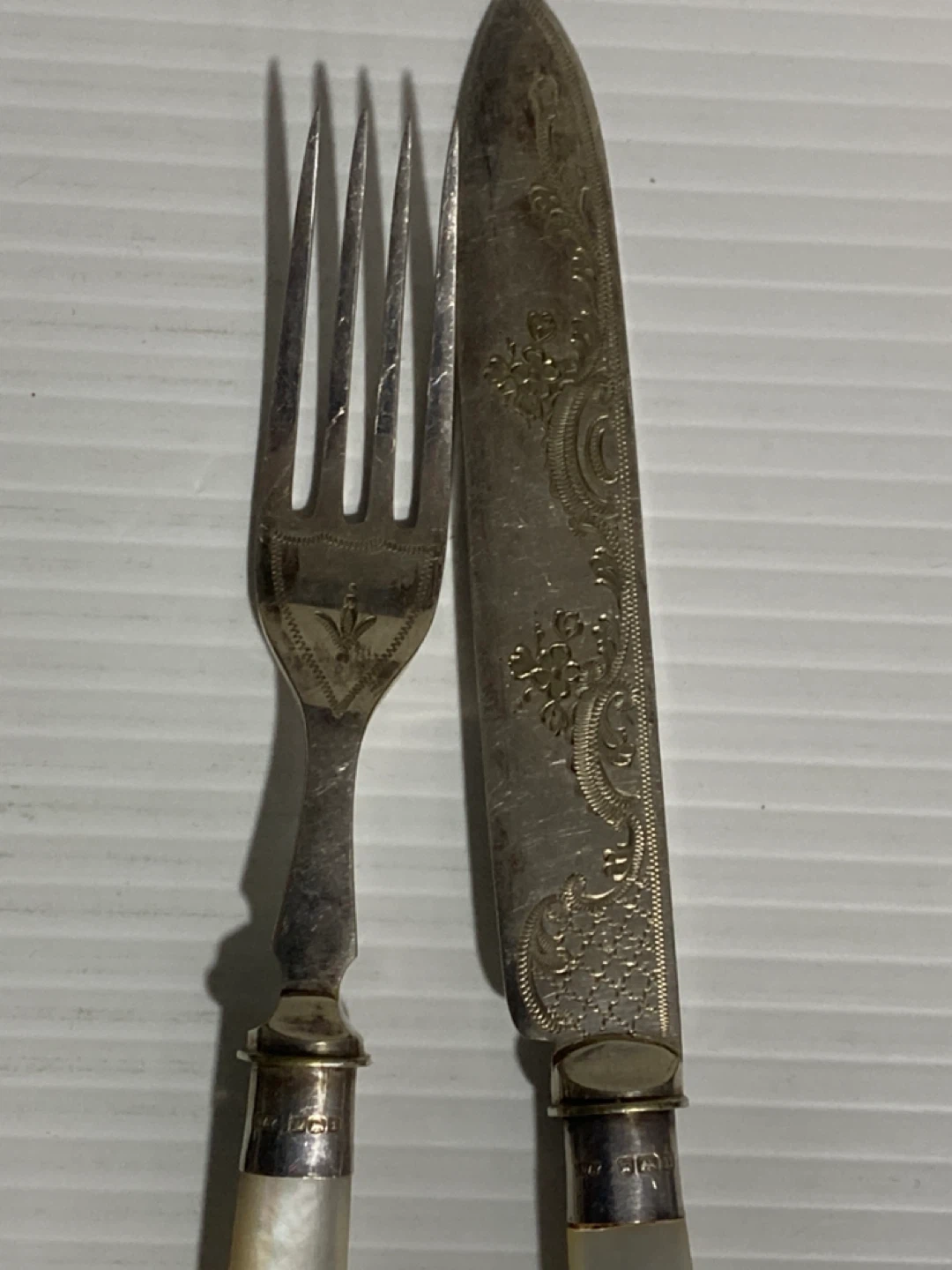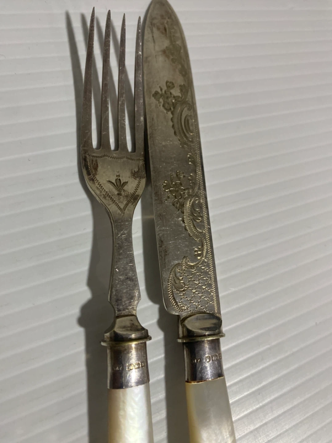 Selling a vintage silver plated fork and knife set. They have a beautiful, intricate design and mother of pearl handles. Perfect for adding a touch of elegance to your dining table!