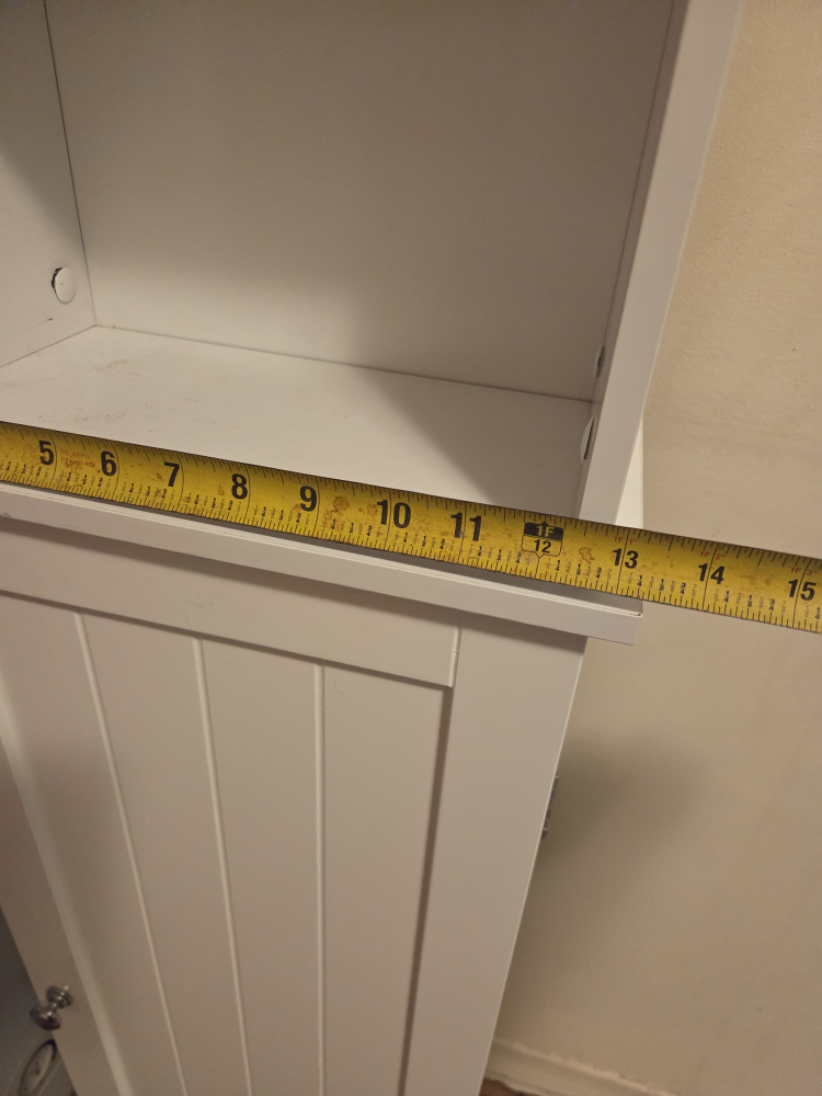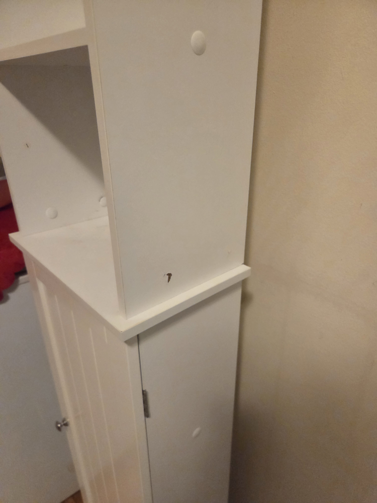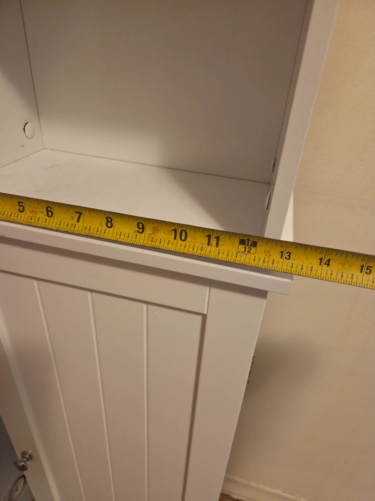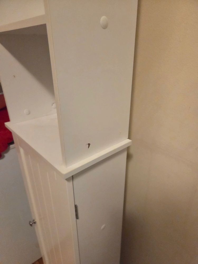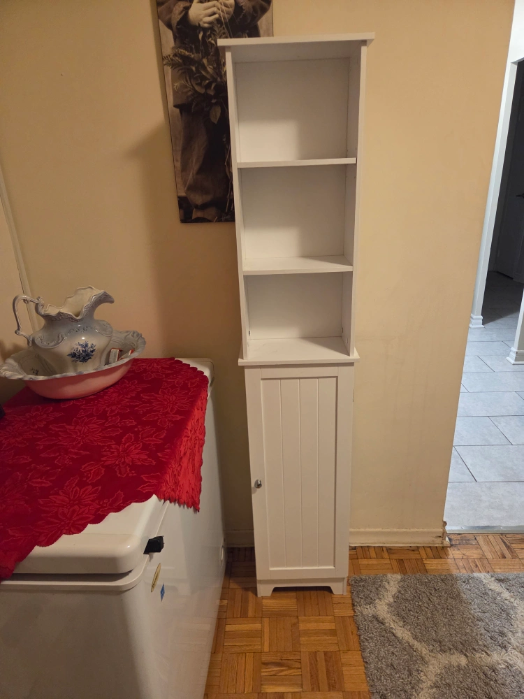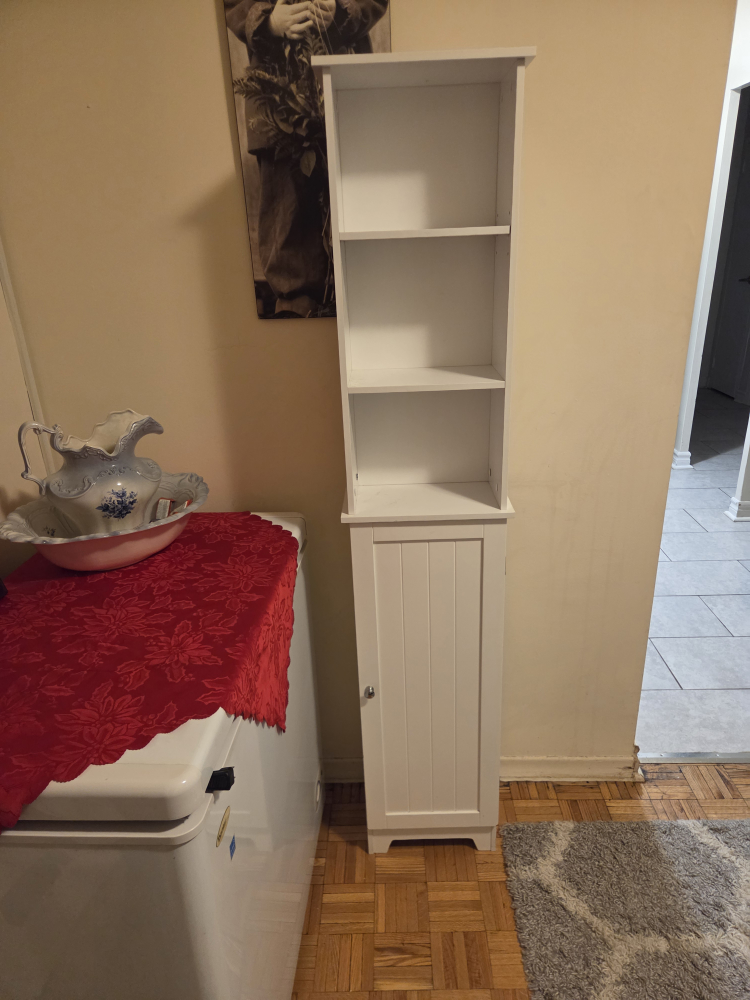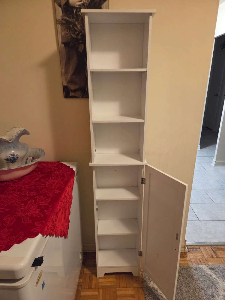 Selling a white bathroom shelf cabinet. It's in good condition and measures approximately 65 inches tall and 14 inches wide. Great for adding extra storage to a small space!